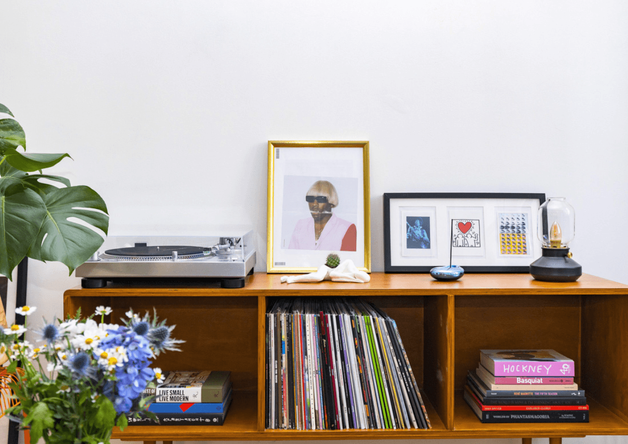 Oblíbeným rituálem je ranní či večerní relax na gauči při poslechu gramofonu. Sbírání vinylových desek od milovaných interpretů je doslova závislost. Nejde zkrátka přestat. Velké díky kamarádovi Matějovi Bujnochovi, který mi vyrobil dřevěnou komodu na vinyly. Poslední dobou také začínám sbírat výběrové knihy dle mého gusta z oblasti jako je fotografie, umění, móda nebo právě interiérový design.