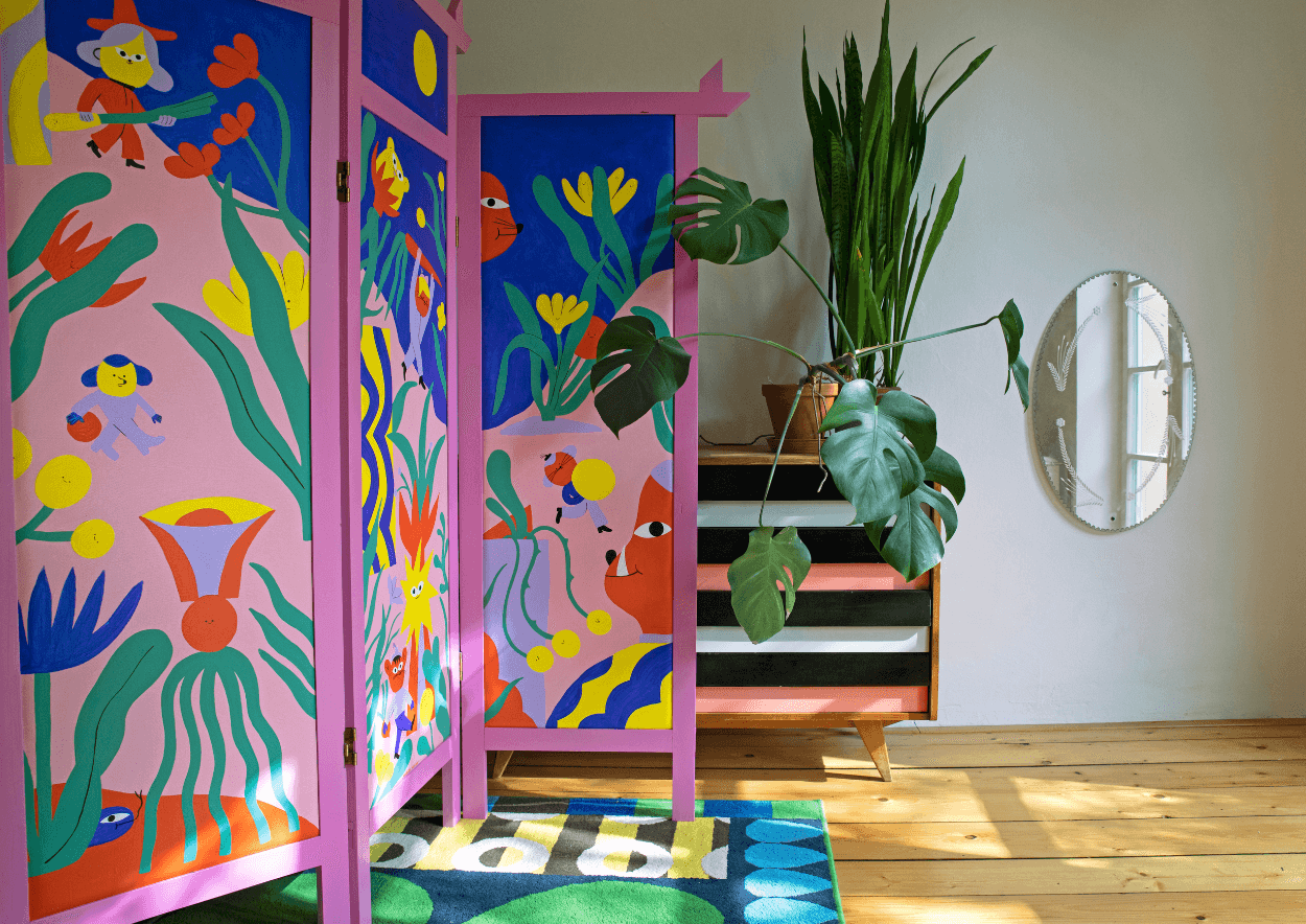 Původní paravan z 60. let, jehož plátna byla přetvořena jednou z nejvýznamnějších českých ilustrátorek Barborou Idesovou. Foto: Michaela Karásek Čejková.