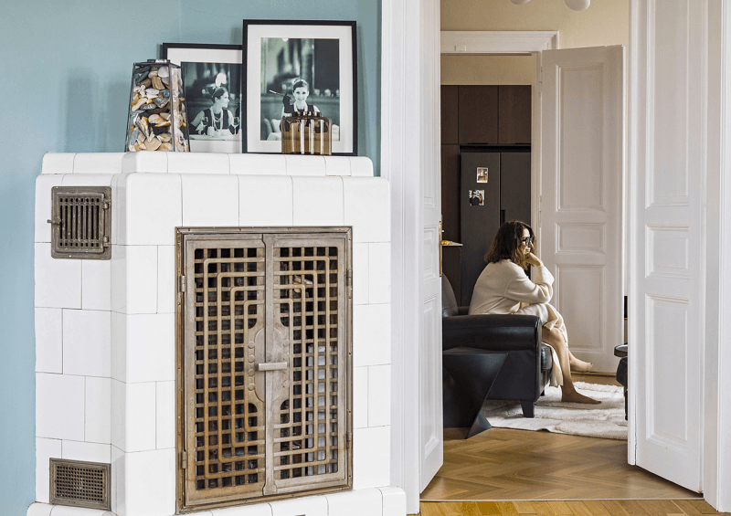 Pohled z ložnice přes obývací pokoj do kuchyně. V popředí původní kachlová kamna, v pozadí Zuzana Mach, Foto: LEXXUS NORTON.