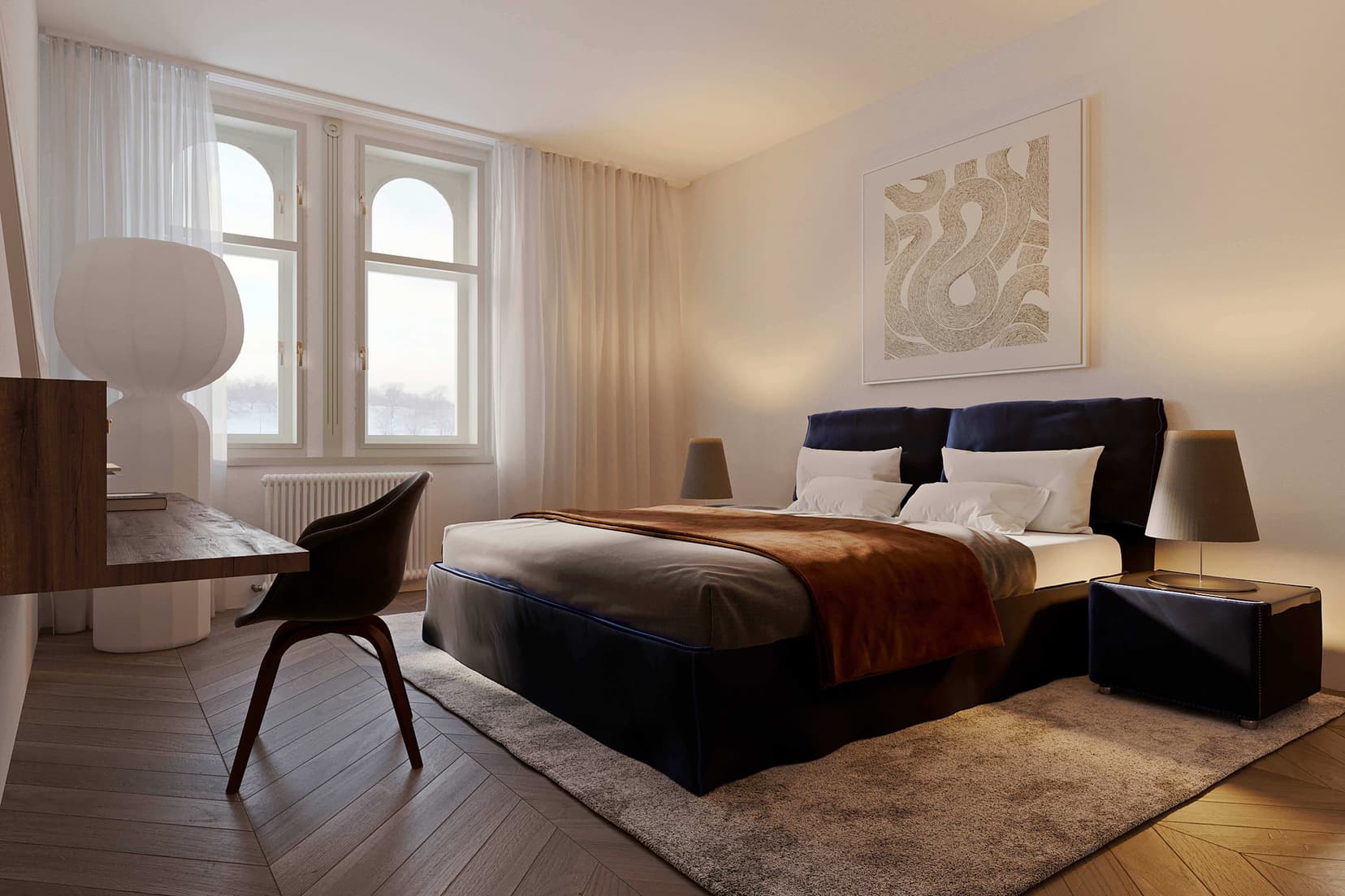 Jedním z hlavních designových prvků jsou repliky špaletových oken. Nejde jen o estetický detail – okna s dvojsklem zachovávají tepelný komfort a současně dodávají místnostem autentický historický vzhled. Na podlahách najdete kvalitní dřevěné parkety, které vytvářejí teplou, útulnou atmosféru.