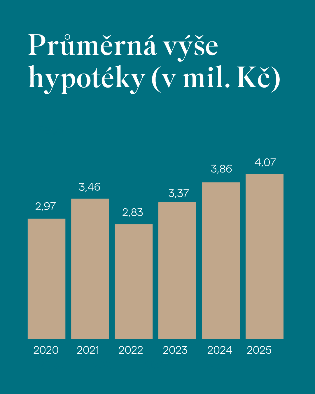 Podle aktuálních údajů činí průměrná výše nově poskytnuté hypotéky 4,07 milionu korun, přičemž na konci roku 2024 se tato částka pohybovala kolem 3,86 milionu korun. Tento nárůst potvrzuje pokračující trend růstu, který započal v roce 2022, a přestože byl vývoj v předchozích letech poznamenán několika výraznými změnami, nyní se situace na trhu stabilizuje.