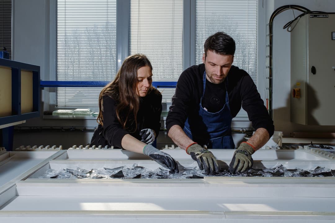 Tavené desky byly vyráběny v Kolectivs Ateliers v Novém Boru. Spoluautorka Michaela Tomišková sama plnila formu drcenými střepy, a to ve spolupráci s Michalem Ullrichem, vedoucím Ateliéru slamping and fusin. Foto: Natálie Kubenková