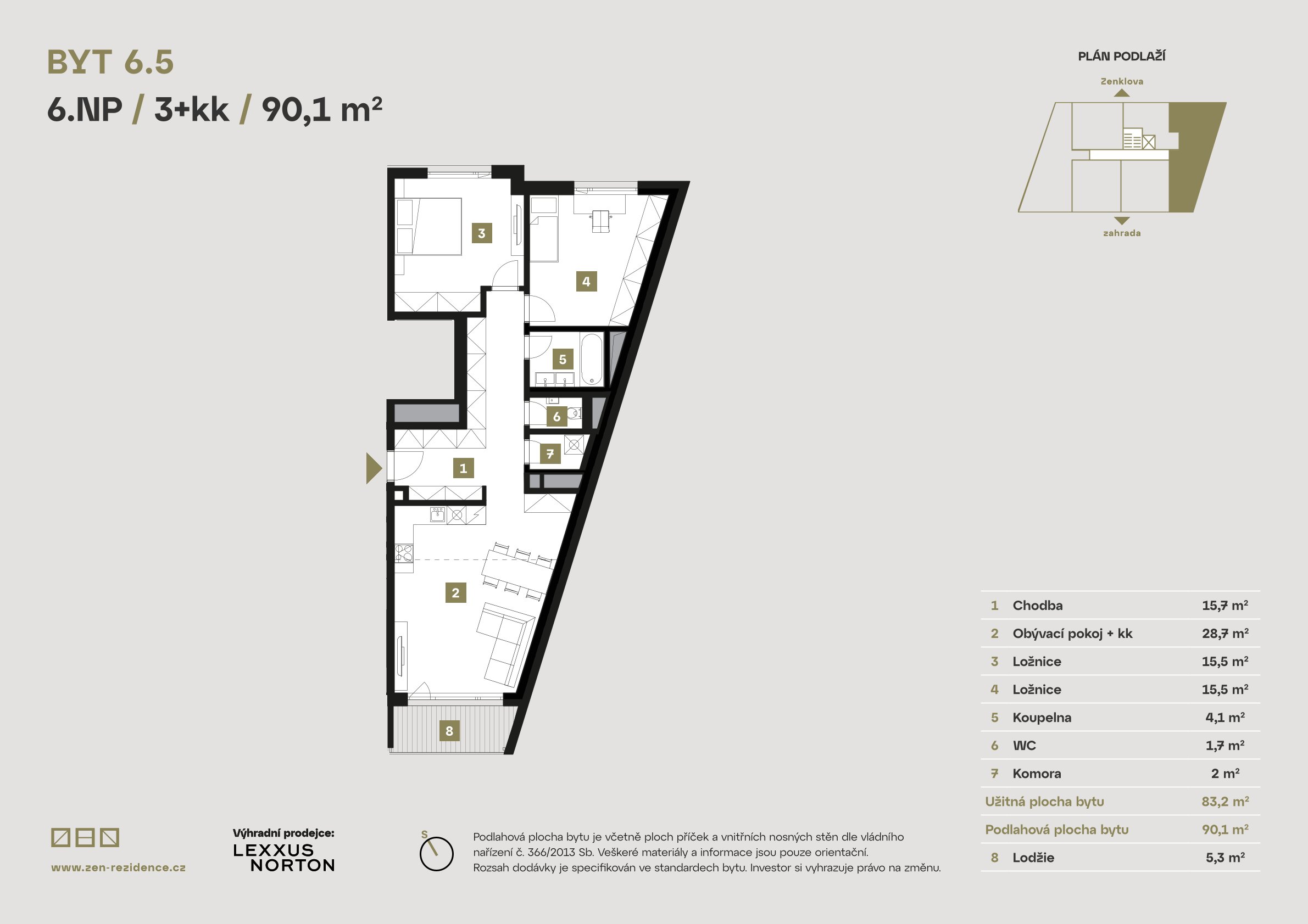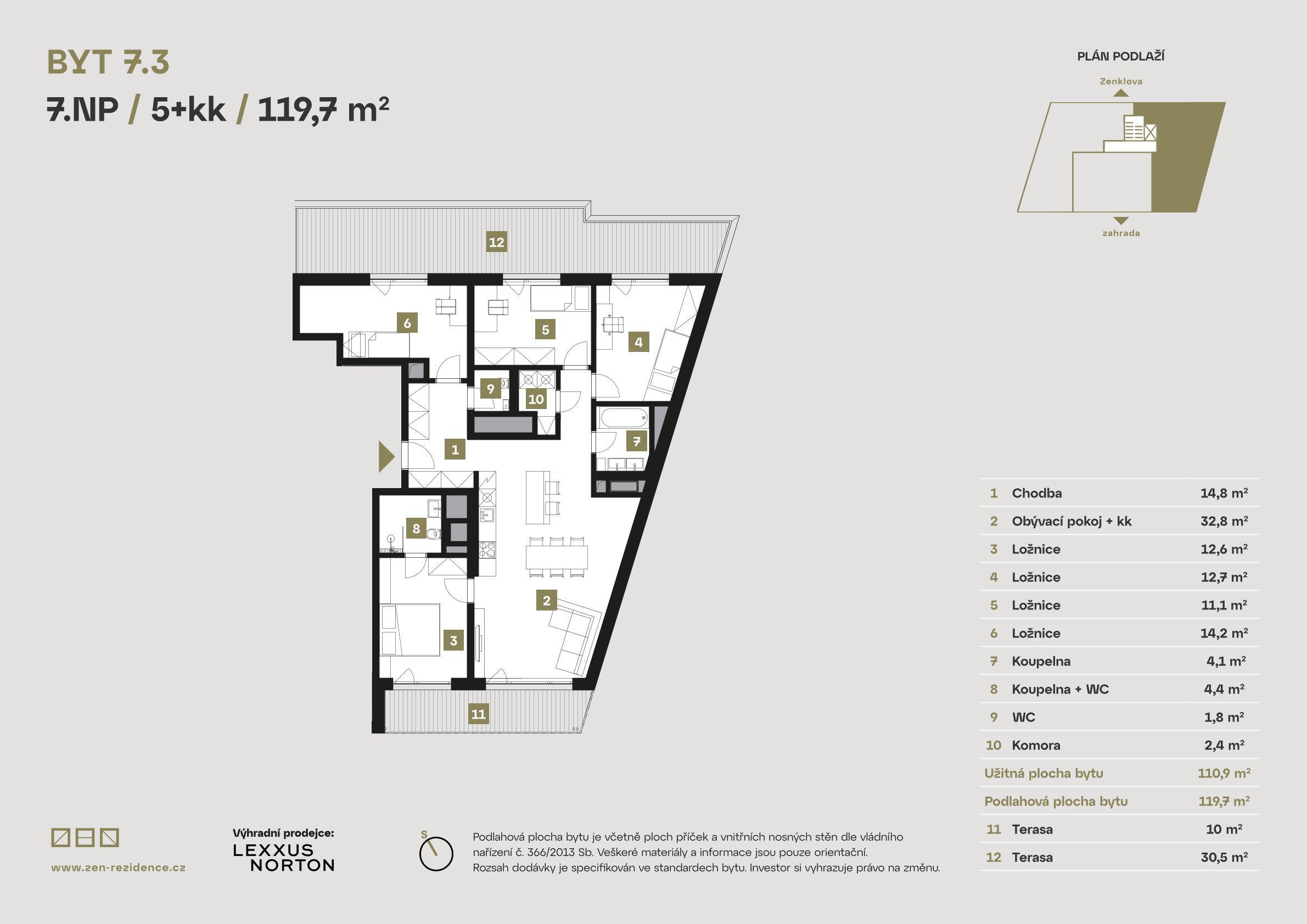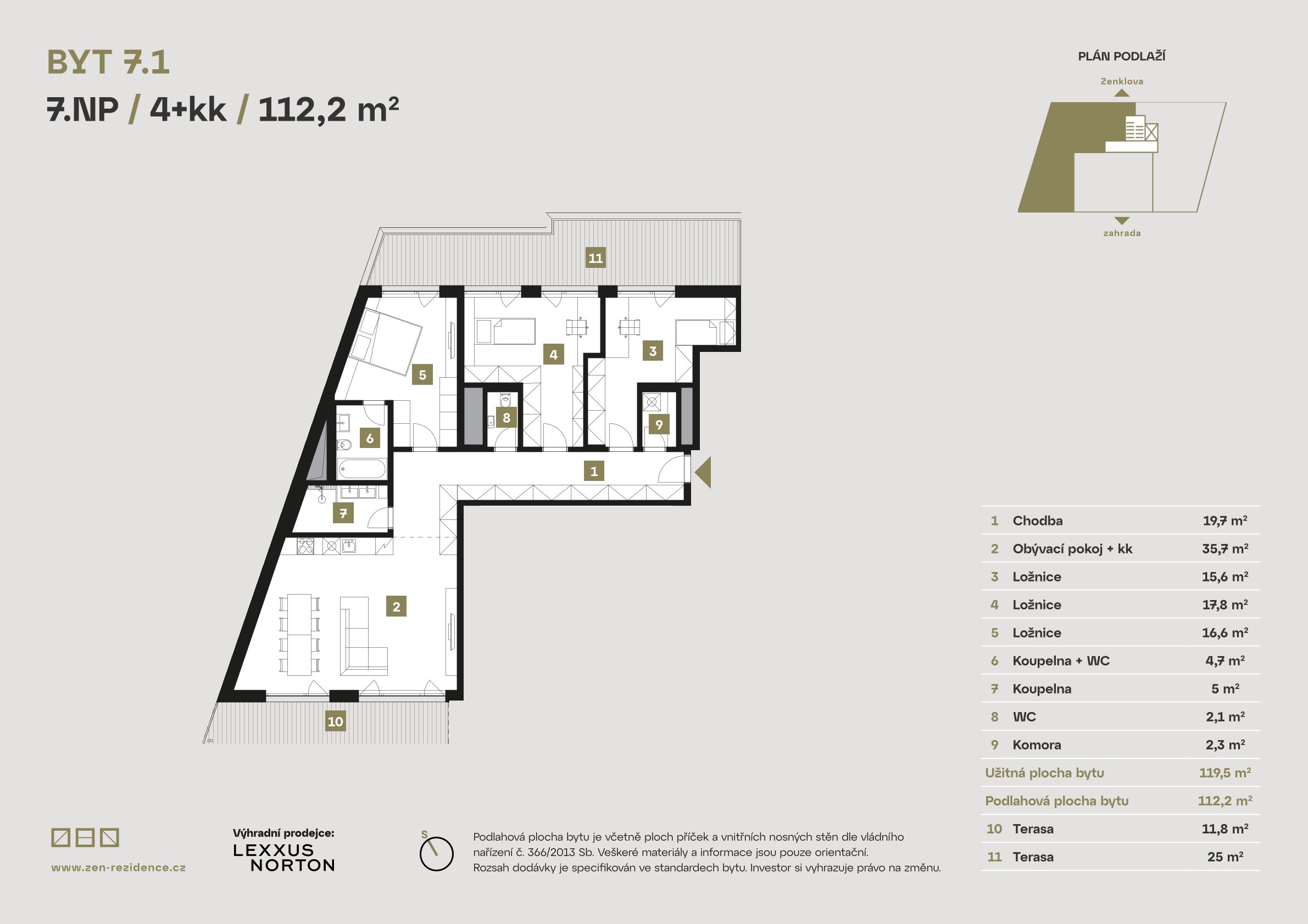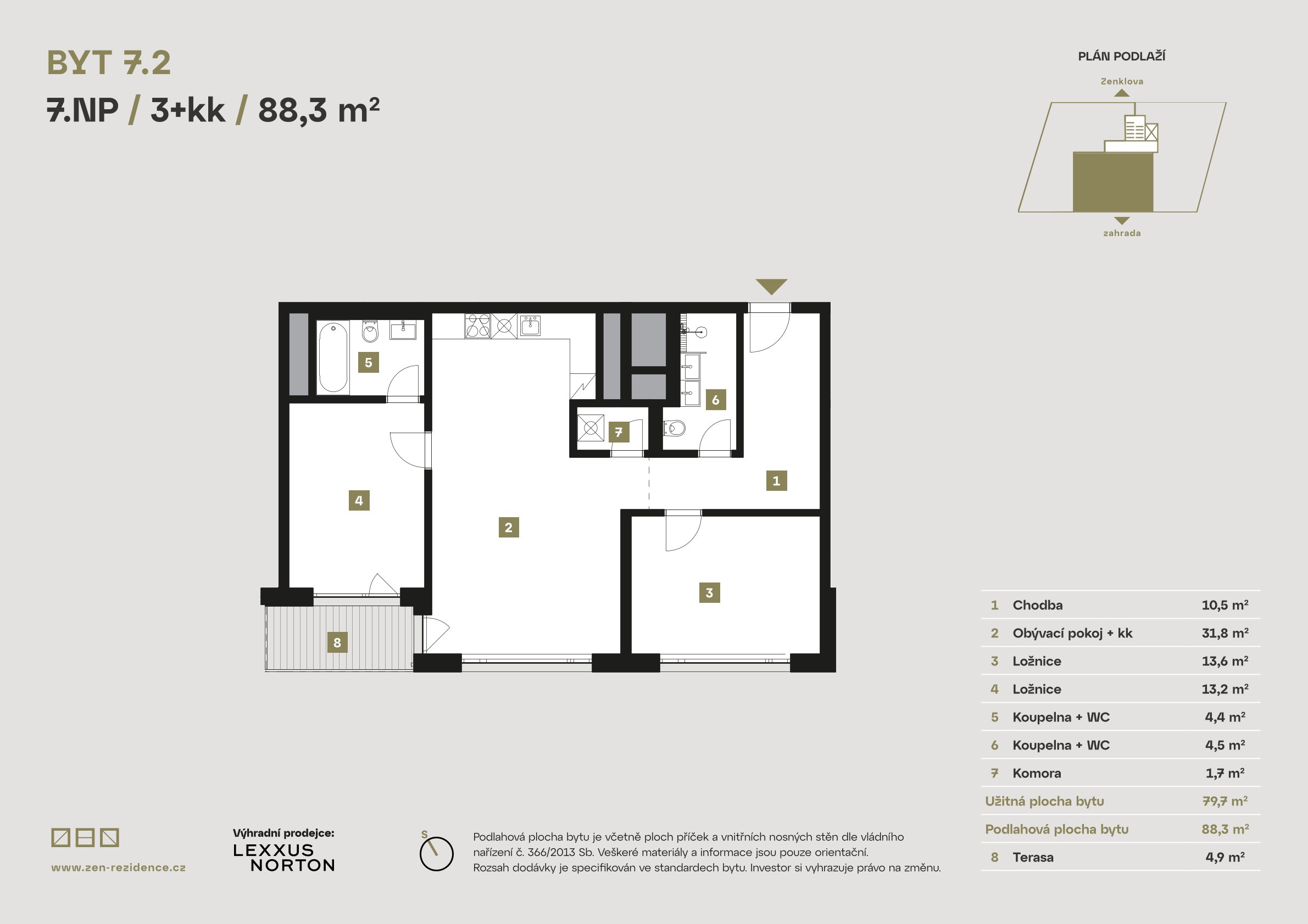 Each apartment is designed with meticulous attention to detail, elegance, and functionality. Premium RAKO tiles, bathrooms fitted with products from renowned brands such as Grohe, Laguna, and SAT, triple-glazed insulated windows, electric outdoor blinds, heat recovery ventilation, wood-look vinyl flooring, and Class 3 security doors are all standard features of living at ZEN Rezidence. In addition, selected apartments include loggias with city views that will leave you spellbound.