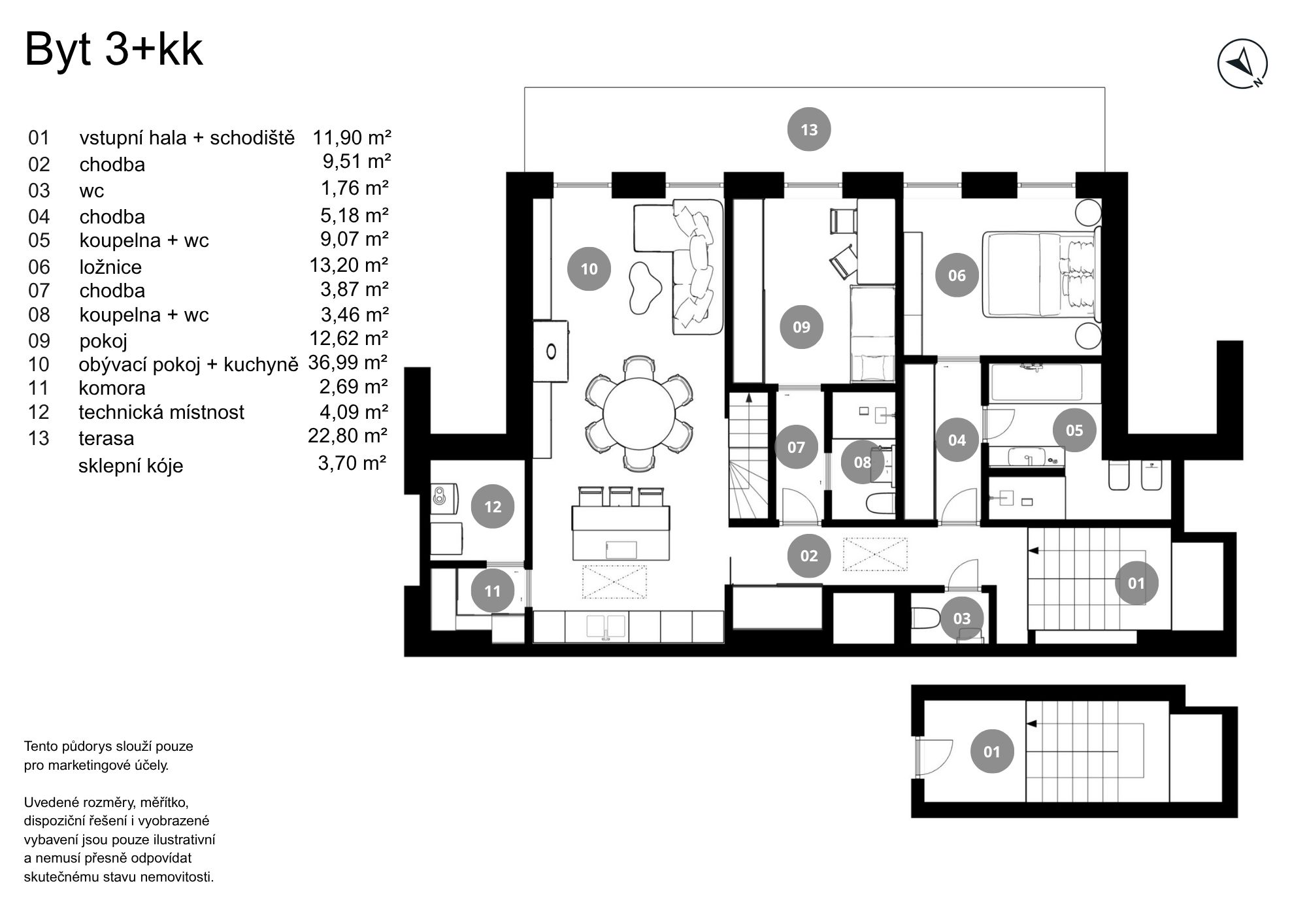 Dispozice nabízí prostorný obývací pokoj s moderním kuchyňským koutem a jídelním prostorem pro celou rodinu, ložnici s vlastní en-suite koupelnou, dětský pokoj se samostatnou druhou koupelnou, oddělenou toaletu, šatnu a vstupní zádveří. Komfort zvyšuje také velká technická místnost sloužící jako prádelna, která poskytuje praktické zázemí pro každodenní chod domácnosti.