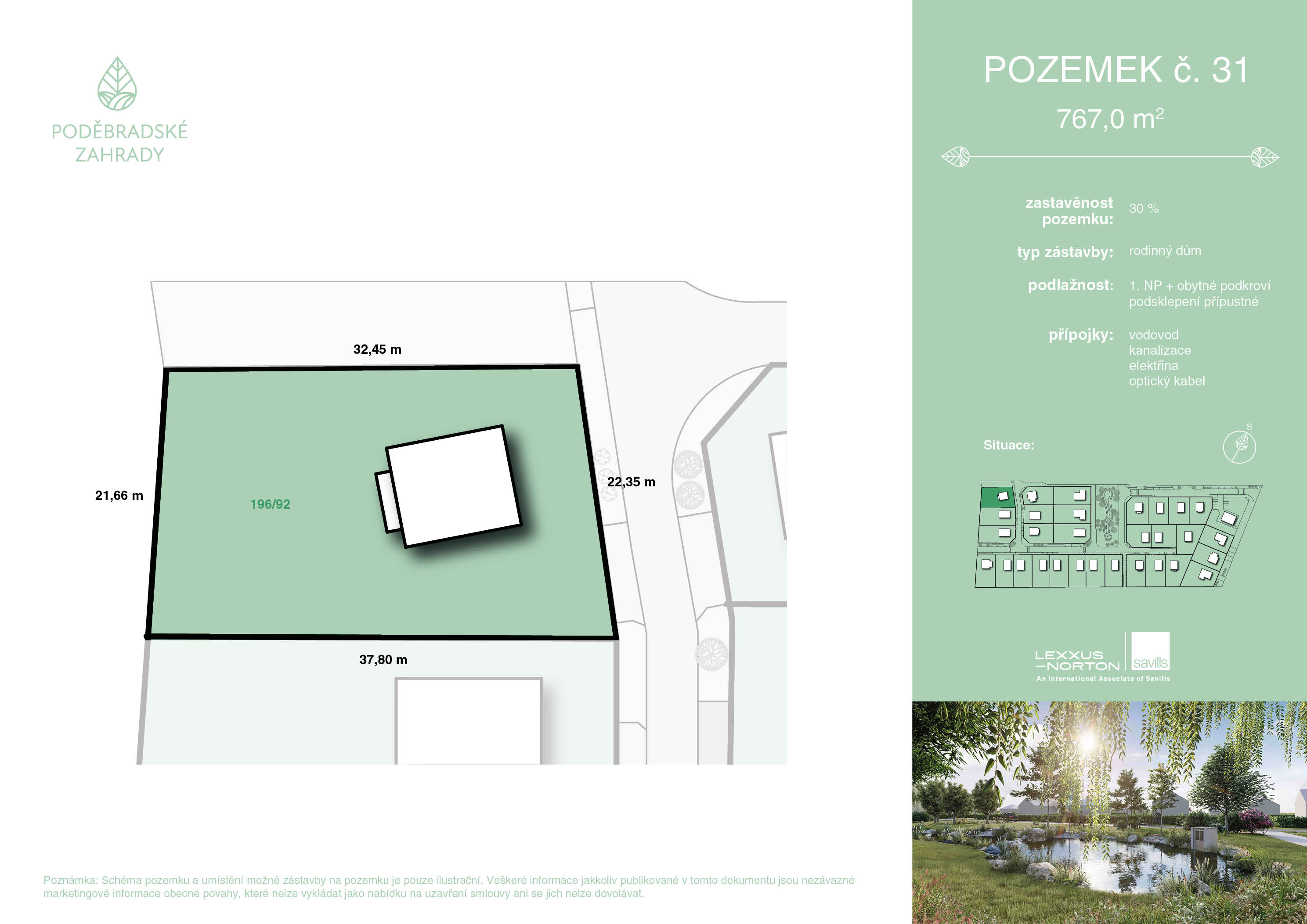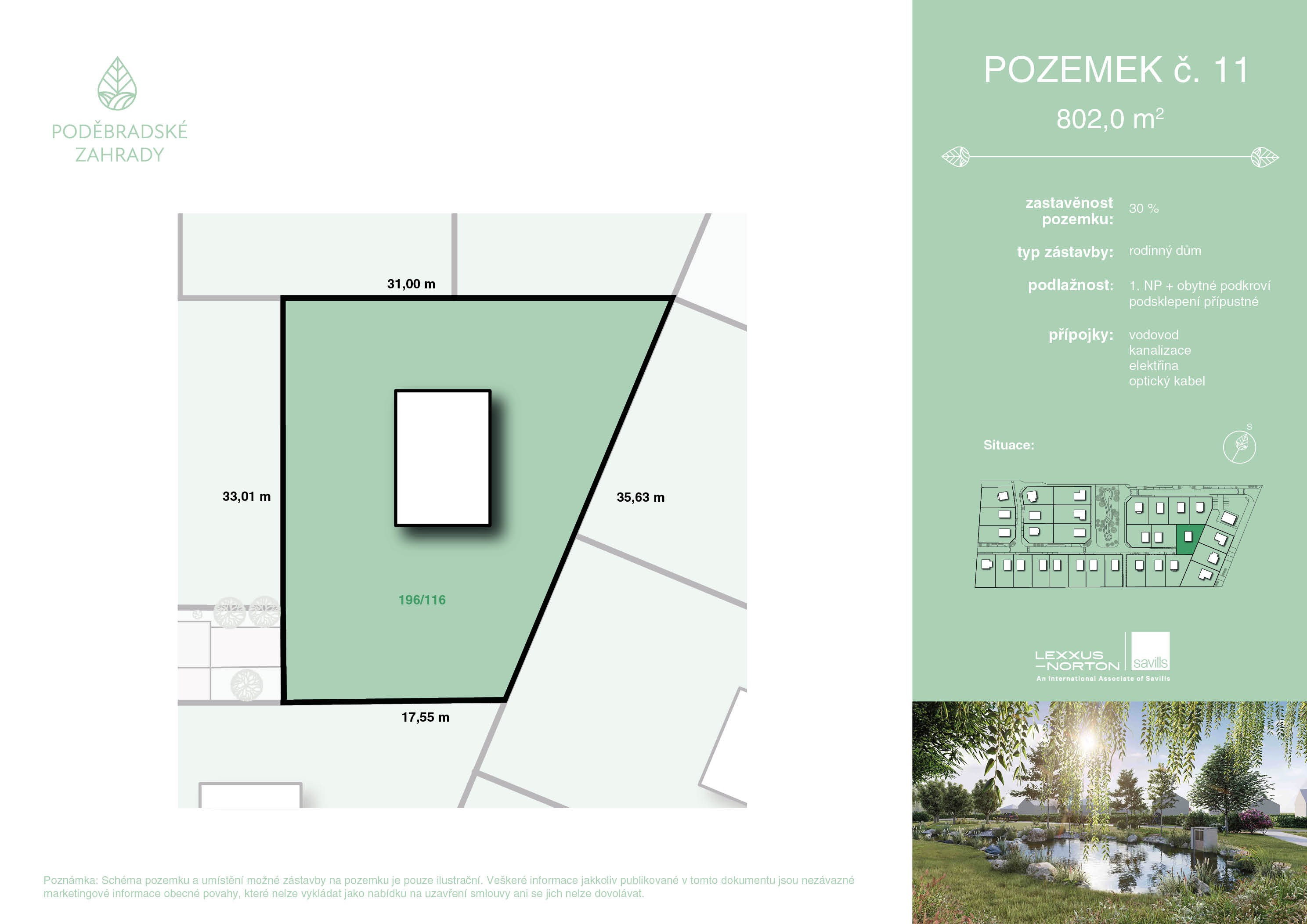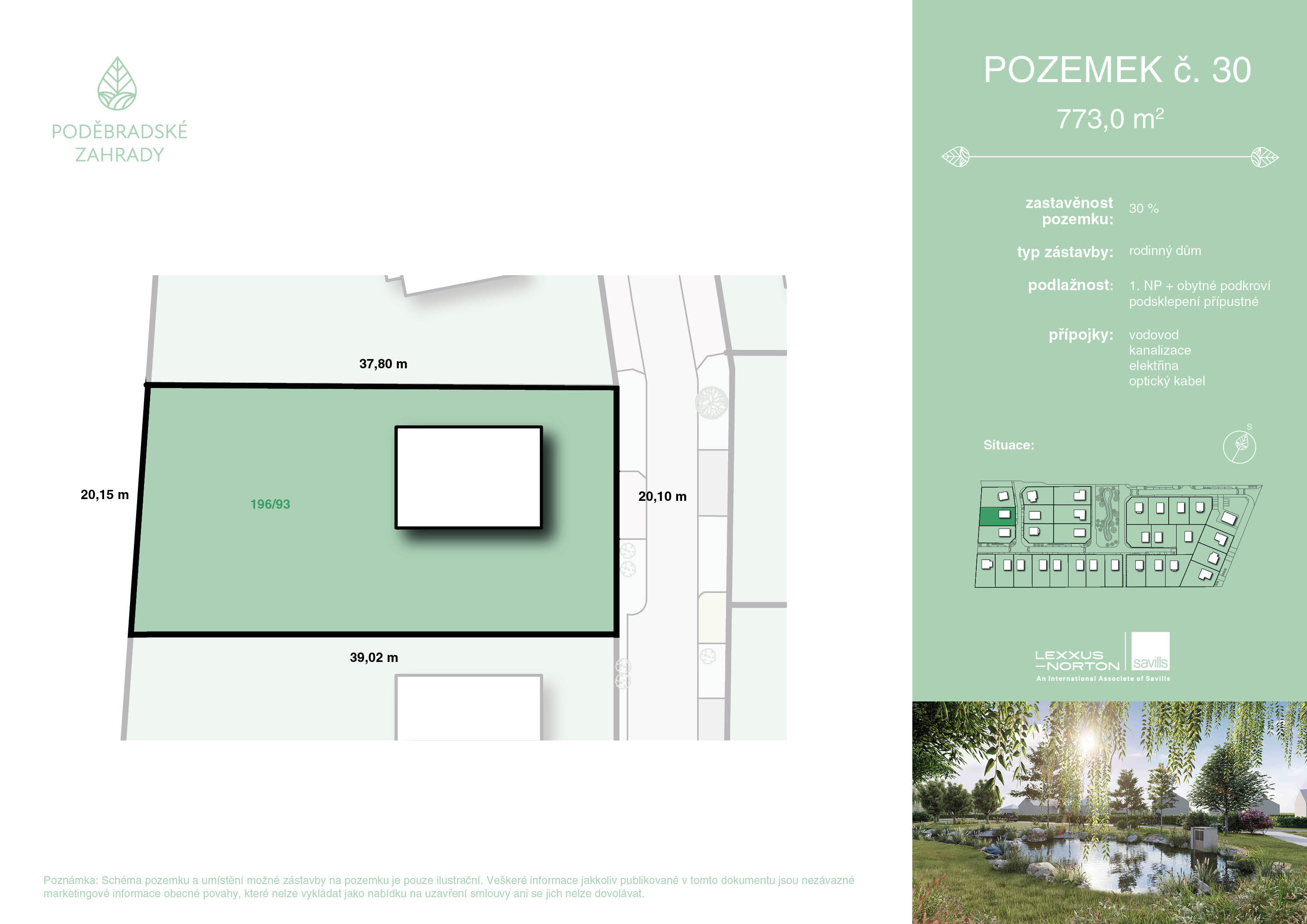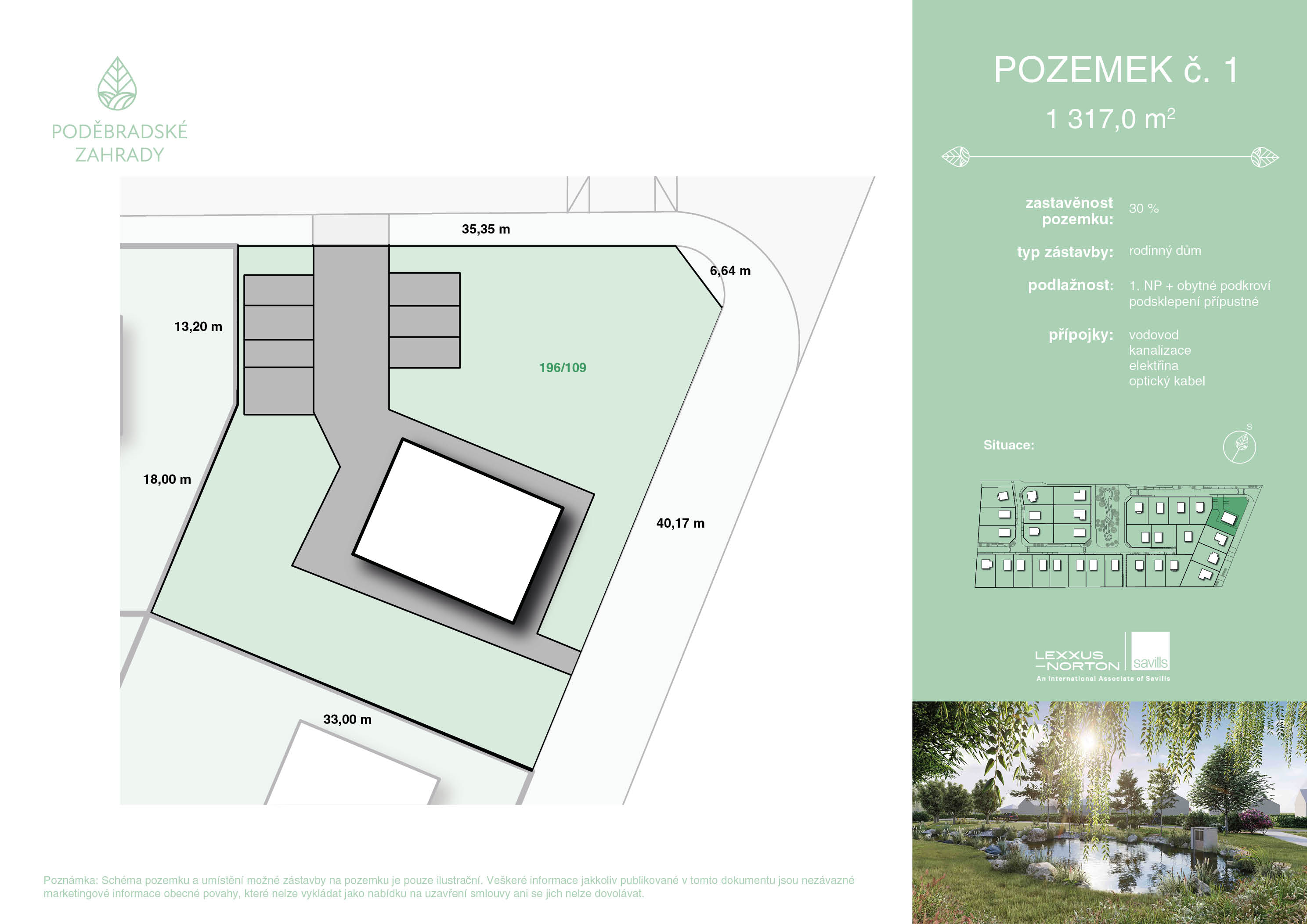 Exkluzivní projekt Poděbradské Zahrady v Choťánkách nabízí 31 stavebních parcel o rozloze 653 až 1317 m2. Každý pozemek má již kompletně zkolaudované sítě - elektřina, voda, kanalizace a připojení na datové rozvody. Samozřejmostí jsou dokončené příjezdové cesty, chodníky a veřejné osvětlení. Poděbradským Zahradám dominuje velkorysé eko-jezírko s parkovou úpravou a pozemky bude lemovat soukromý lesopark.