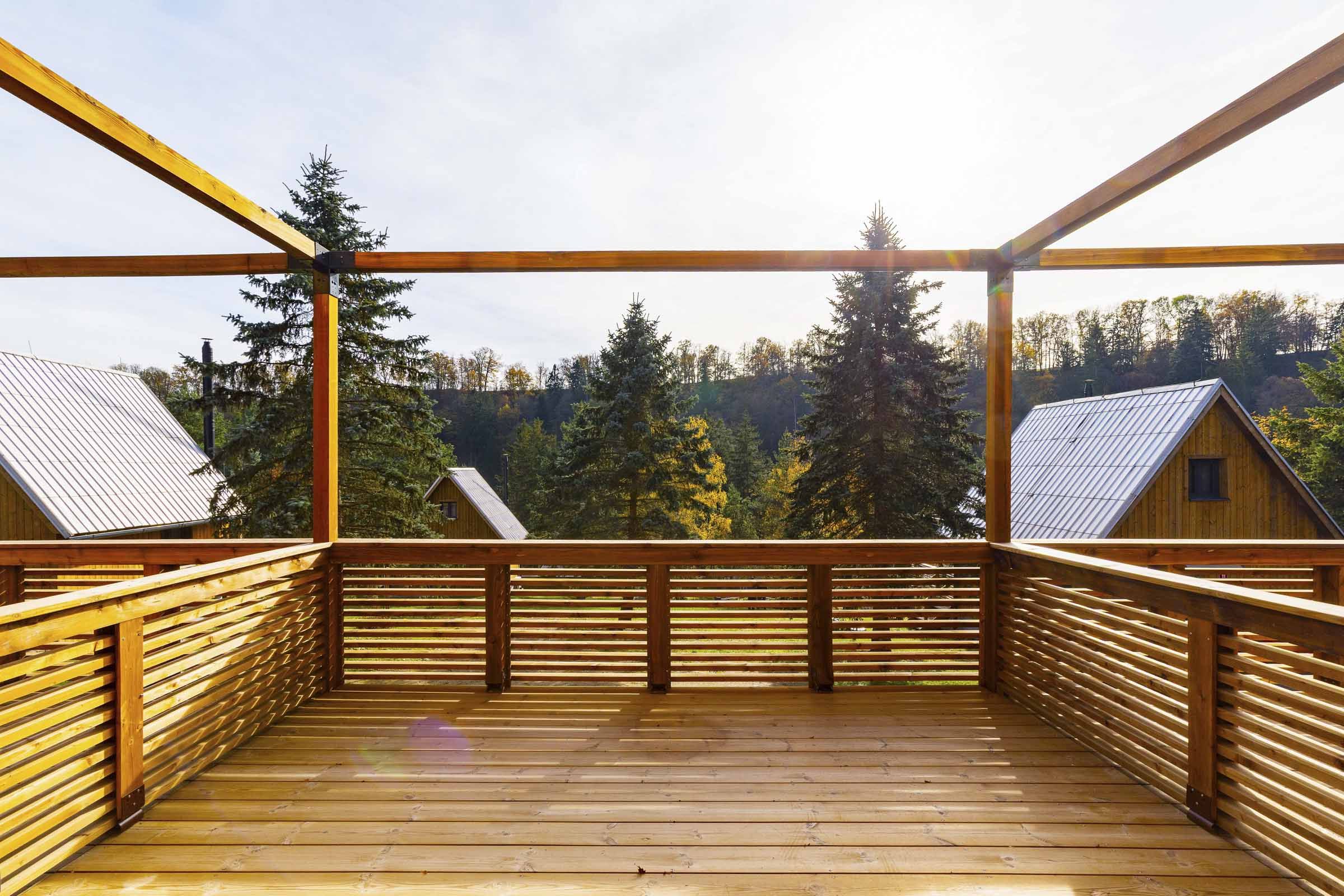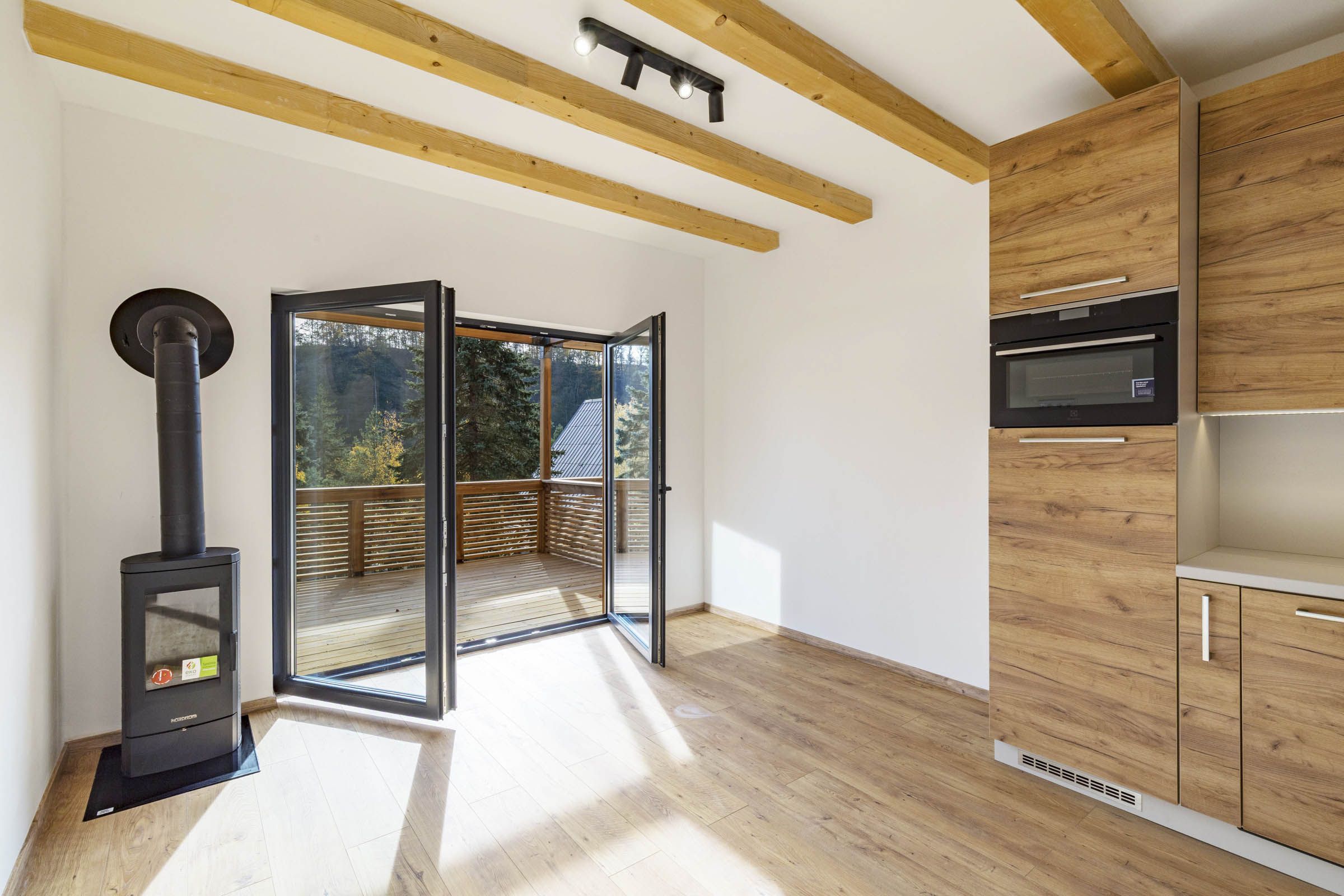 Každý apartmán s obytnou plochou 47,6 m² je navržen tak, aby nabízel maximální komfort pro krátkodobé i dlouhodobé pobyty. V přízemí se nachází obývací prostor s kuchyňským koutem, koupelnou a přímým vstupem na terasu s výhledem na okolní lesy. Pod terasou je uzamykatelný prostor o výměře 11 m². Horní patro pak nabízí 2 prostorné ložnice. Moderní koupelna a stylový interiér zajišťují vysoký standard rekreačního bydlení. Apartmány jsou vybaveny kamny, klimatizací, kuchyňskou linkou. K využití je společná zahrada.