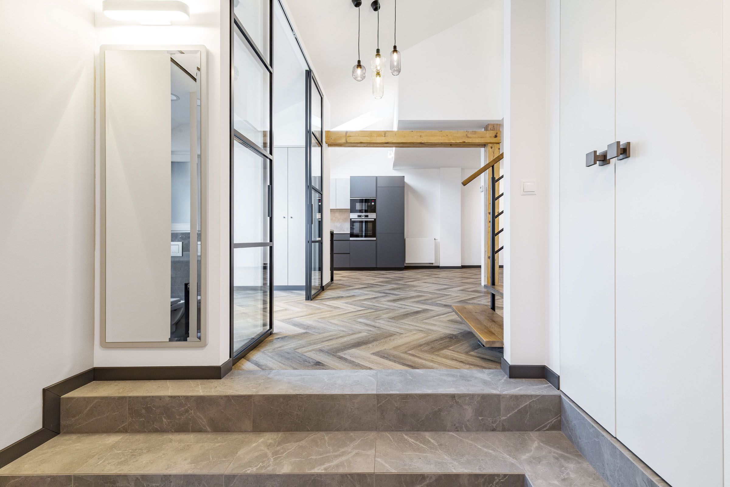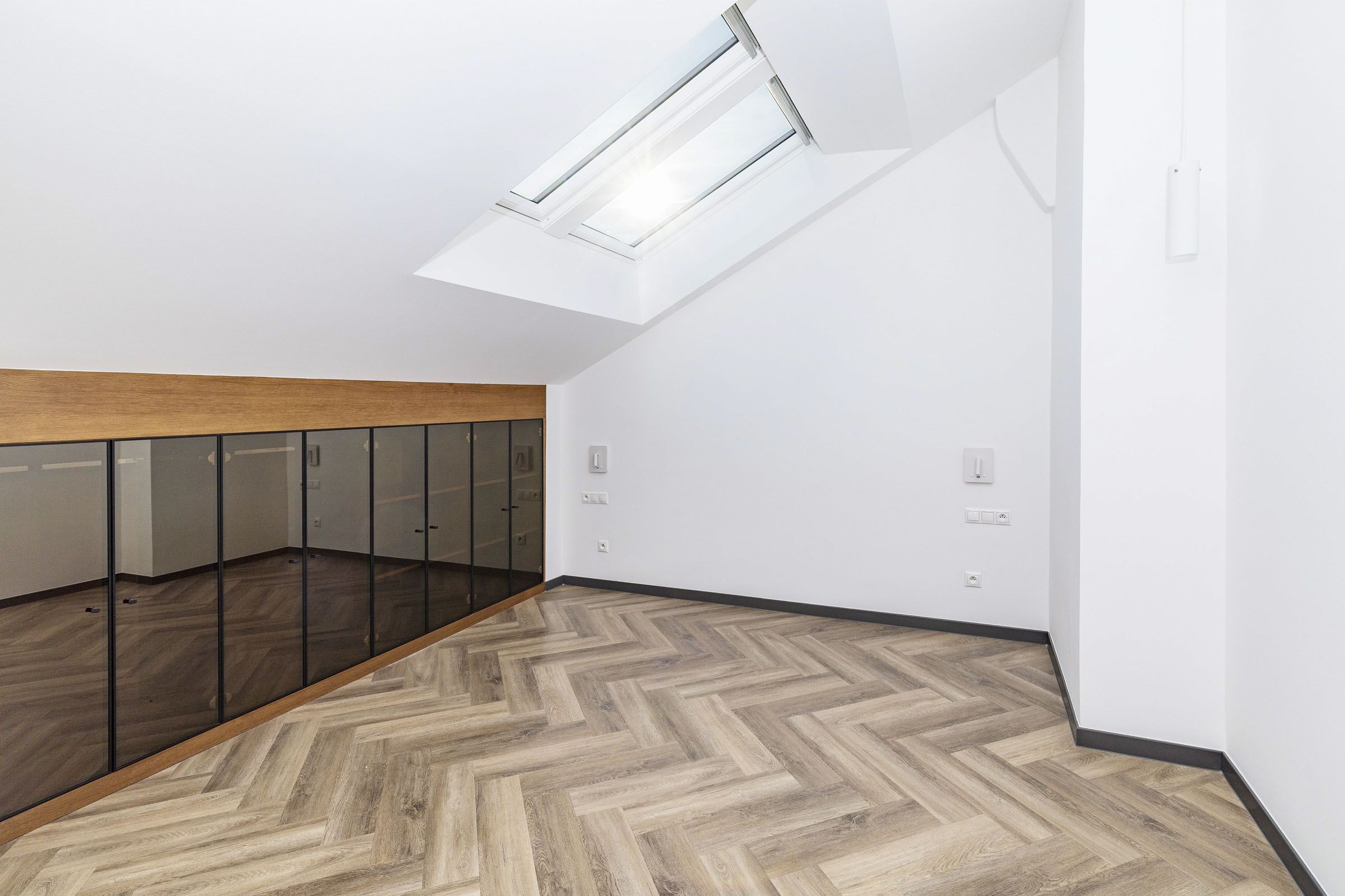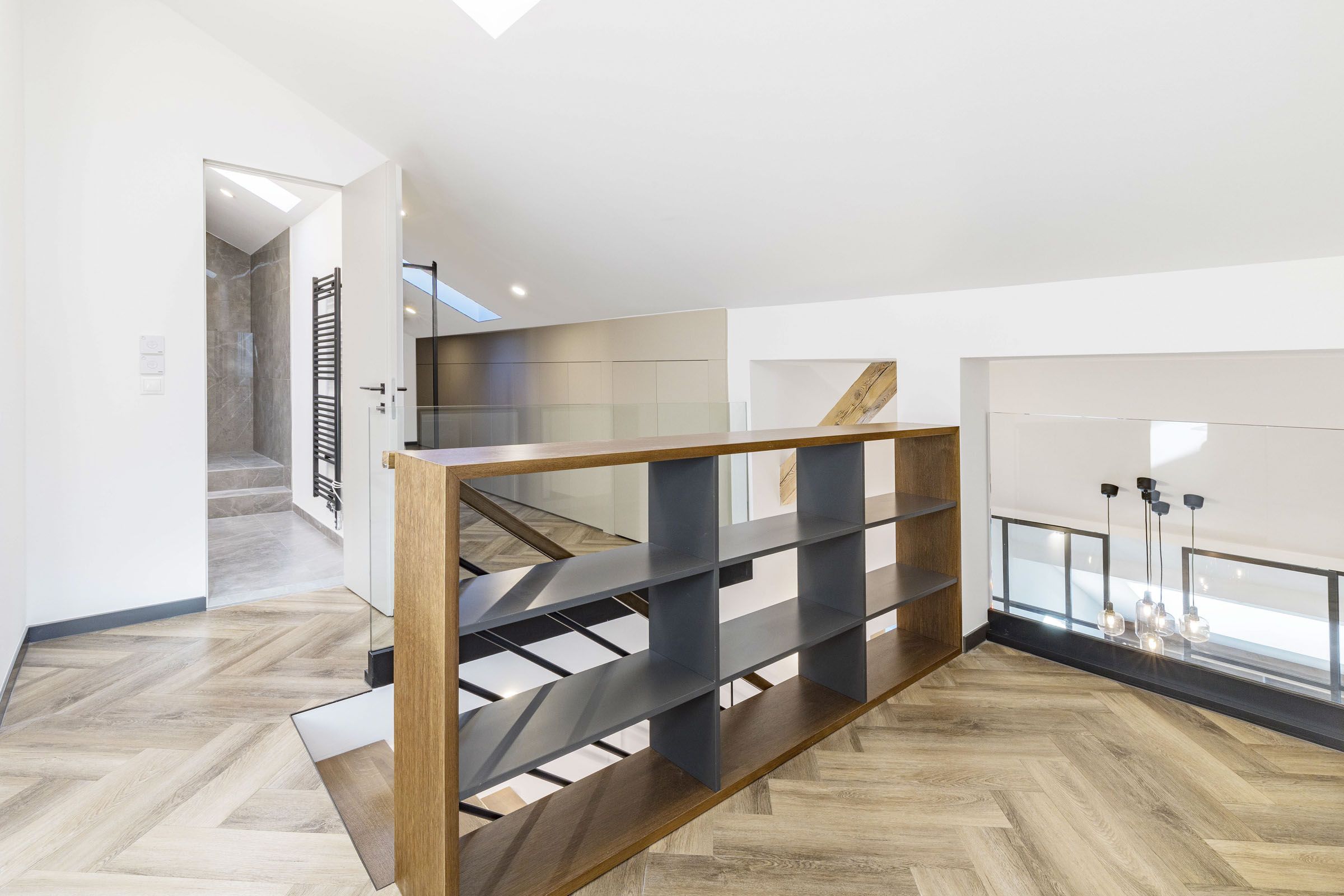 The lower level of the apartment offers a generous living area with kitchen, a bedroom separated by an elegant Dorsis glass partition, a bathroom, and an entrance hall with additional technical facilities. The upper level features a second bedroom, a bathroom, a gallery with a workspace, and a spacious walk-in closet.