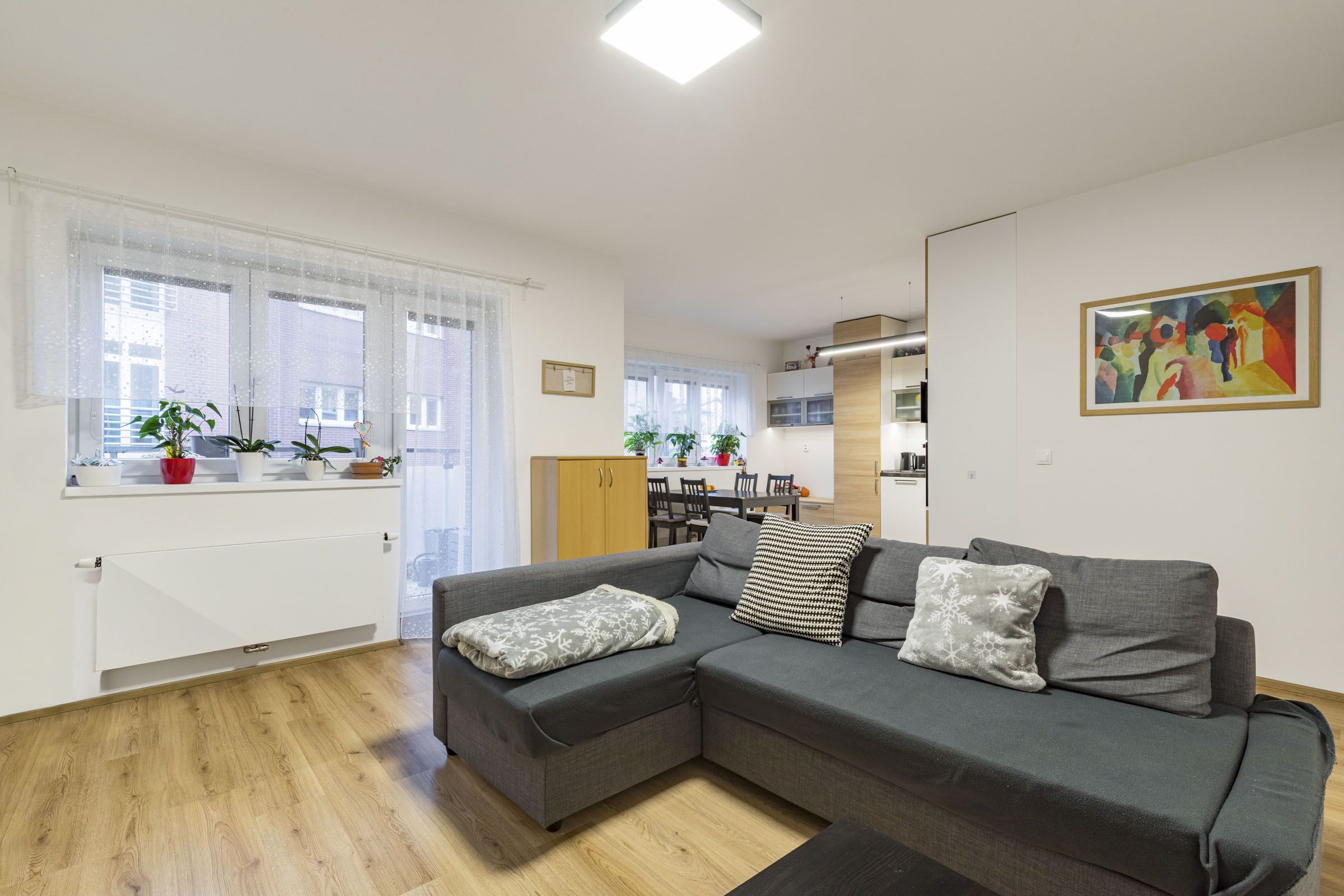 We offer for sale a spacious one-bedroom apartment with a floor area of 65 sqm and a 6 sqm balcony, located on the 2nd floor of an apartment building in a quiet part of Modrany. The layout of the apartment includes a spacious entrance hall, an airy living room with a kitchenette, a separate bedroom, a modern bathroom, a practical storage room, and a corner loggia ideal for relaxation. The apartment also includes a cellar and a reserved disabled parking space. The apartment can also be converted into a 2-bedroom layout, offering flexibility for those who need an additional separate room.