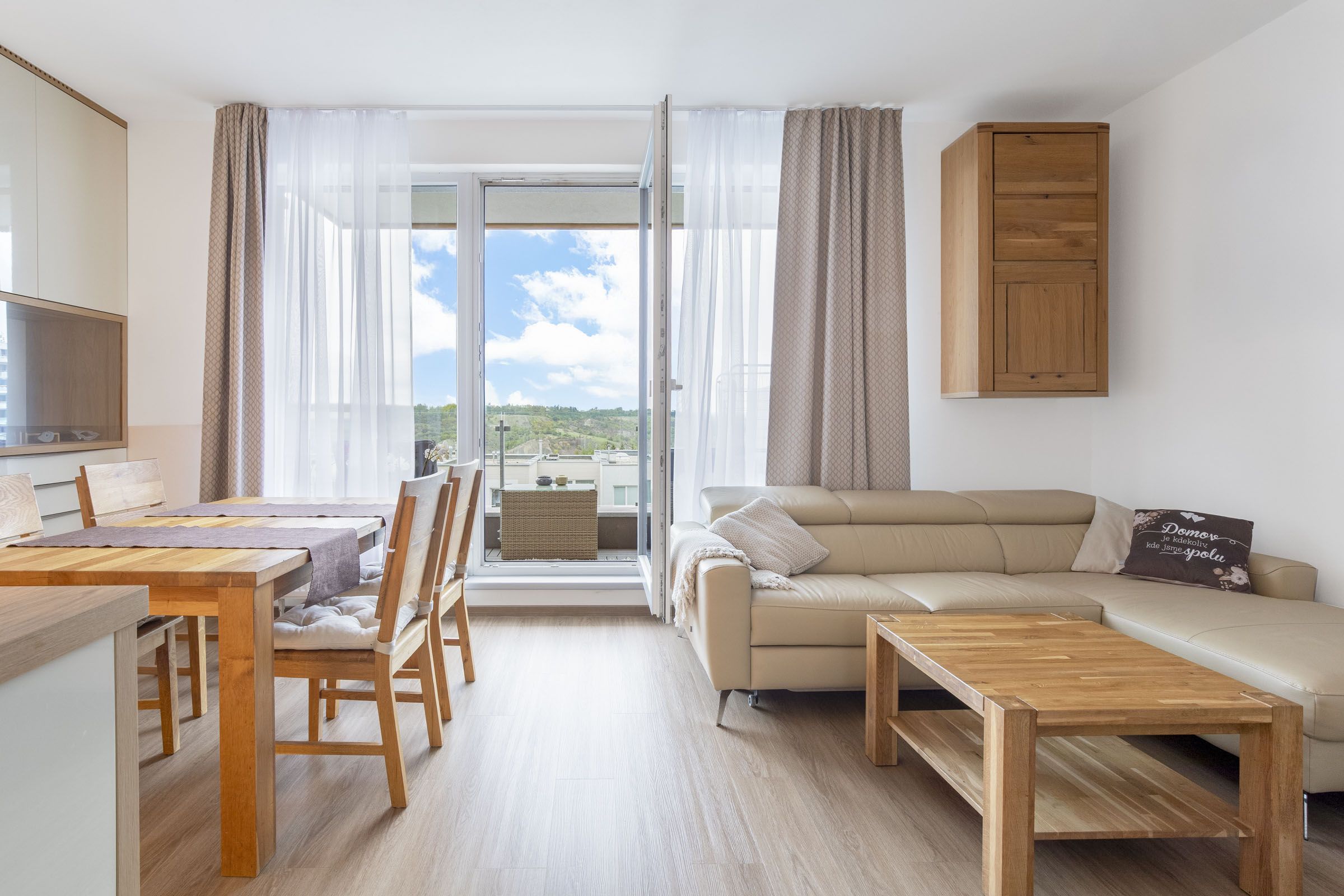 The apartment is located in the Barrandov Hills residential project in Prague 5 – Barrandov. The location offers all civic amenities – schools, kindergartens, a health center, restaurants, a shopping center, a theater, a swimming pool, and other services. Barrandov also offers plenty of greenery and opportunities for sports and relaxation – Prokopske udoli, Chuchelsky haj, or bike paths in the