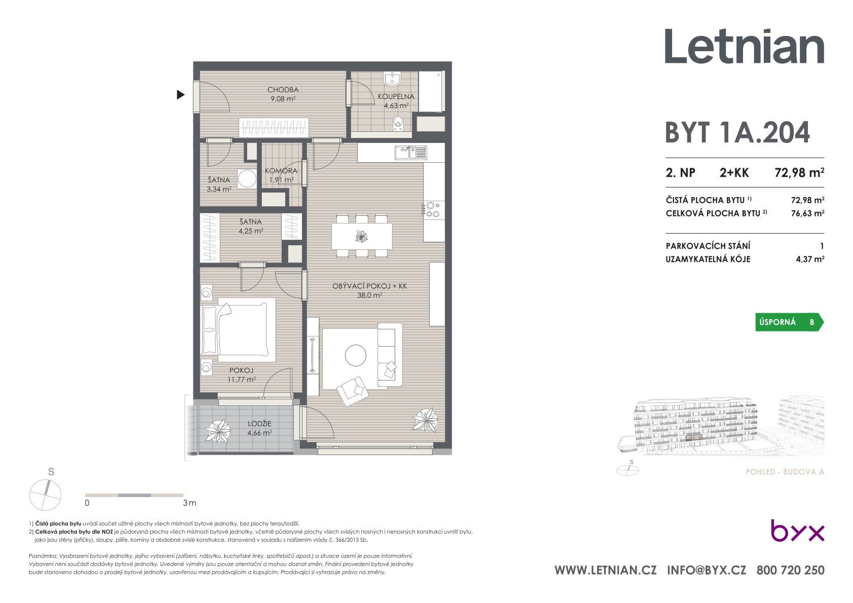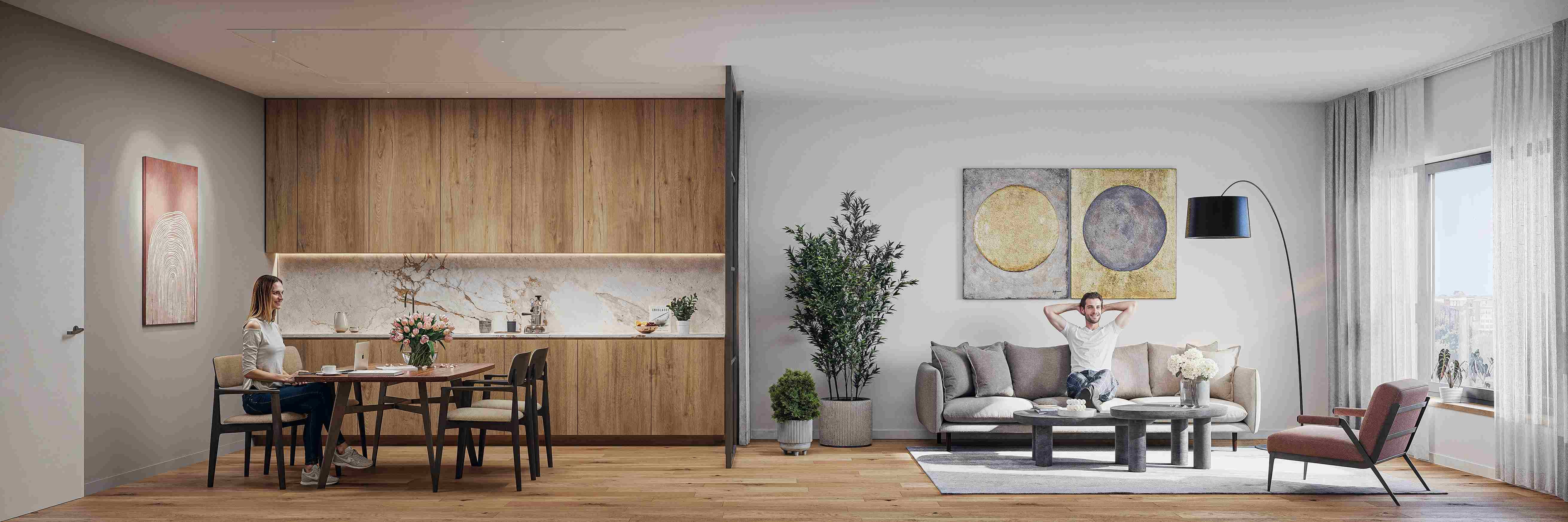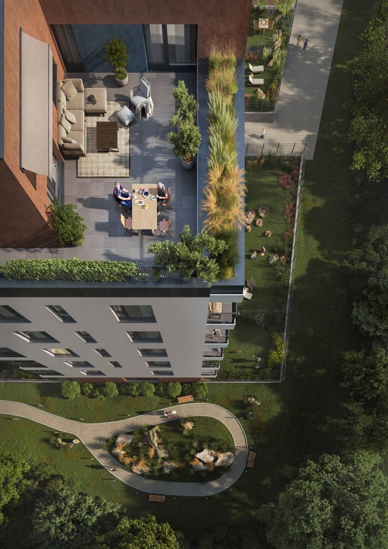 The apartment is finished to a high standard, includes quality laminate flooring, quality bathroom tiles and sanitary ware, preparation for outdoor electric blinds and complete preparation for the kitchen. The apartment can be purchased with a parking space in the underground garage and a cellar.