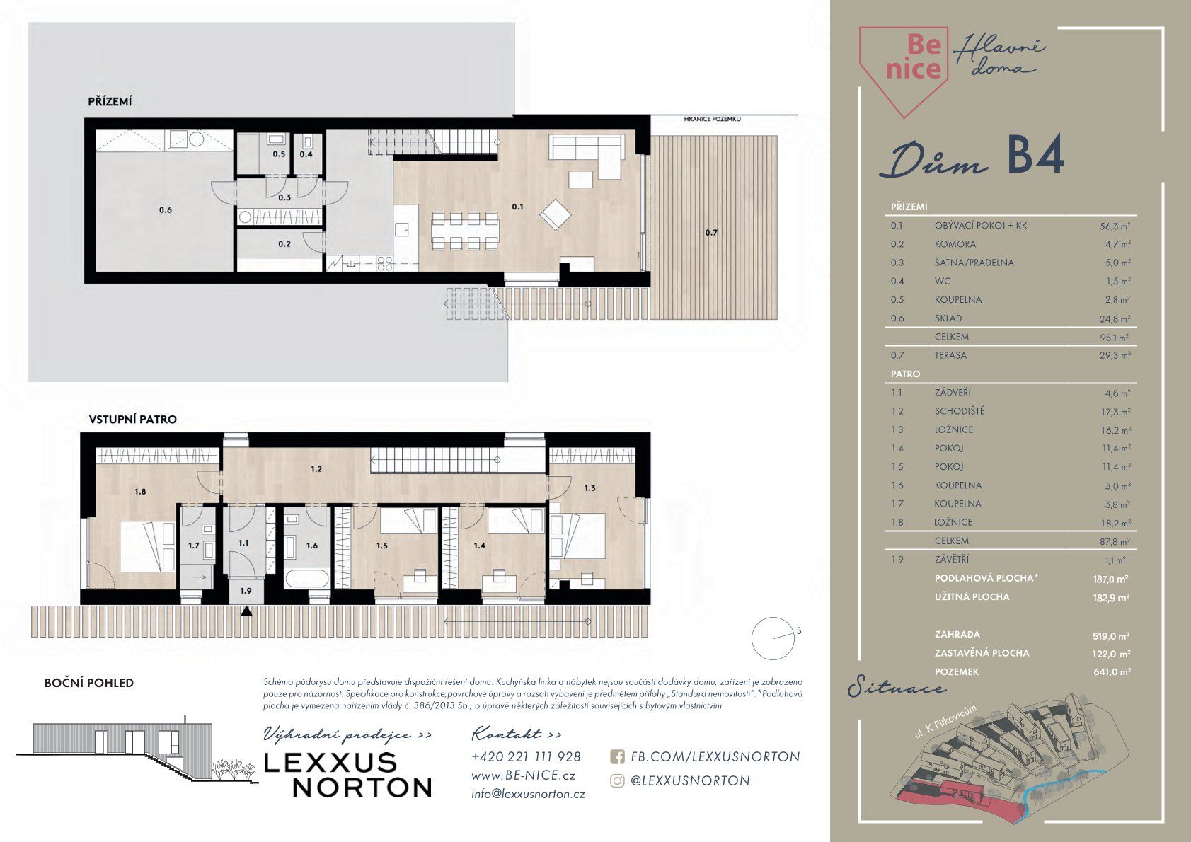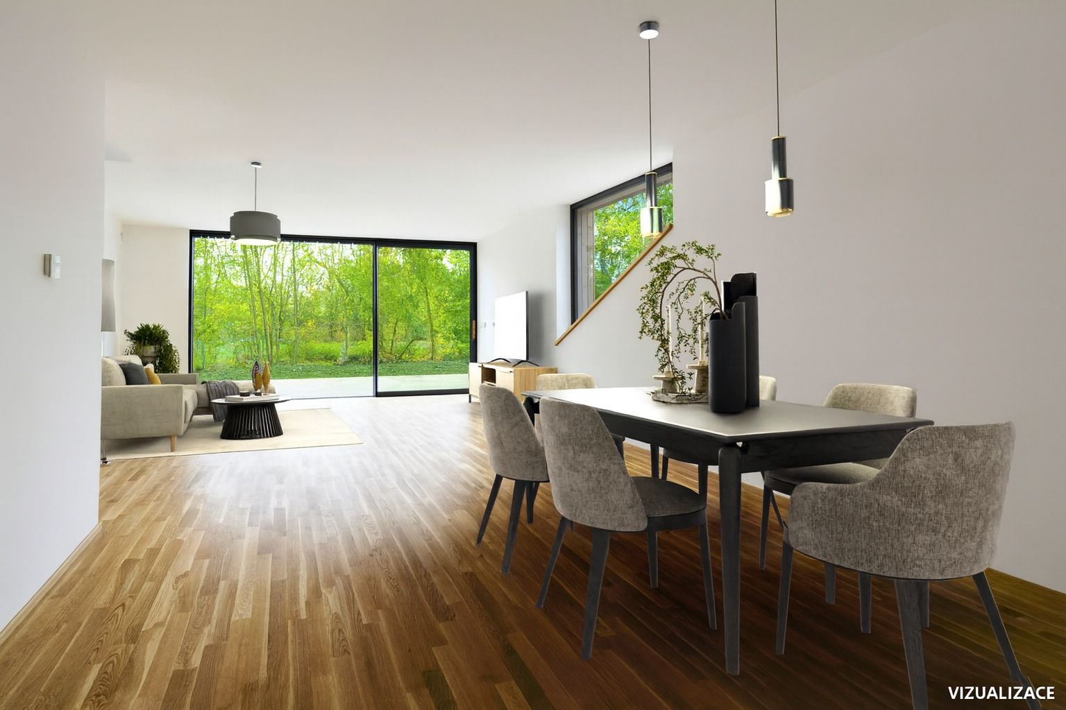 Nabízíme k prodeji poslední volný dům 5+kk s podlahovou plochou 187 m2, terasou 29 m2 a přilehlou zahradou 519 m2 v úspěšném komorním projektu rodinných domů BeNice, Praha 10 - Benice.
