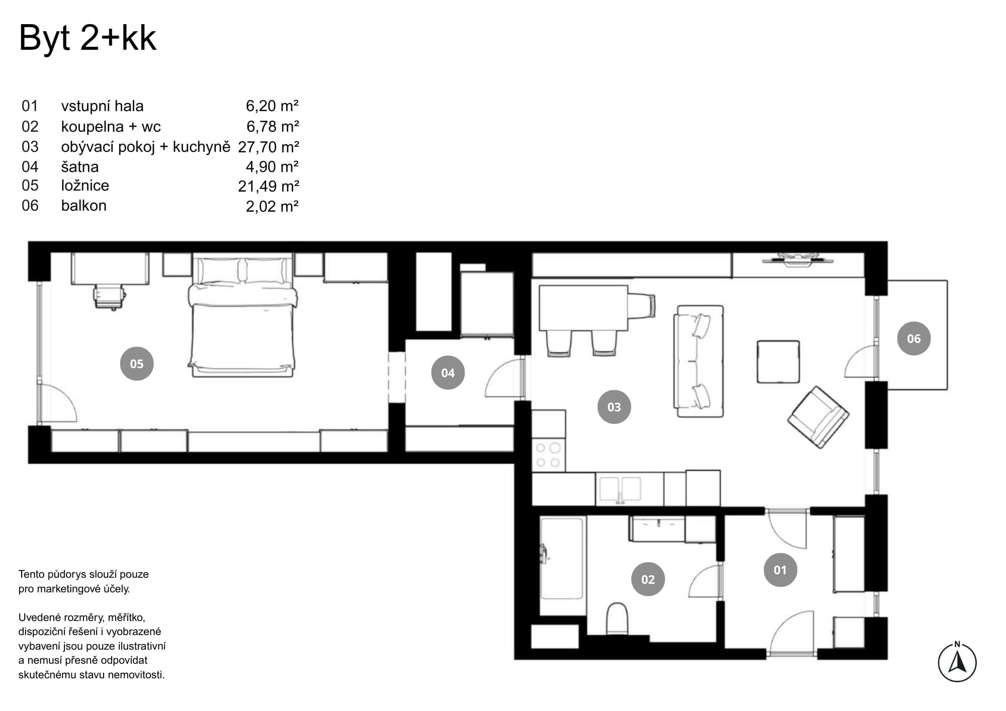 Bytovou jednotku tvoří velký obývací pokoj s kuchyní a výstupem na východně orientovaný balkon s výhledem do klidného vnitrobloku. Prostorná ložnice je přístupná přes průchozí šatnu. Koupelna s vanou a toaletou má samostatný vstup ze vstupní haly s přímým osvětlením.