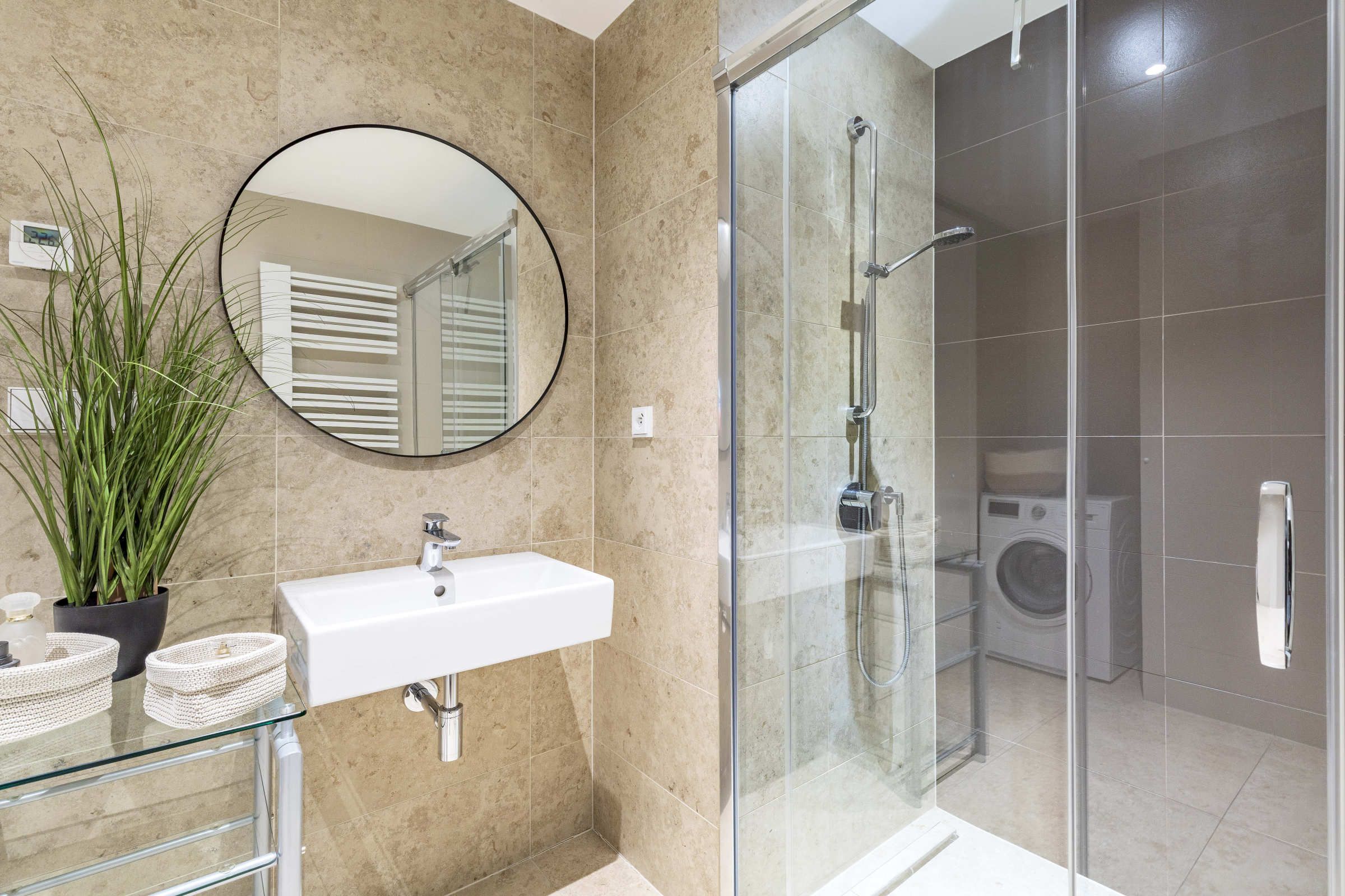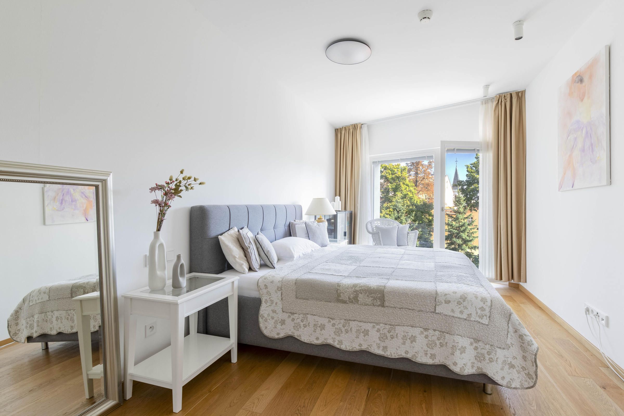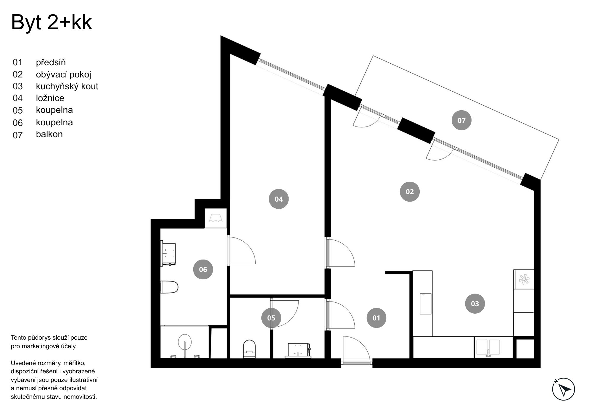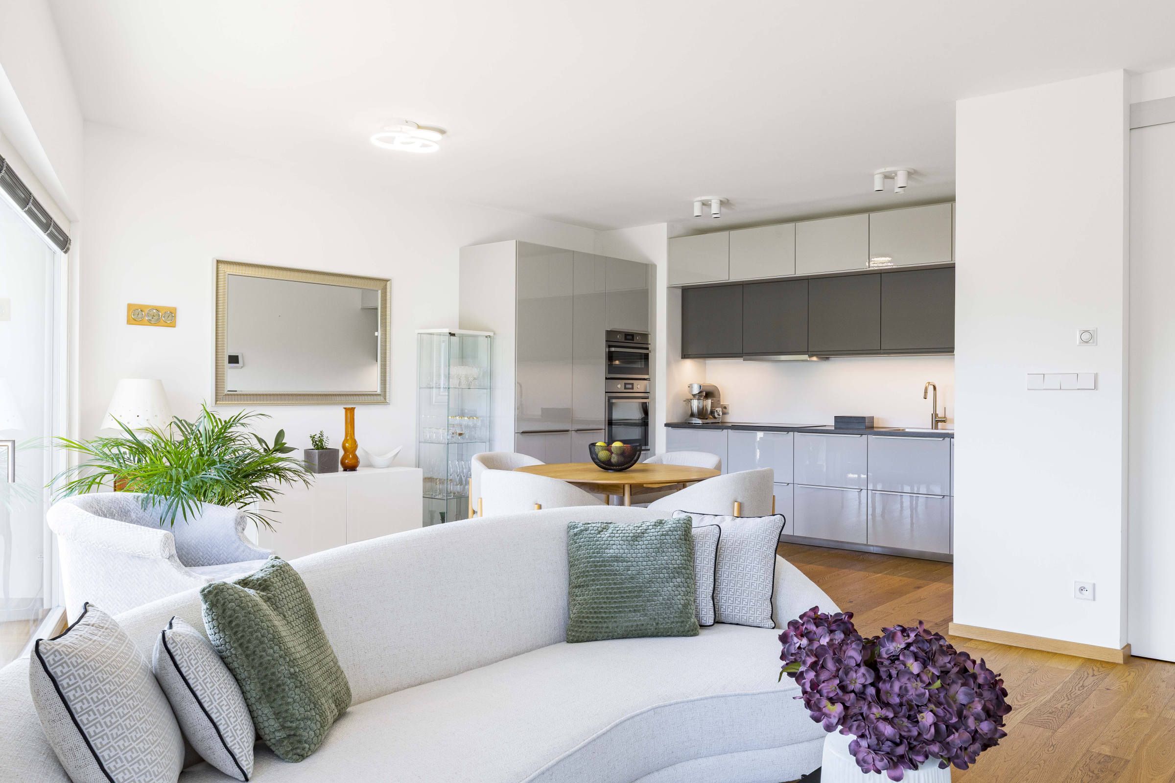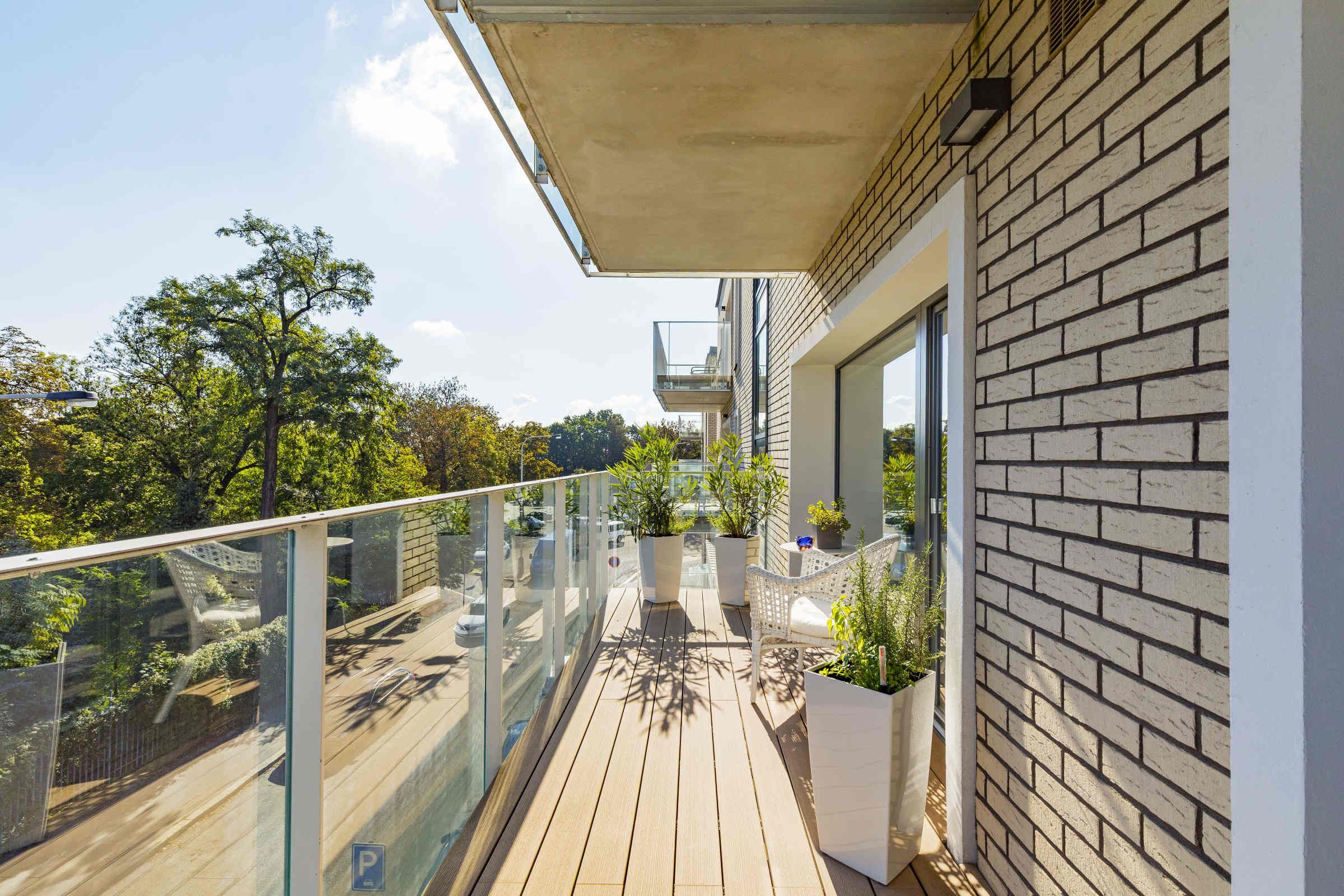 Byt disponuje balkonem o rozloze 12,6 m² s panoramatickým výhledem do přilehlého parku, sklepní kójí a garážovým stáním. Interiér je navržen s důrazem na vysoký standard: prostorná předsíň, koupelna pro hosty, vzdušný obývací pokoj s moderním a nadčasovým kuchyňským koutem a přímým vstupem na balkon, ložnice a druhá koupelna se sprchovým koutem. K vybavení patří podlahové vytápění a koupelny osazené designovou sanitou značky Villeroy & Boch, které podtrhují nadčasovou eleganci interiéru.