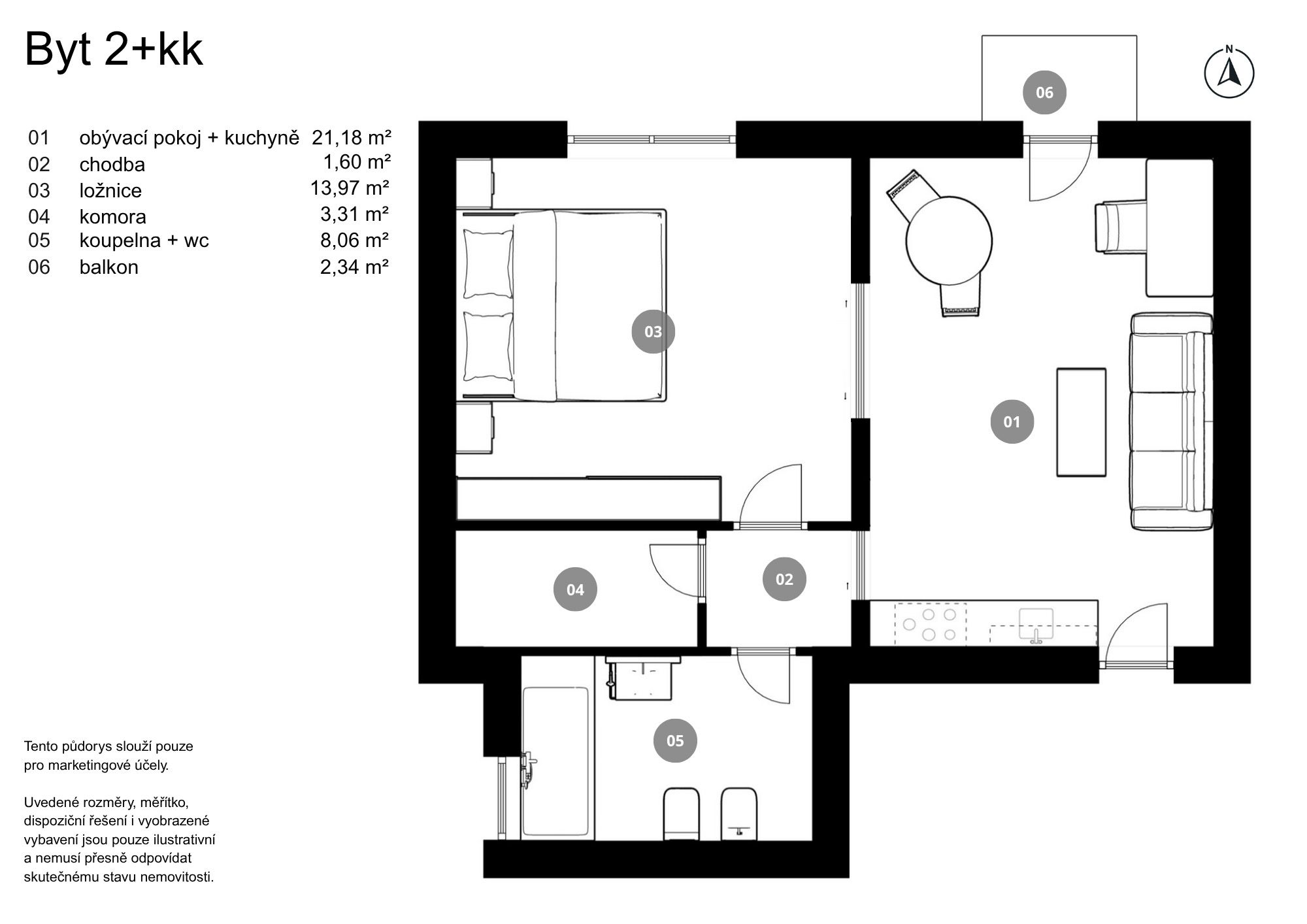 Byt má praktické dispoziční řešení – prostorný obývací pokoj s kuchyňským koutem navazující na ložnici, koupelnu s toaletou. K bytu náleží praktická komora, která poskytuje dostatek místa pro uskladnění věcí.
