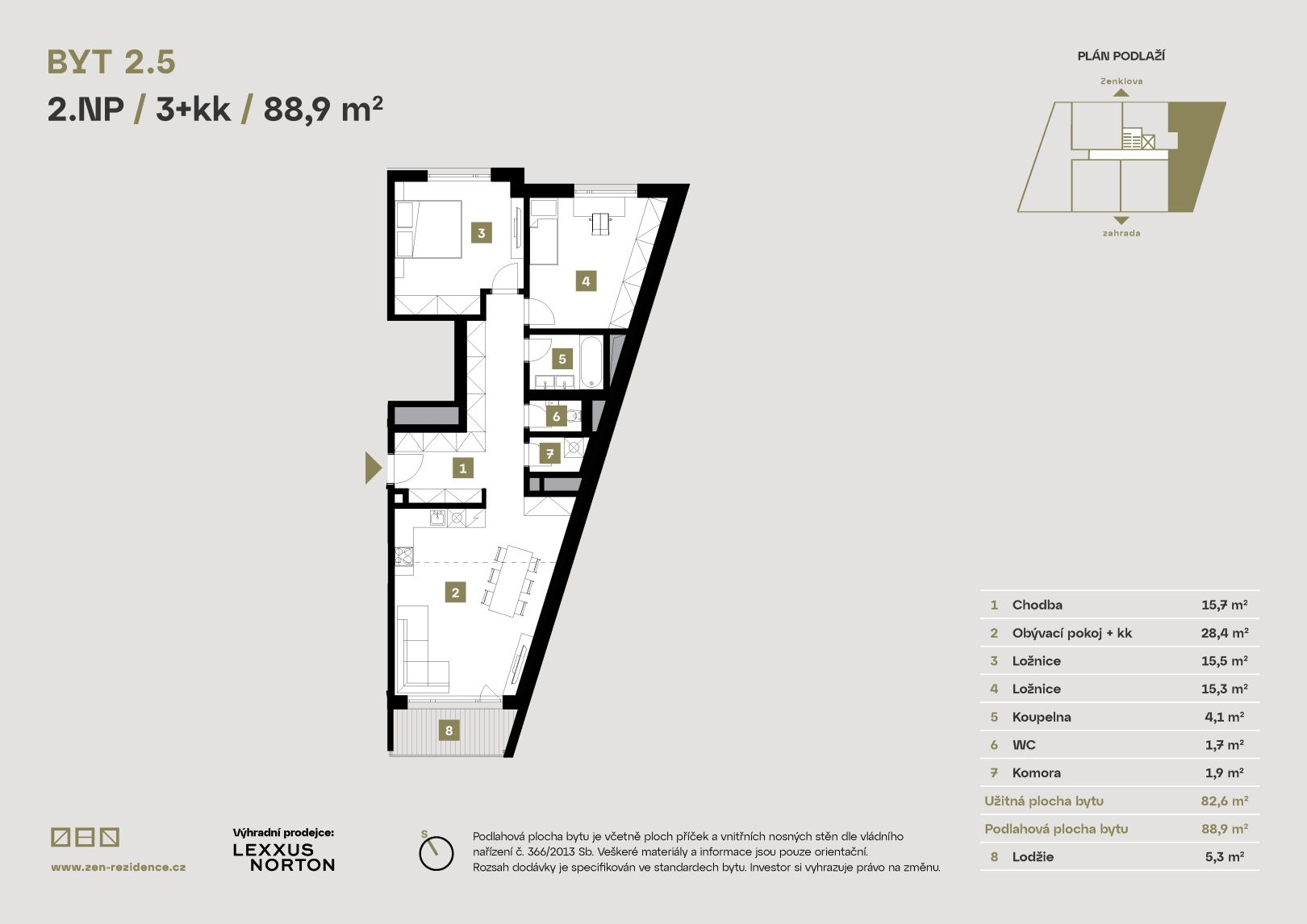 Nabízíme jedinečný byt 3+kk o celkové ploše 88,9 m², který se nachází ve druhém nadzemním podlaží nového rezidenčního projektu ZEN Rezidence v atraktivní lokalitě pražské Libně. Tento byt s promyšlenou dispozicí a prostornou lodžií (5,3 m²) orientovanou do klidného vnitrobloku je ideálním místem pro rodinné bydlení.