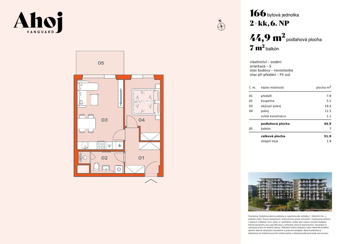 Moderní byt 2+kk s balkonem a hezkým otevřeným výhledem do okolí. Jedná se o tradiční 2+kk kde na vstupní halu navazují jednotlivé místnosti. V našem případě velmi pohodlná a prostorná koupelna se sprchovým koutem a integrovanou toaletou, obývací pokoj s kuchyňským koutem a ložnice. Na obývací pokoj navazuje poměrně prostorný balkon s výhledem do dalekého okolí. Jedná se o právě dokončenou novostavbu bytového domu zvaného Ahoj, který tvoří volný obytný tandem s exklusivní vedle stojící stavbou Vanguard. V rámci Vanguardu lze využít zdejší zázemí zahrnující bazén a wellness, jehož součástí je sauna a parní sauna. Oba domy jsou propojeny v úrovni 1.PP podzemní chodbou. K bytu přísluší sklepní kóje v 1.PP.