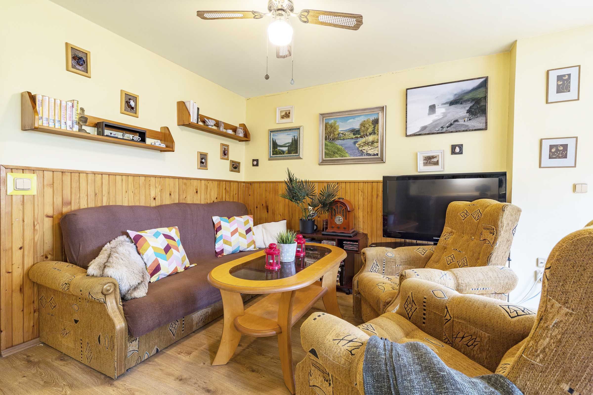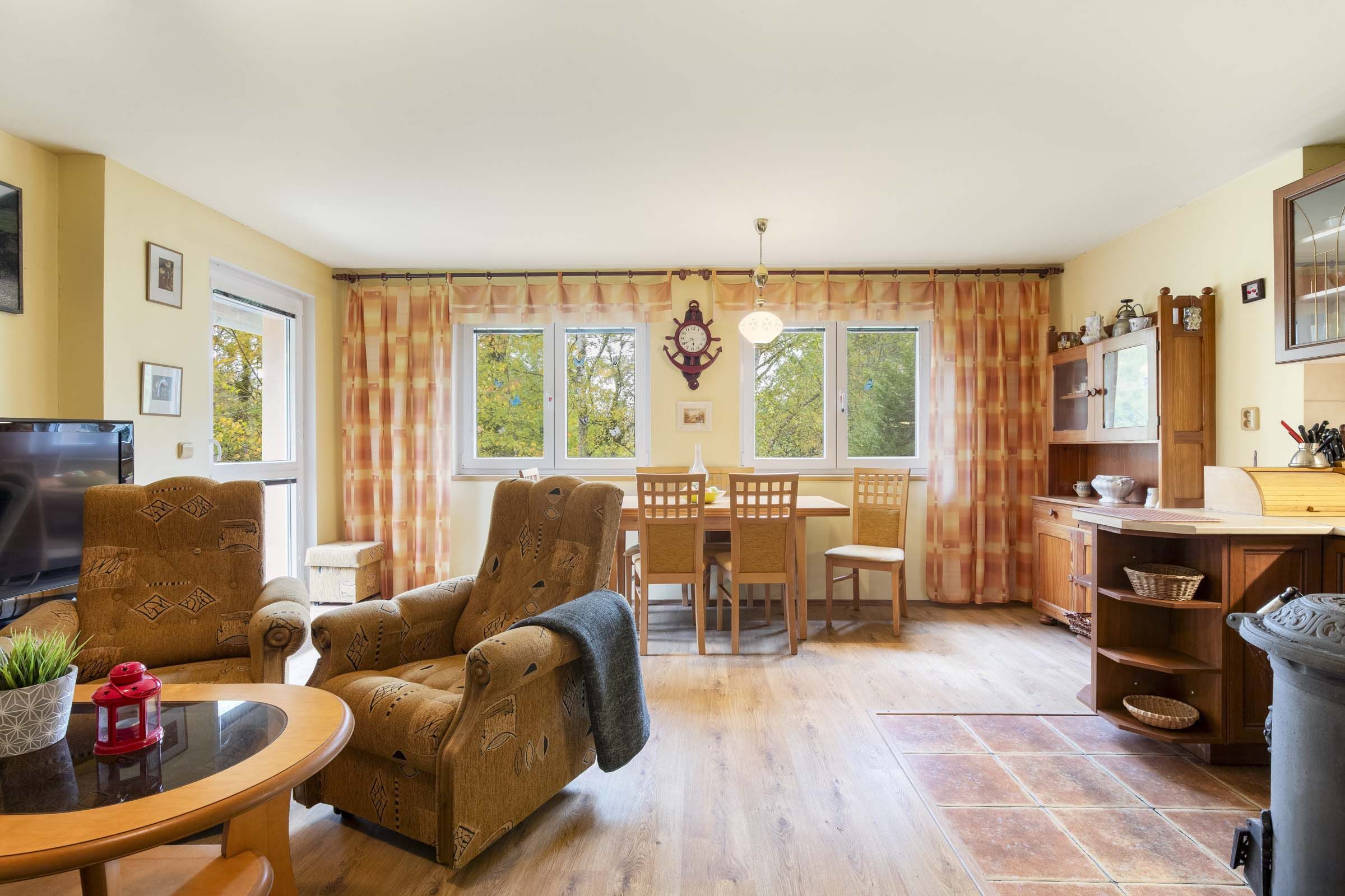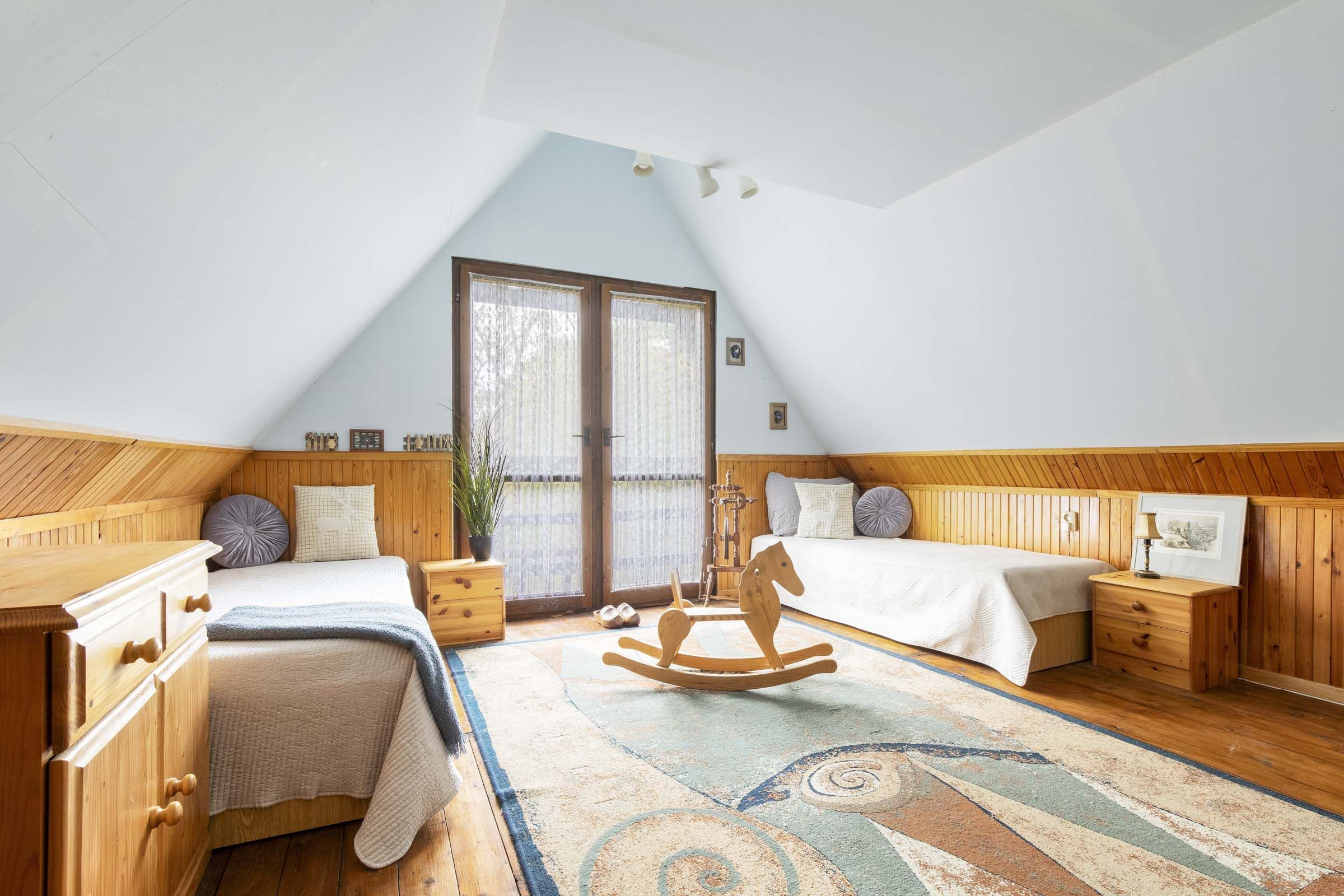 On a 290 sqm plot, the property includes a cottage with approx. 100 sqm of usable space, a 30 sqm garage currently used as a workshop and storage, and a terrace of the same size above the garage – perfect for summer dining or quiet mornings overlooking the greenery.