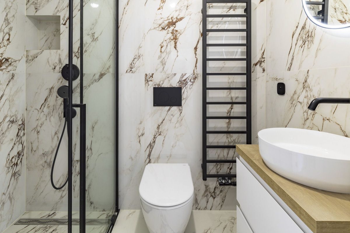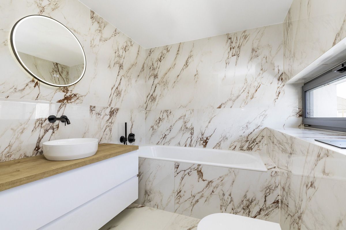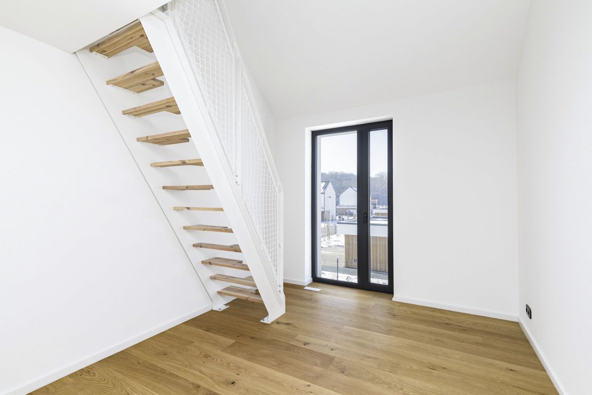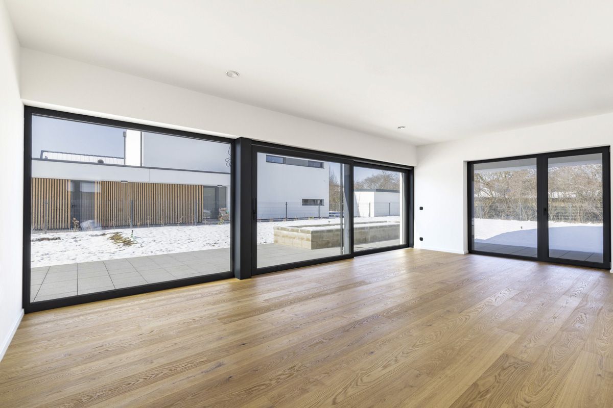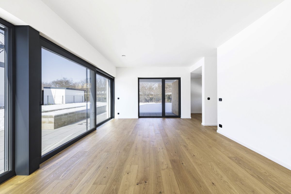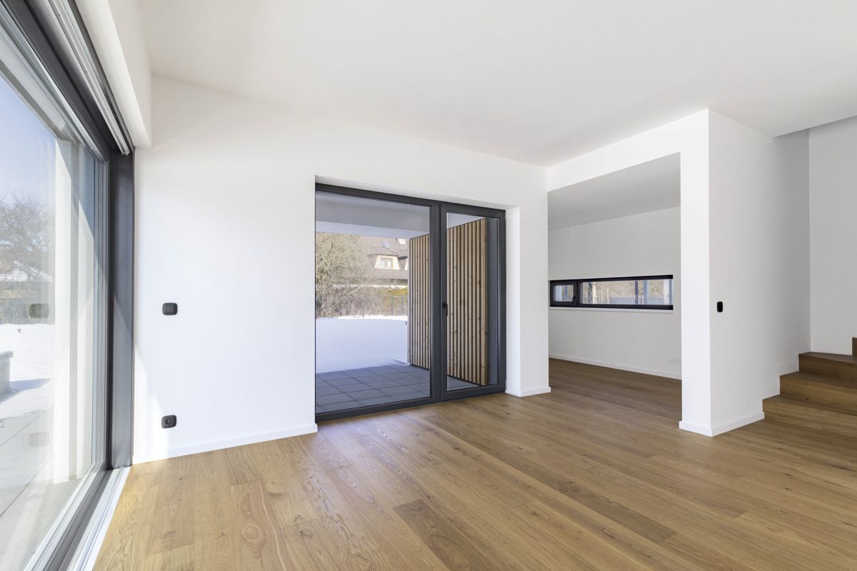 The house uses high-quality sanitary fittings from the GROHE brand, which stand out for their modern design and long lifespan. Bathtub faucets and a shower set from HANSGROHE give the bathrooms a premium look and maximum comfort. In addition, the bathrooms are lined with large-format tiles that accentuate the luxurious look of the interior. The high standard of living is underlined by the high-quality two-layer wooden flooring. To enhance energy efficiency, windows with insulating triple glazing are installed, ensuring excellent thermal and sound insulation.