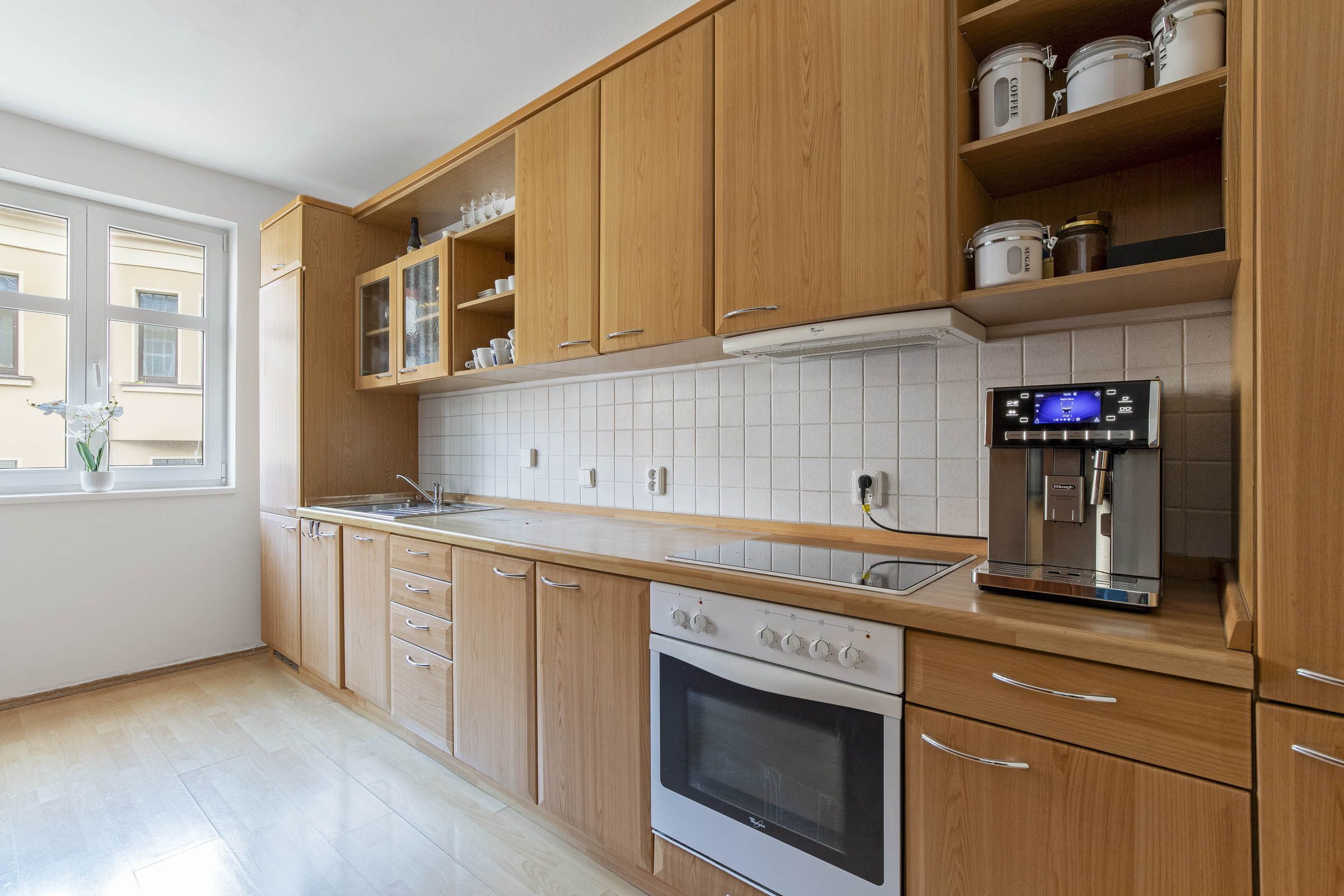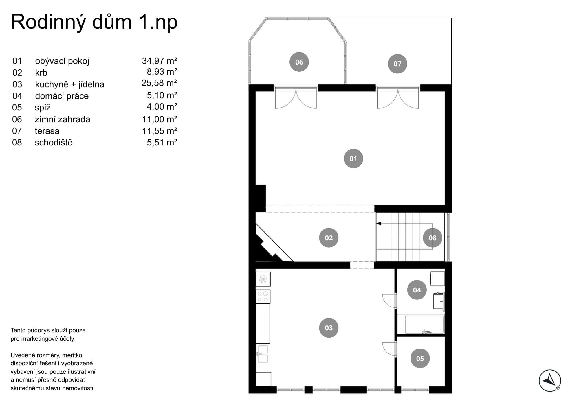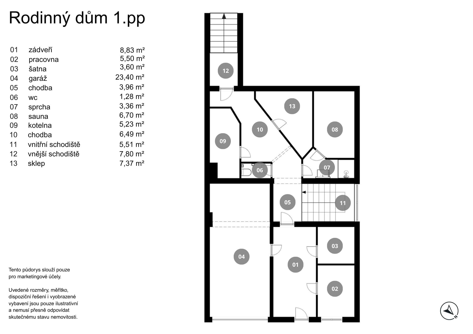 V přízemí domu se nachází garáž pro jedno vozidlo, dále vstupní hala, kde je možné umístění recepce. V přízemí je k dispozici spoustu úložného prostoru, dále také sauna a vstup na přilehlou zahradu. V prvním nadzemním podlaží naleznete prostornou kuchyň, velký obývací pokoj a zimní zahradu, ze které je také možnost vstoupit na zahradu. Ve 2. a 3.NP se nachází celkem 5 pokojů, které mohou být využity jako ložnice nebo kanceláře. Okna v celém domě jsou orientovány do ulice i do zahrady.