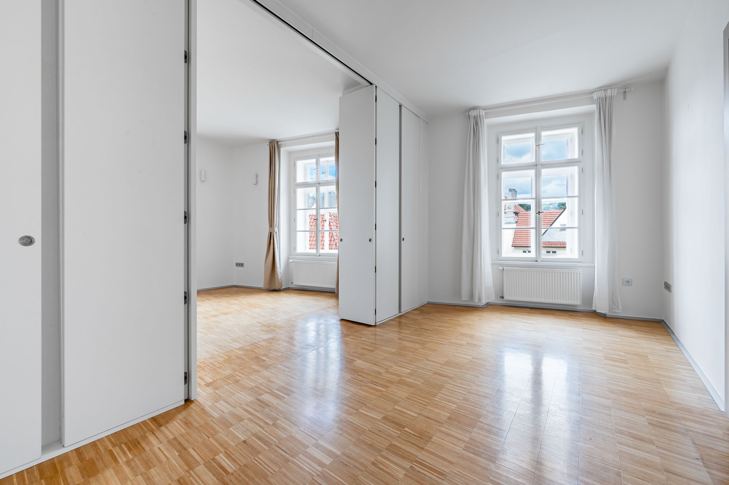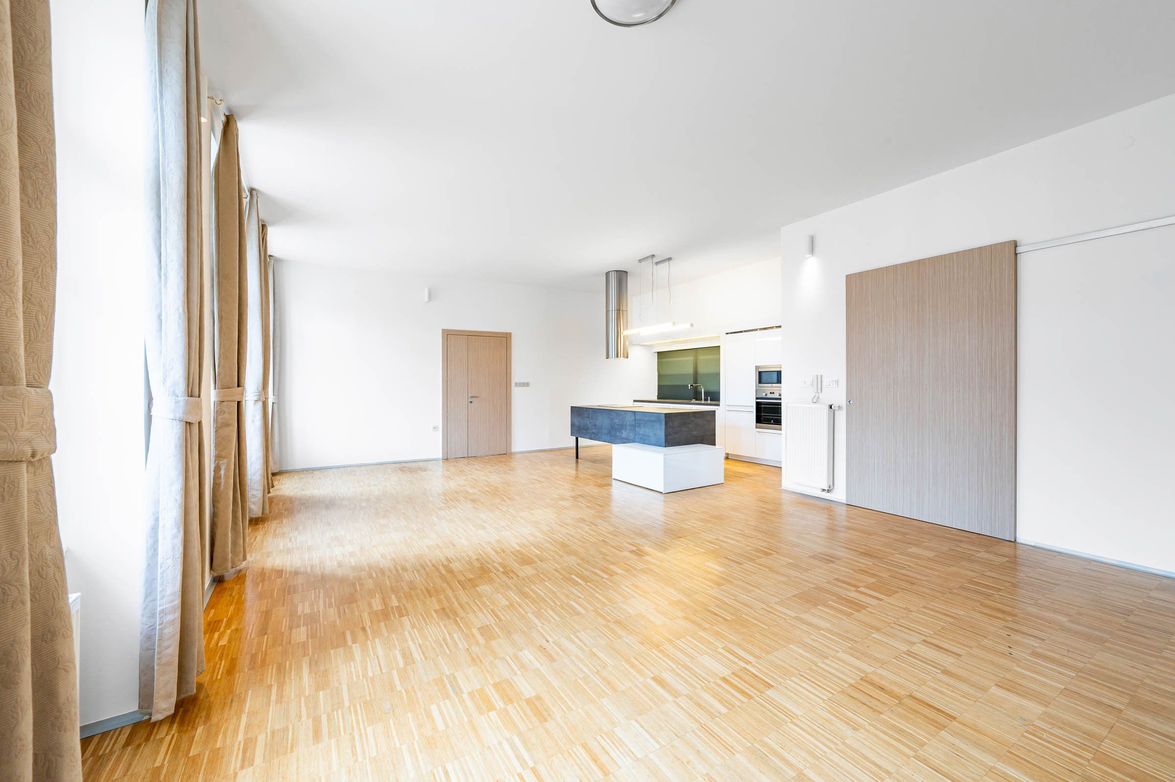 We present to you a bright and airy 3-bedroom apartment with an open-plan living space (4-bedroom) with a total area of 145 sqm, situated on the 3rd floor of a historic brick building just a few steps from Prague Castle and Petrin Gardens. This exclusive property will enchant you with its stunning views and the inimitable atmosphere of one of Prague’s most prestigious neighborhoods. The apartment’s layout is highly practical. A spacious south-facing living room flows seamlessly into a custom-made Hanak kitchen with timeless design. The master bedroom features a private walk-in closet and an en-suite bathroom with a shower. Two interconnected bedrooms, separated by modern glass sliding doors, can serve as children’s rooms, a study, or a guest room. The apartment also includes two additional bathrooms (one with a bathtub, the other with a shower and WC) and a spacious entrance hall.