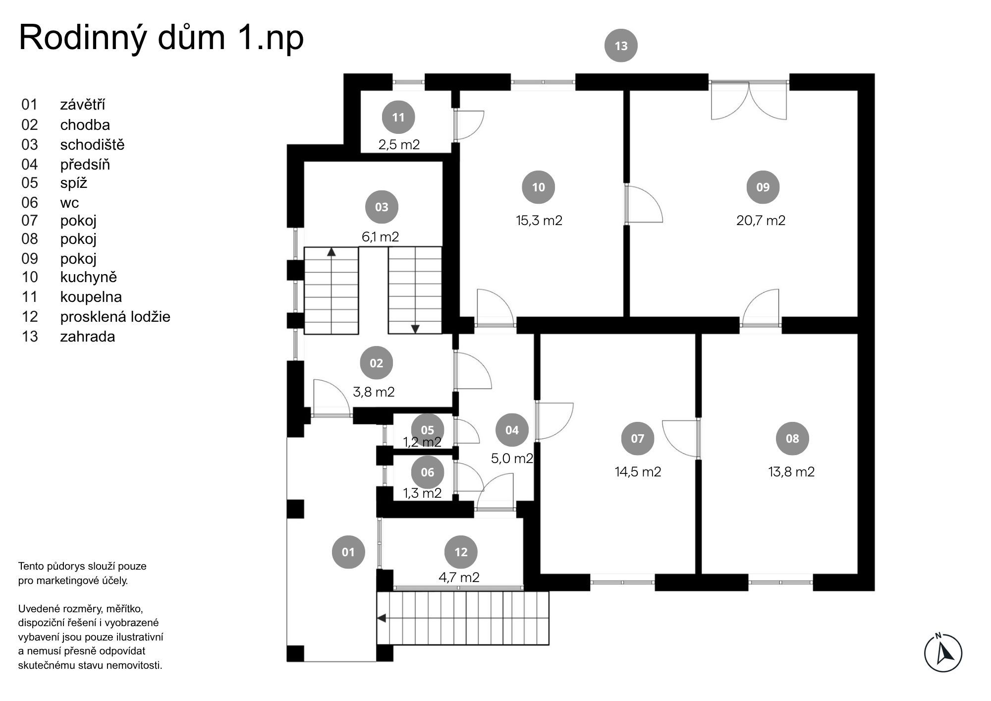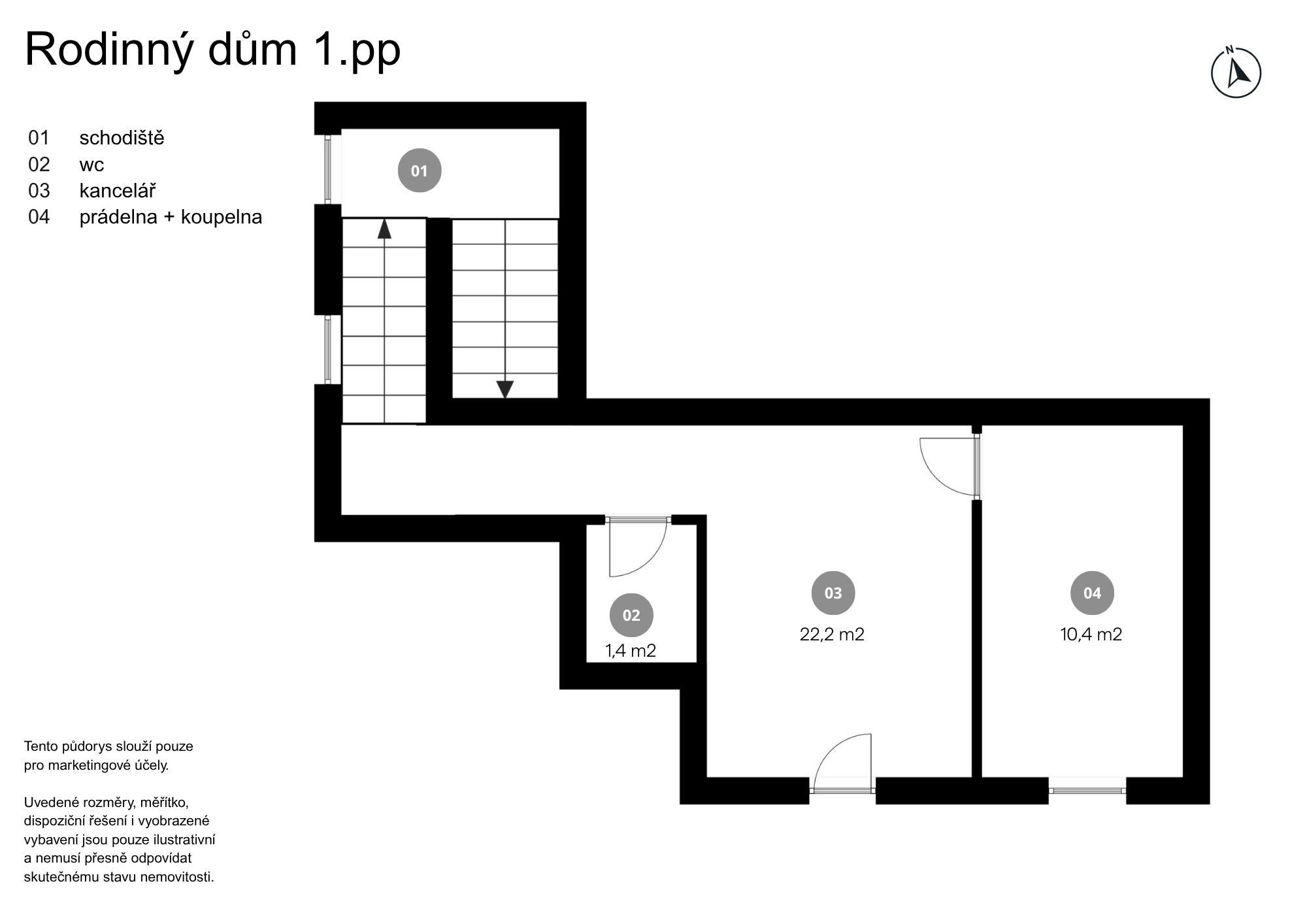 Přízemí domu tvoří částečně zapuštěný suterén, který je nyní upraven jako kancelář s vlastním sociálním zařízením a samostatnou prádelnou se sprchovým koutem a vanou. Suterén má i zcela samostatný vstup a může být případně i menším studiovým bytem.