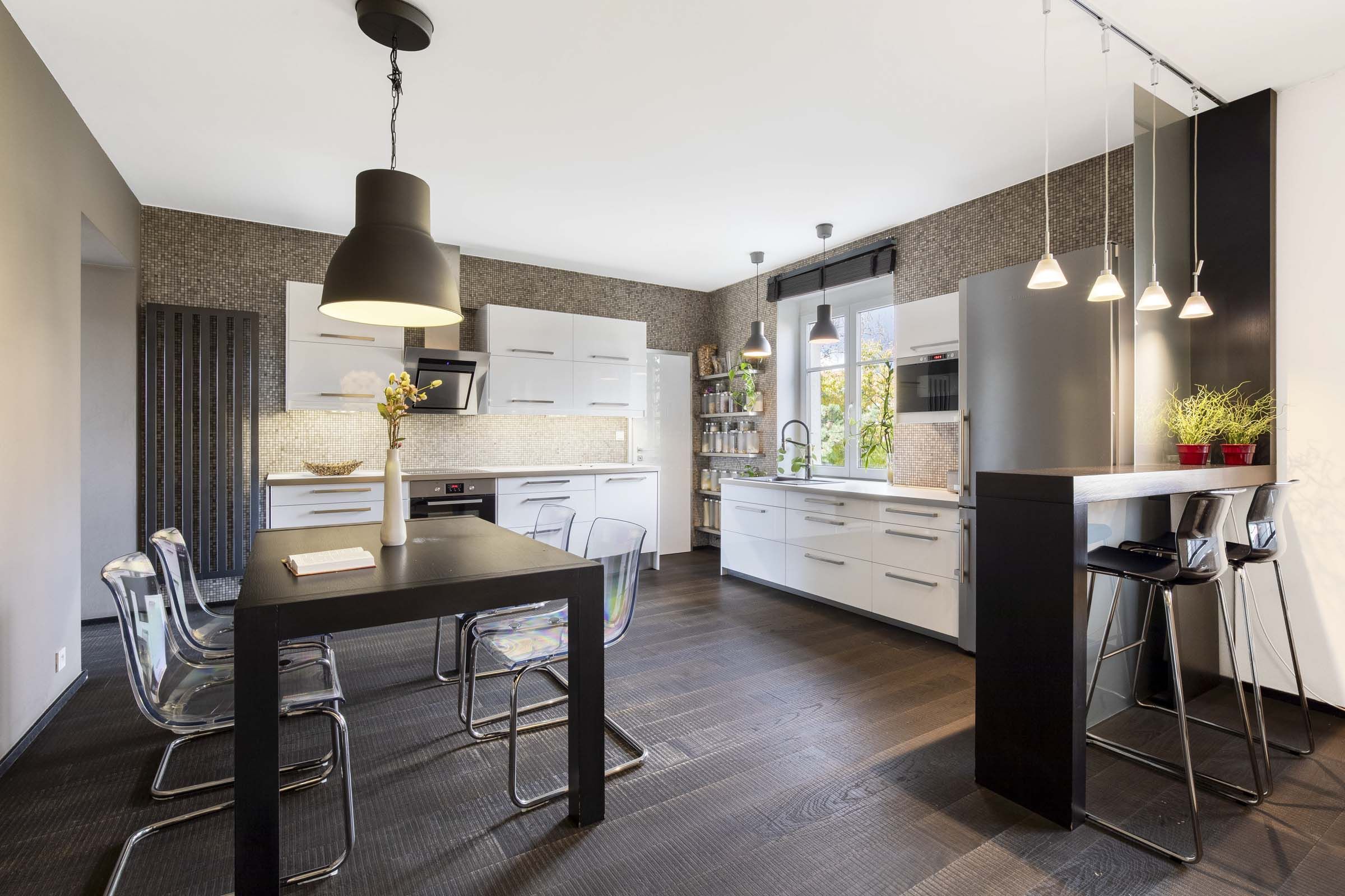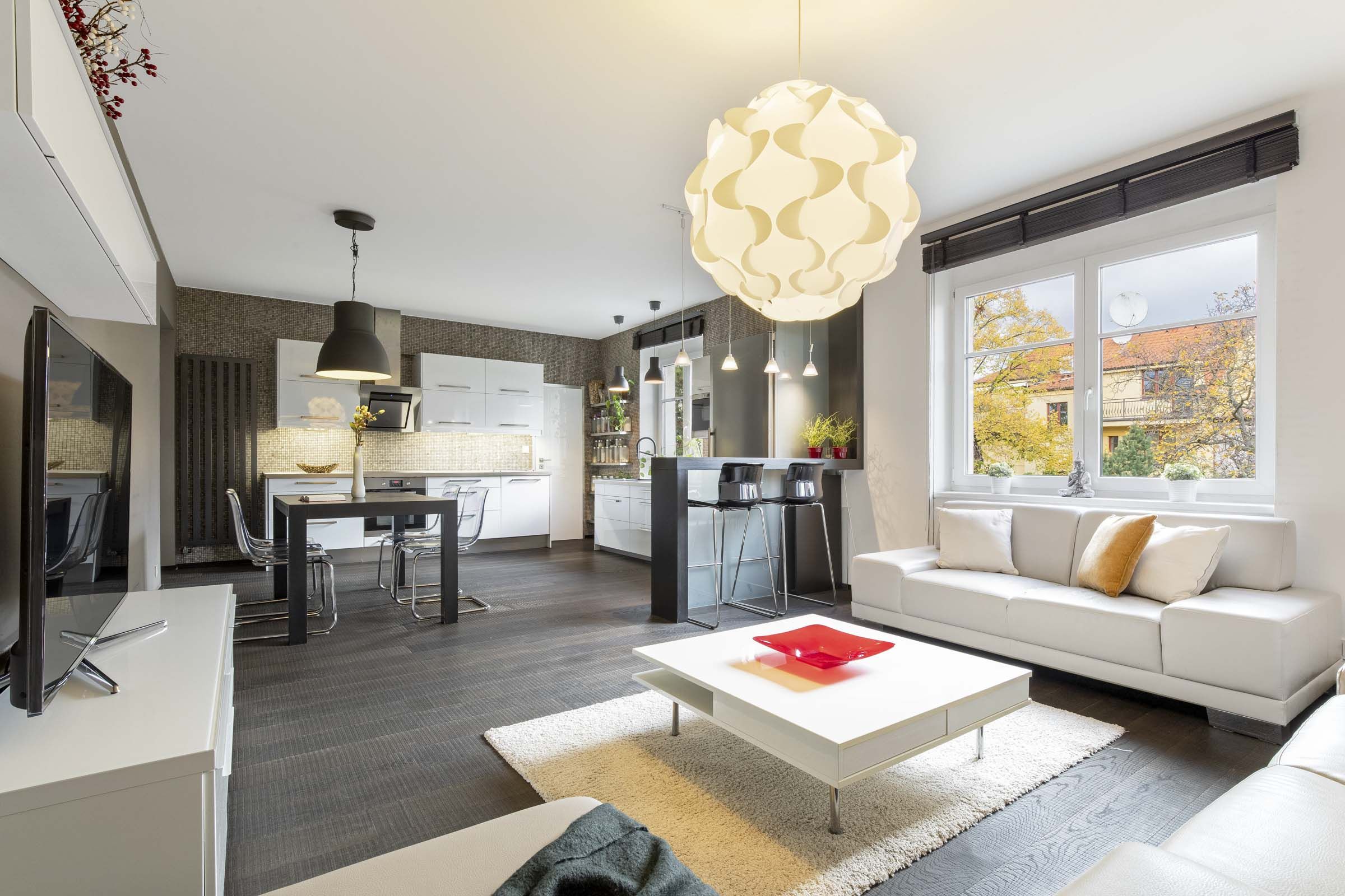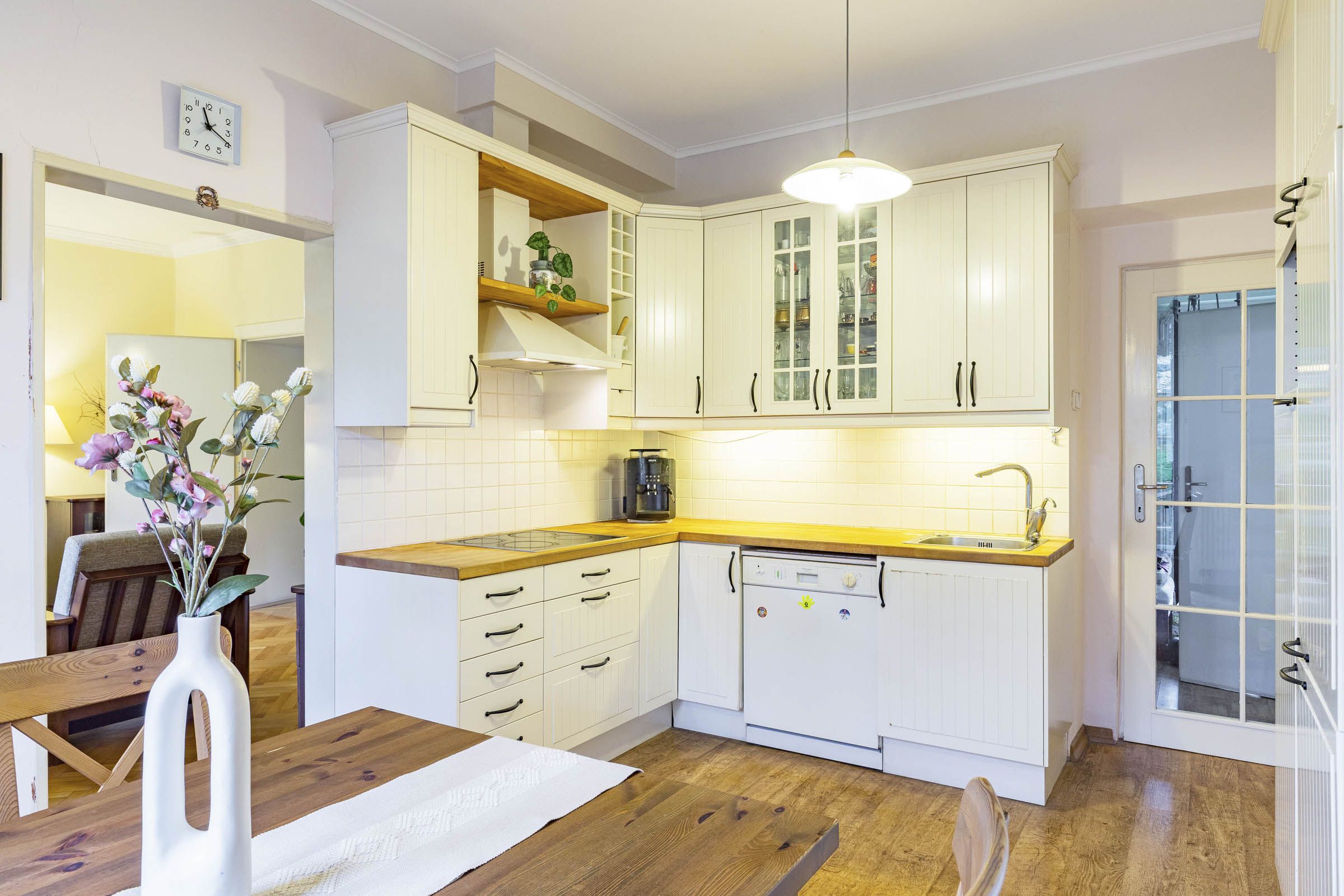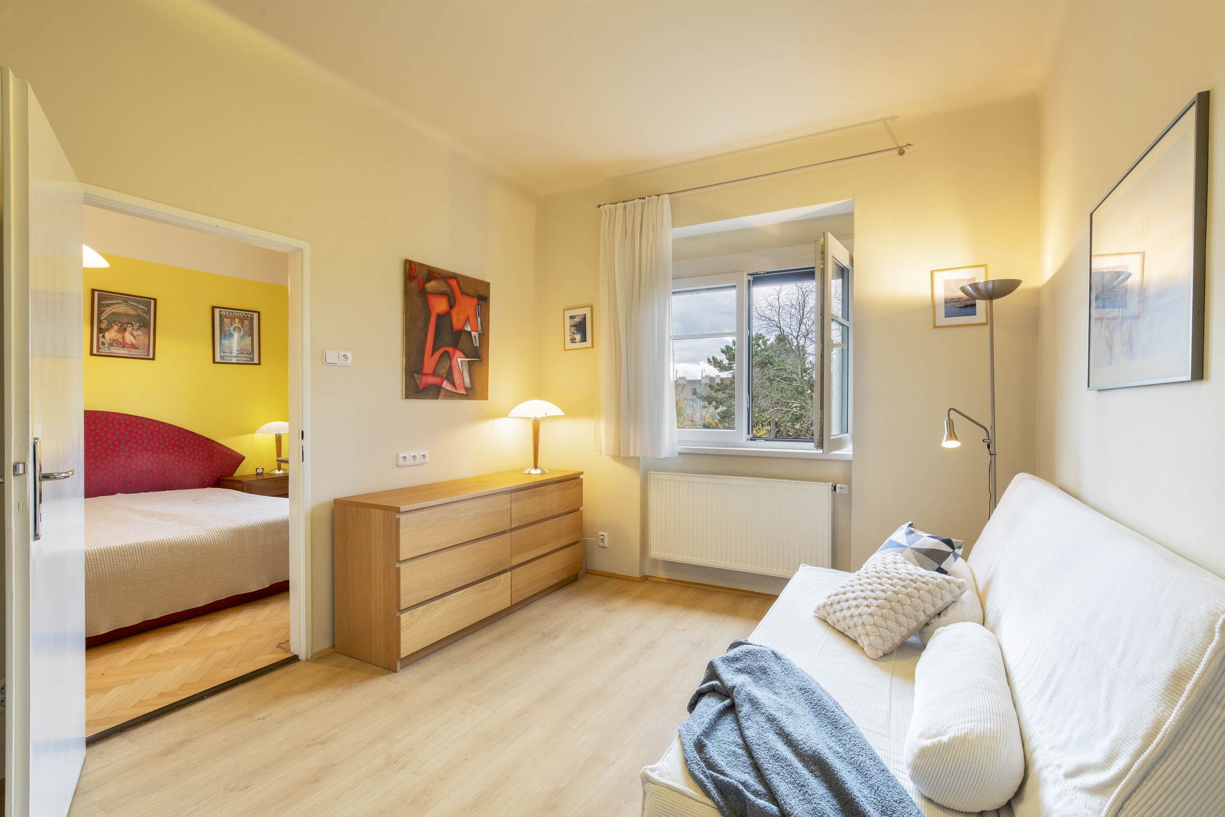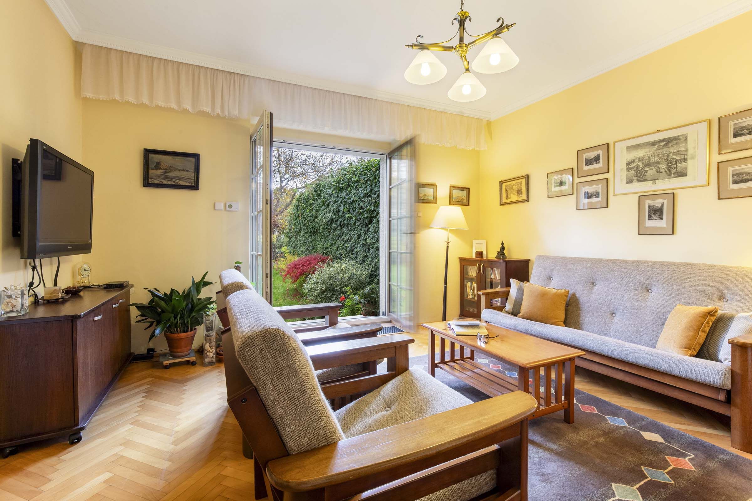 Ve druhém podlaží se nachází byt po kompletní rekonstrukci. Otevřený obývací prostor s moderní vybavenou kuchyní a jídelnou je orientován také do zahrady, zatímco dvě ložnice a koupelna nabízejí výhled do parku.