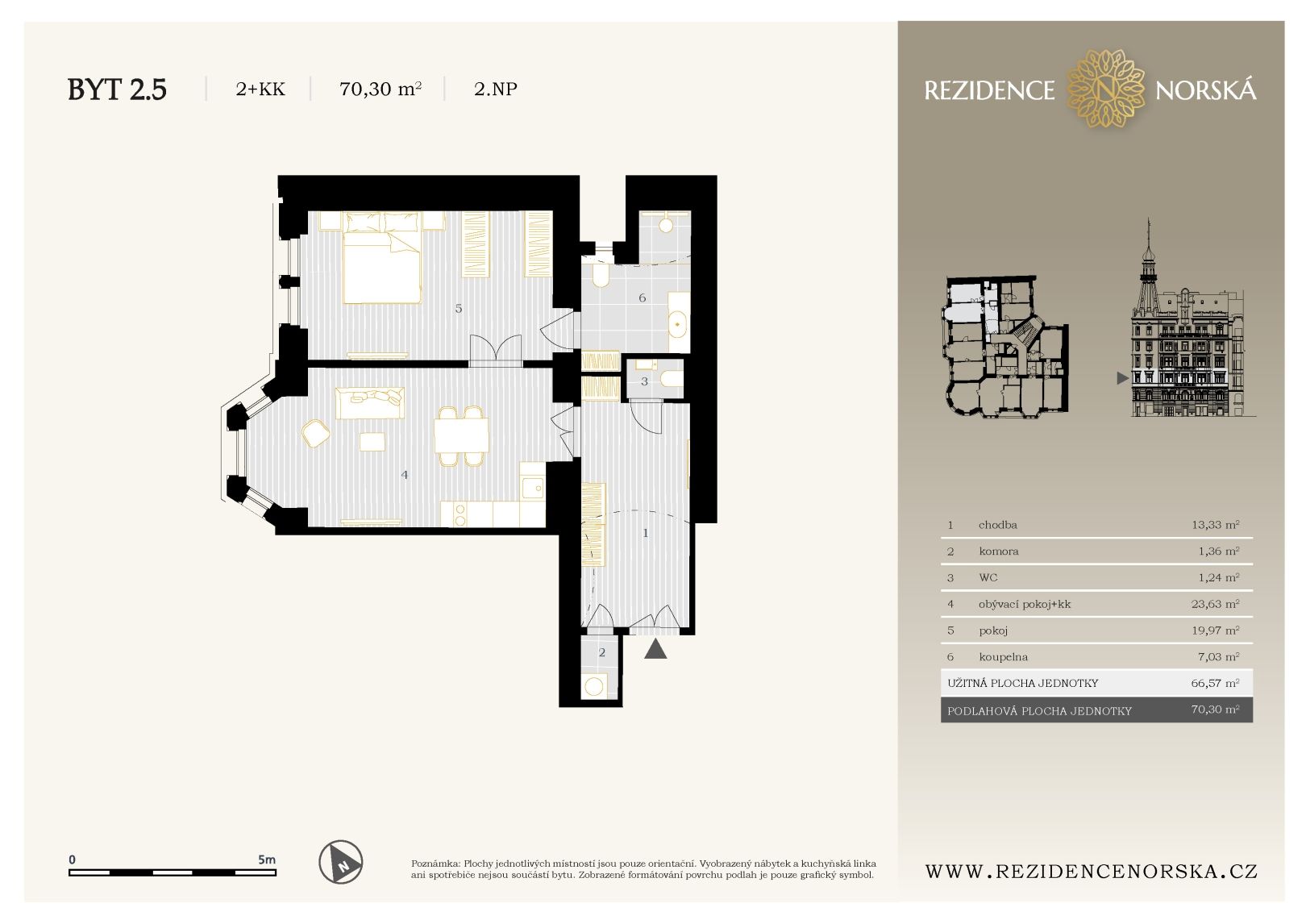 Představujeme byt 2+kk o podlahové ploše 70,30 m², umístěný ve 2. nadzemní podlaží secesní rezidence. Dispozice zahrnuje vstupní chodbu s úložnými prostory, komoru, samostatné WC, koupelnu, prostorný obývací pokoj s kuchyňským koutem a samostatnou ložnici orientovanou do klidné části domu. Díky velkorysé výměře, praktickému řešení a atraktivní lokalitě je byt ideální pro vlastní bydlení i jako investiční příležitost.