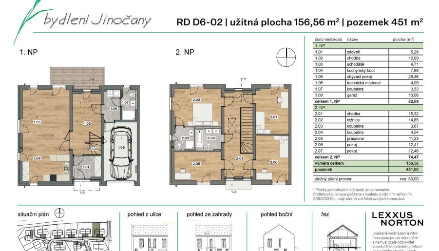 Dům s dispozicí 5+kk o celkové ploše 156,56 m² nabízí čtyři ložnice, tři koupelny, prostorný obývací pokoj s kuchyňským koutem, technickou místnost a dvě chodby. K domu náleží vlastní garáž, sedlová střecha s půdou a pozemek o velikosti 451 m².
