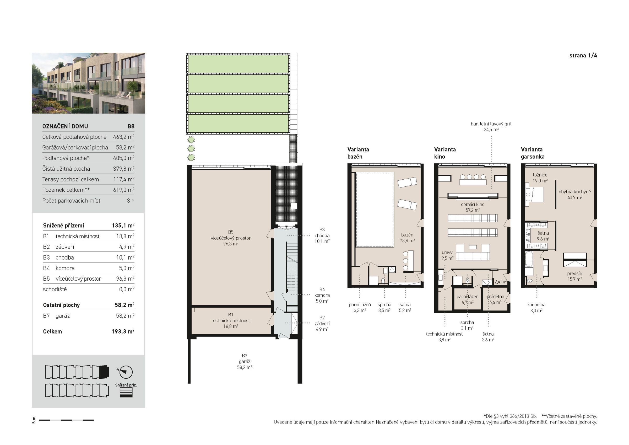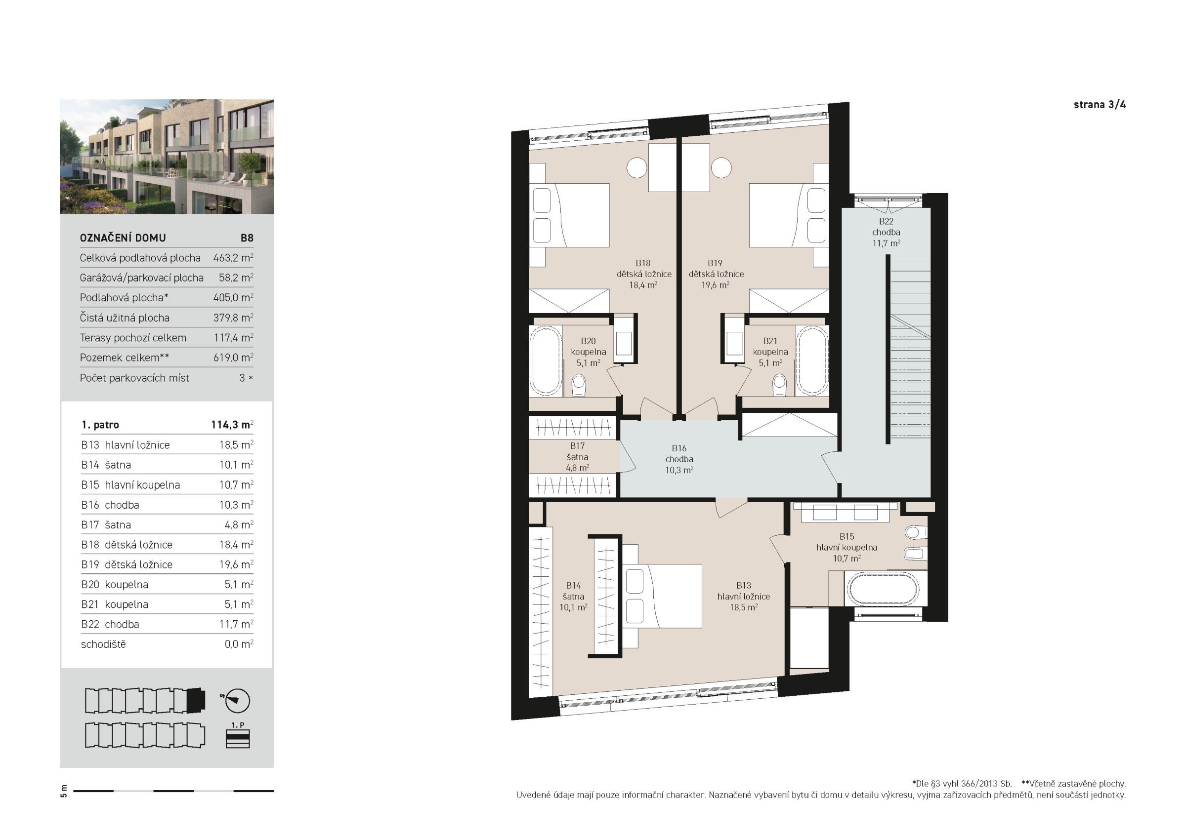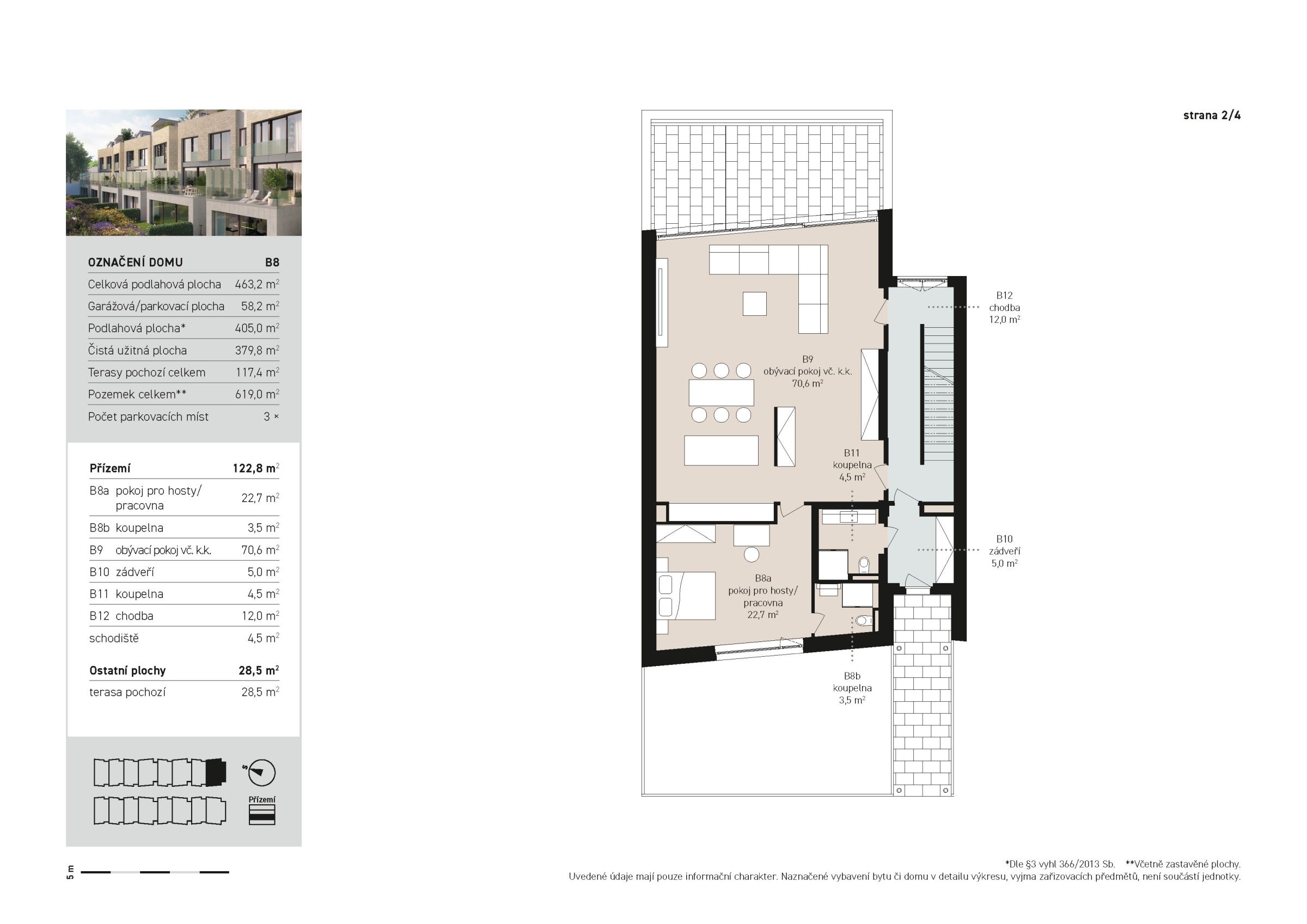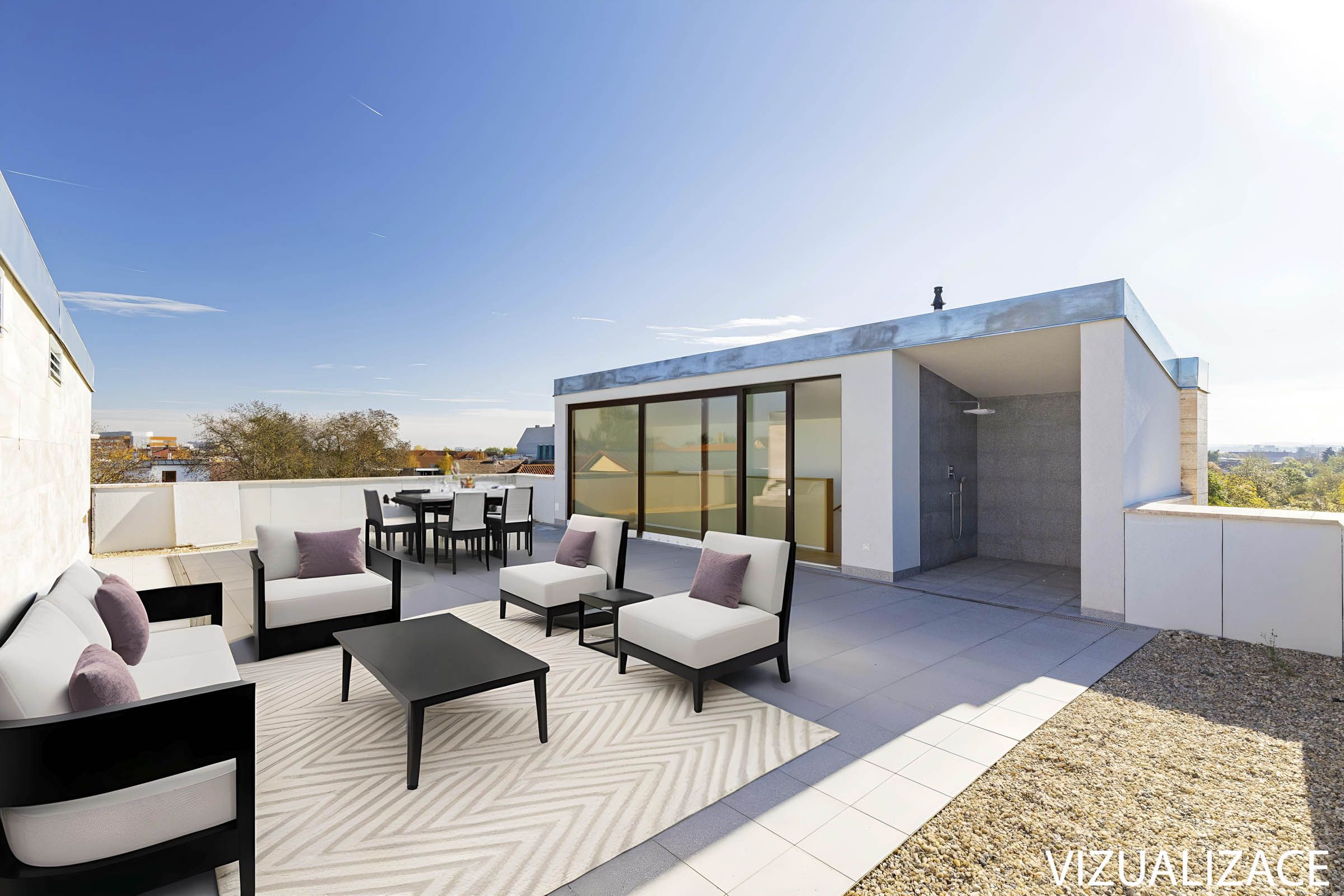 K prodeji nabízíme výjimečnou rodinnou řadovou vilu 6+kk s celkovou podlahovou plochou 405 m² a třemi parkovacími stáními v podzemních garážích. Tento promyšleně navržený dům je ideální pro rodiny hledající maximální komfort a flexibilitu prostoru. Přízemí domu nabízí velkorysý obývací prostor s přípravou pro kuchyňský kout (70,6 m²) s přímým výstupem na terasu s výhledem do zahrady. V přízemí je dále k dispozici pokoj pro hosty s vlastní koupelnou, který může sloužit také jako pracovna a další samostatná koupelna s toaletou. První patro disponuje hlavní ložnicí 18,5 m² s vlastní koupelnou a šatnou, 2 prostornými ložnicemi (18,5 m², 19,6 m²) s vlastními koupelnami a další samostatnou šatnou. Korunou domu je krásná střešní terasa 84 m² s výhledy do okolní zástavby a zeleně, kterou lze využívat celoročně.