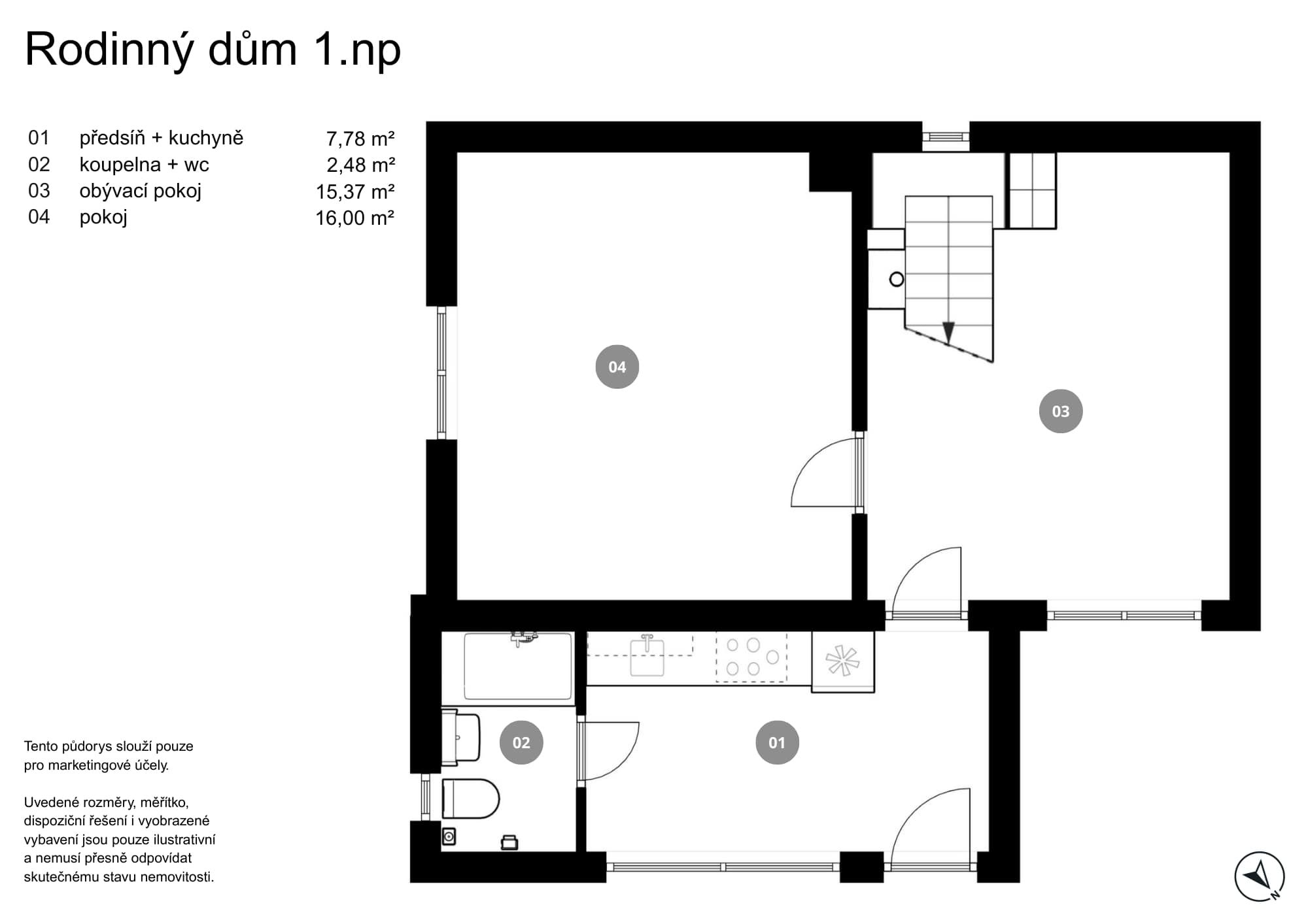 On a plot of 850 m² there is a smaller two-storey house after renovation, intended for permanent living, and a garage with access from the street. The current 3+1 layout offers on the ground floor a kitchen, bathroom with shower, bedroom, and a living room with fireplace. In the attic there is a bedroom with a view of the garden, a walk-in closet, and a utility room. A terrace with seating pleasantly connects the house with the garden. Parking is possible both in the garage and directly on the plot.