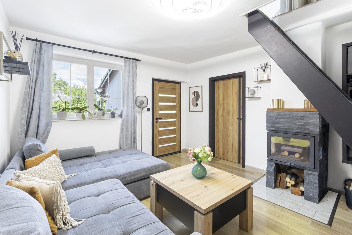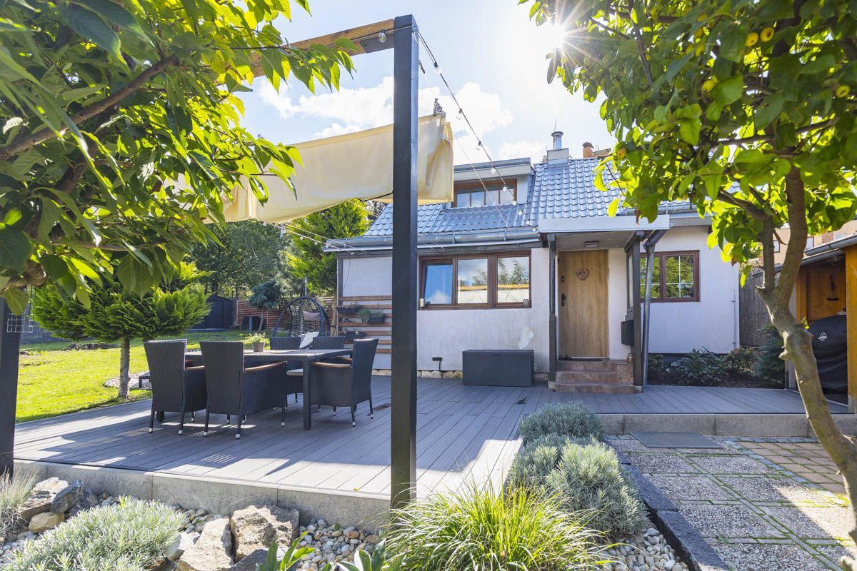 Na pozemku o rozloze 850 m² se nachází menší dvoupodlažní dům po rekonstrukci určený k trvalému bydlení a garáž s vjezdem z ulice. Současná dispozice 3+1 nabízí v přízemí kuchyň, koupelnu se sprchovým koutem, ložnici a obývací pokoj s krbem. V podkroví se nachází ložnice s výhledem do zahrady, šatna a technická místnost. Terasa se sezením příjemně propojuje dům se zahradou. Parkování je možné jak v garáži, tak přímo na pozemku.