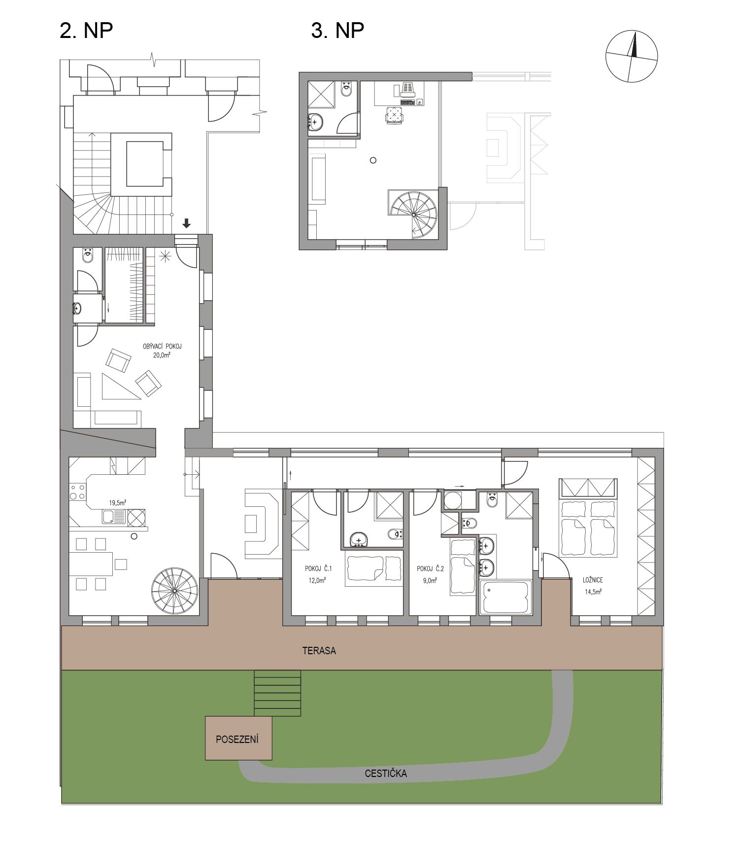 In a separate part of the apartment, there are three bedrooms, all with windows facing the garden. The dominant feature is the master bedroom with its own bathroom equipped with both a bathtub and a shower and an enclosed toilet. French doors from the bedroom lead directly to the terrace and the garden. The other bedroom is accessible from the hallway, which also leads to the second bathroom with a shower and toilet. The third room is smaller and suitable, for example, as a children’s room or workplace. From the hallway, there is also access to a utility nook for a washing machine with storage space.