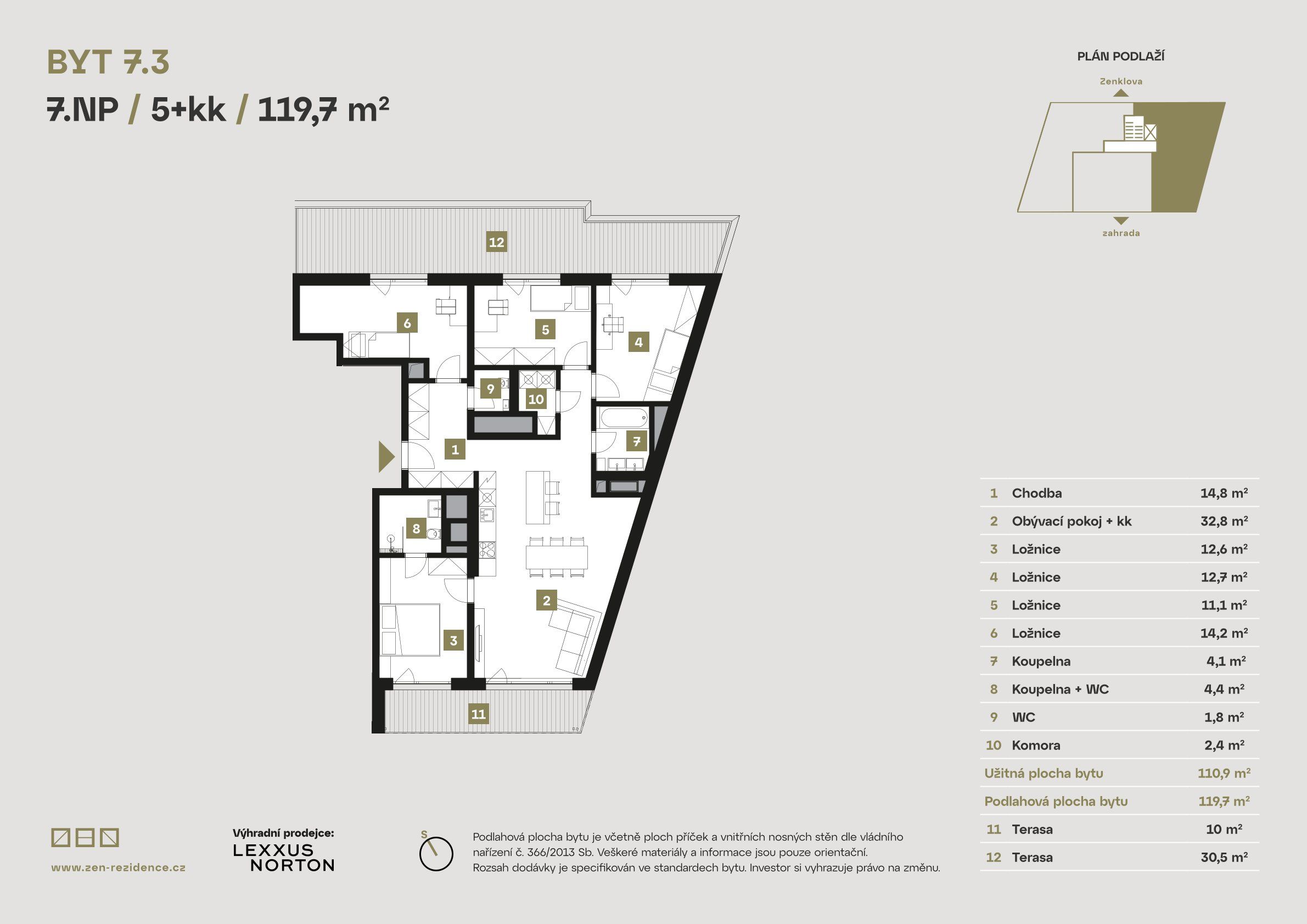 Prodej výjimečného bytu 5+kk o celkové ploše 119,8 m², který se nachází v posledním, 7. nadzemním podlaží prestižního rezidenčního projektu ZEN Rezidence v pražské Libni. Tento byt s promyšlenou dispozicí a dvěma prostornými terasami (30,5 m² a 10 m²) je symbolem moderního a luxusního bydlení, které vás okouzlí panoramatickými výhledy na centrum Prahy.