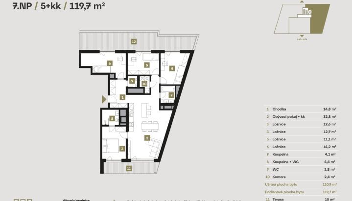 Byt dále zahrnuje 4 ložnice – hlavní ložnice (12,6 m²) disponuje vlastní koupelnou s toaletou a přístupem na jižní terasu. Další tři prostorné ložnice (12,7 m², 11,1 m², 14,2 m²) nabízejí přístup na druhou terasu. Součástí bytu je druhá koupelna s vanou, samostatná toaleta a praktická komora.