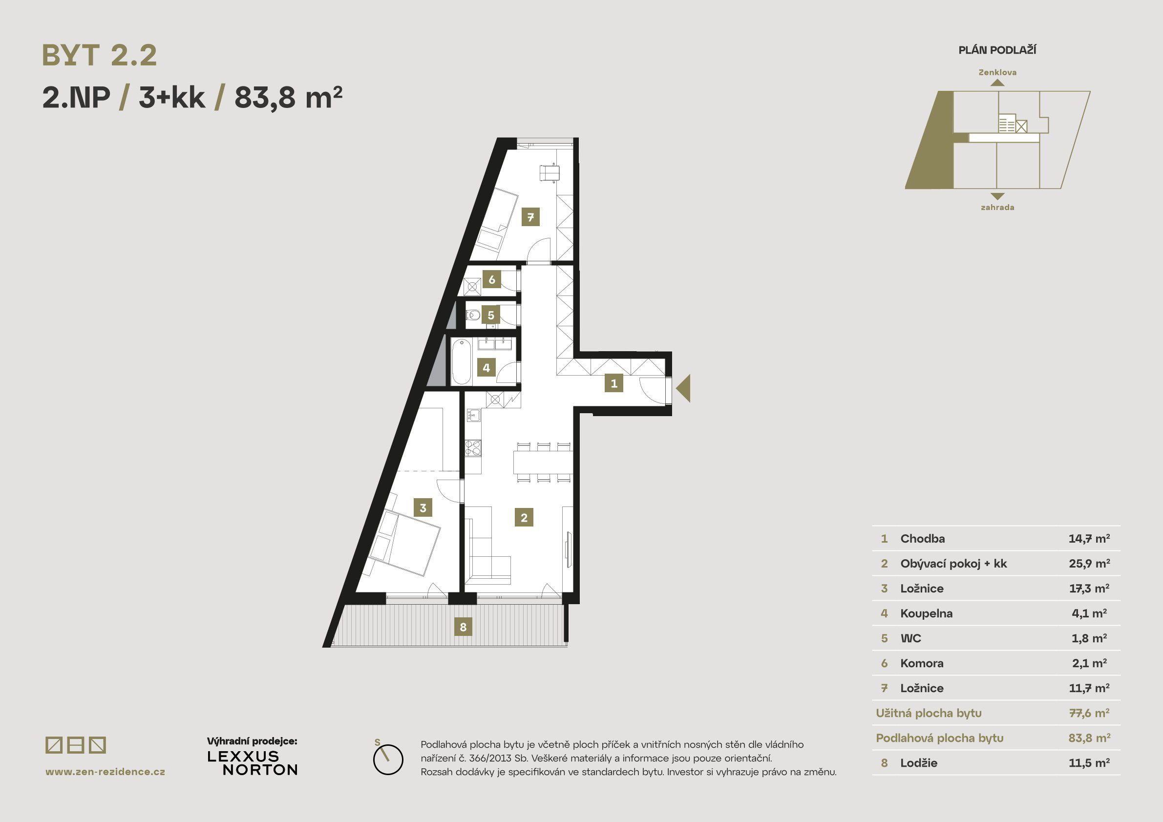 Nabízíme jedinečný byt 3+kk o celkové ploše 83,8 m², který se nachází ve druhém nadzemním podlaží nového rezidenčního projektu ZEN Rezidence v atraktivní lokalitě pražské Libně. Tento byt s promyšlenou dispozicí a prostornou lodžií (11,5 m²) orientovanou do klidného vnitrobloku je ideálním místem pro rodinné bydlení.