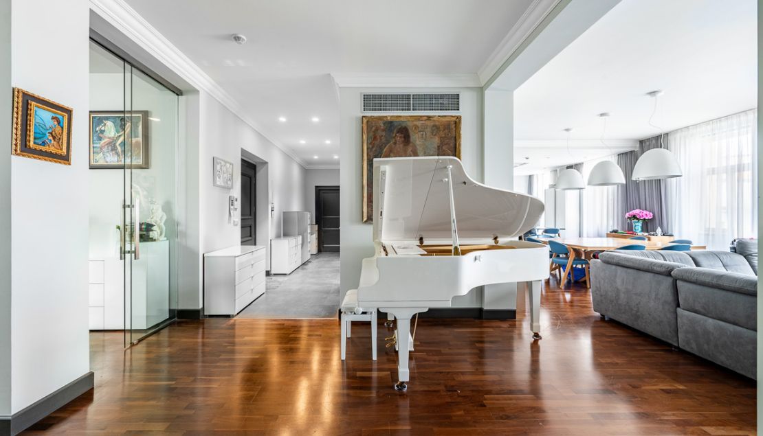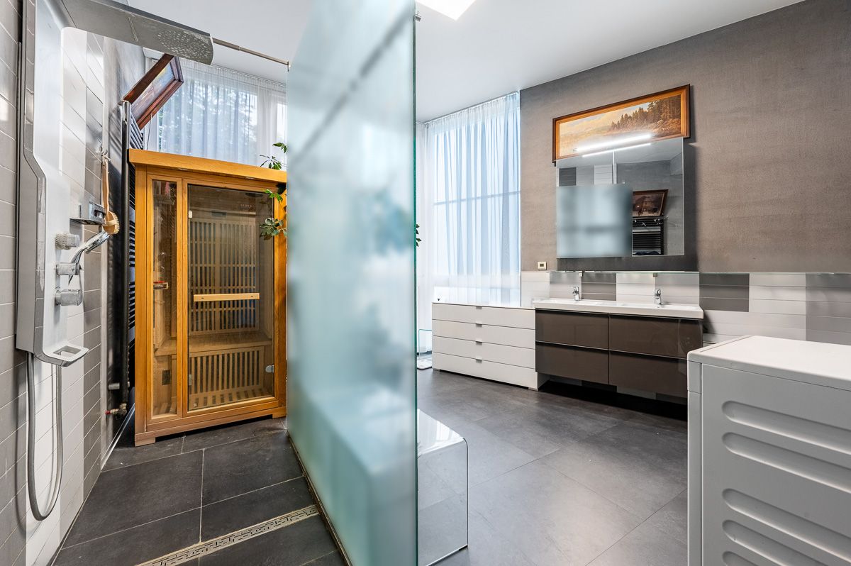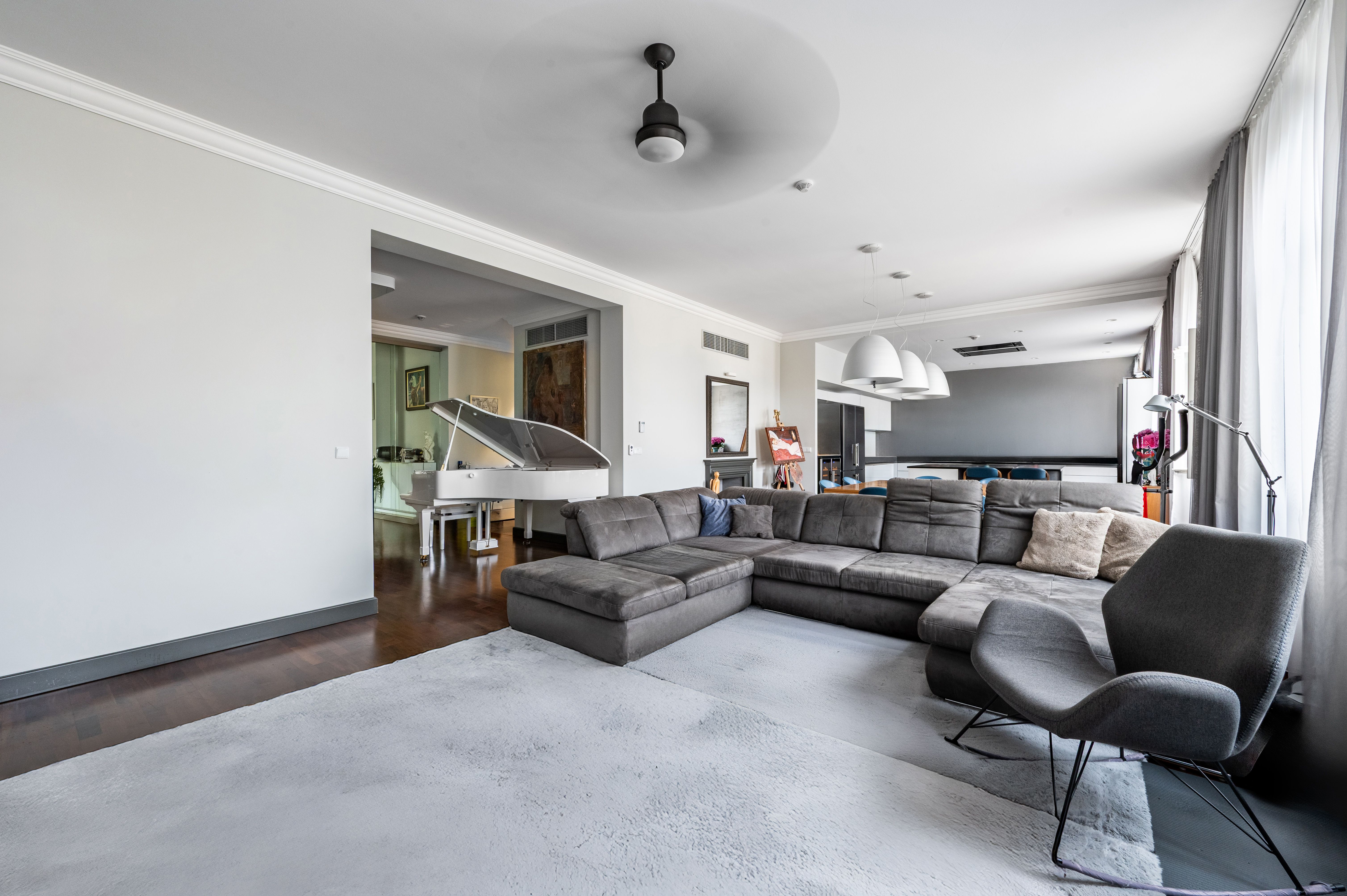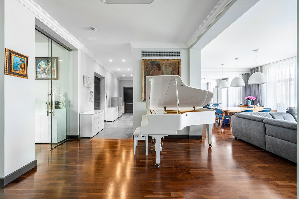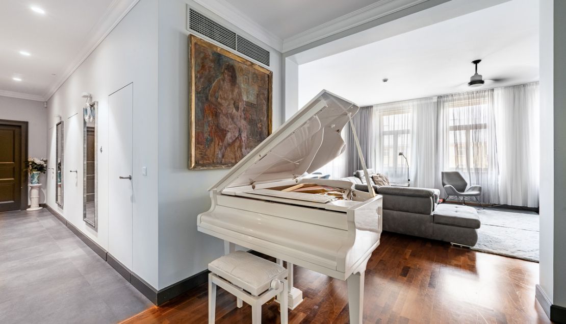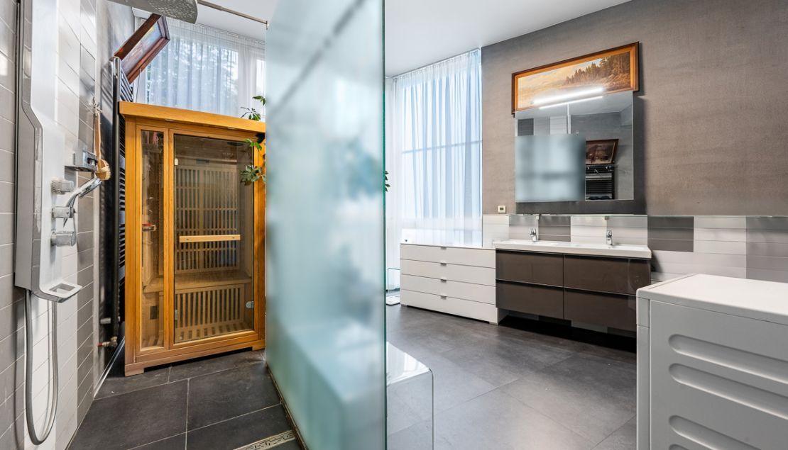 Kuchyňský kout je vybaven sklokeramickou deskou, troubou, lednicí, mrazákem, mikrovlnnou troubou a myčkou nádobí. Byt disponuje dvěma koupelnami - první se sprchovým koutem, toaletou, bidetem a saunou, druhá se sprchovým koutem, vanou a toaletou a samostatnou toaletou. K dispozici je také pračka a sušička. Podlahy tvoří kombinace plovoucí podlahy a dlažby.