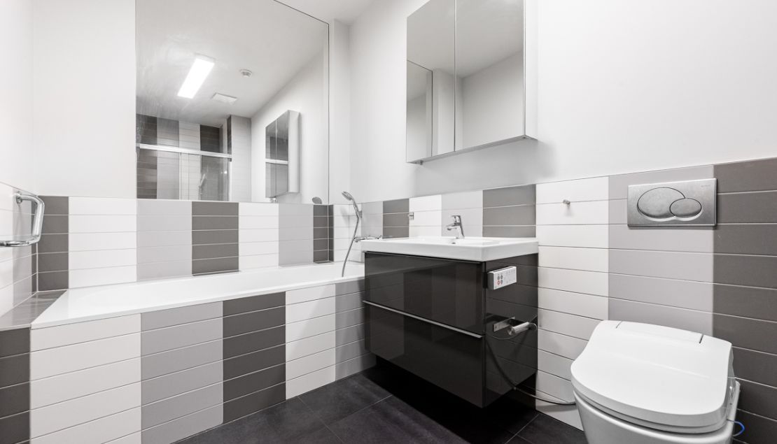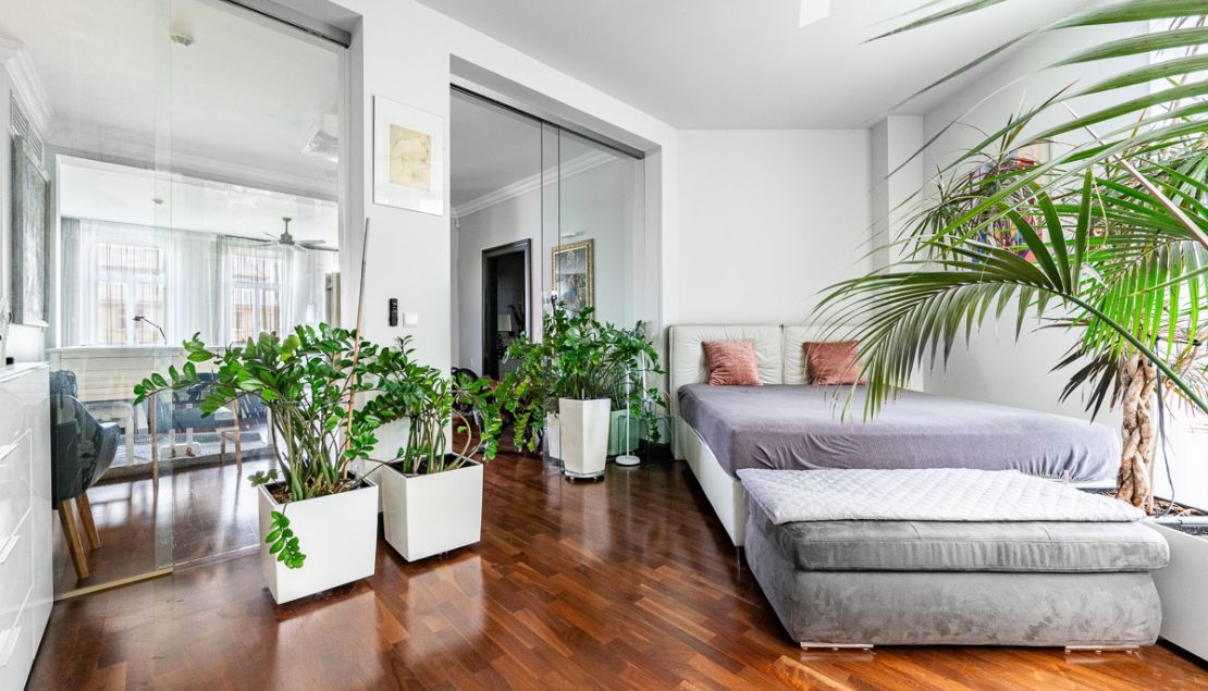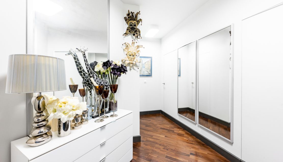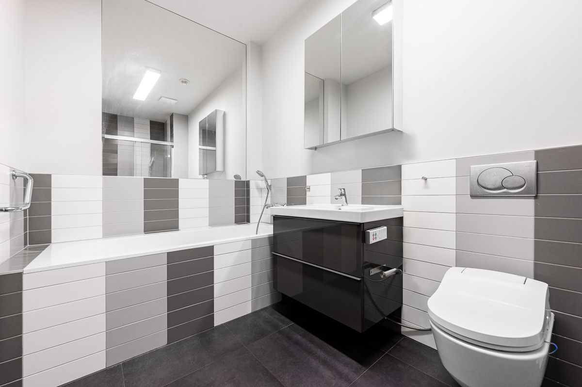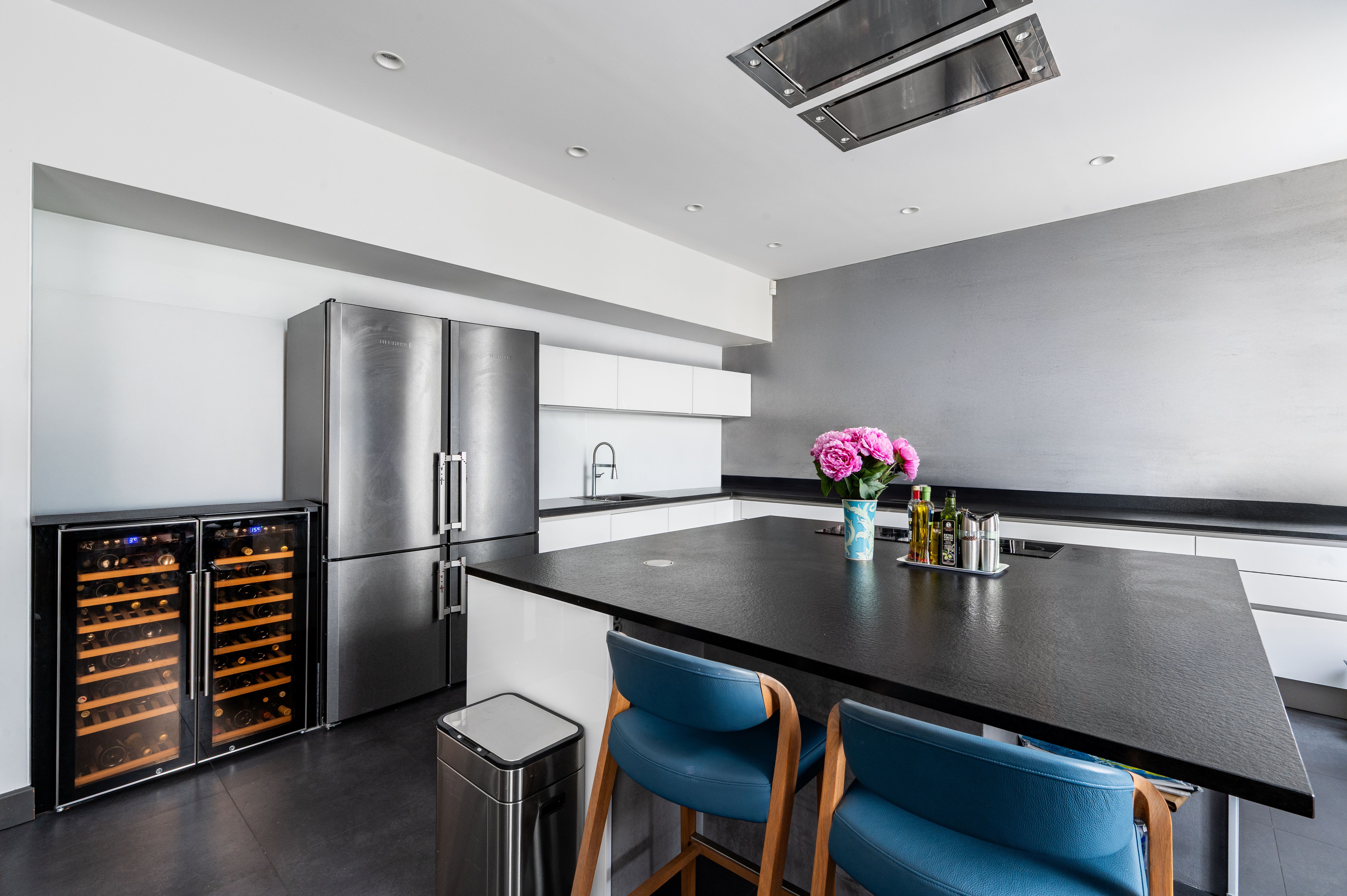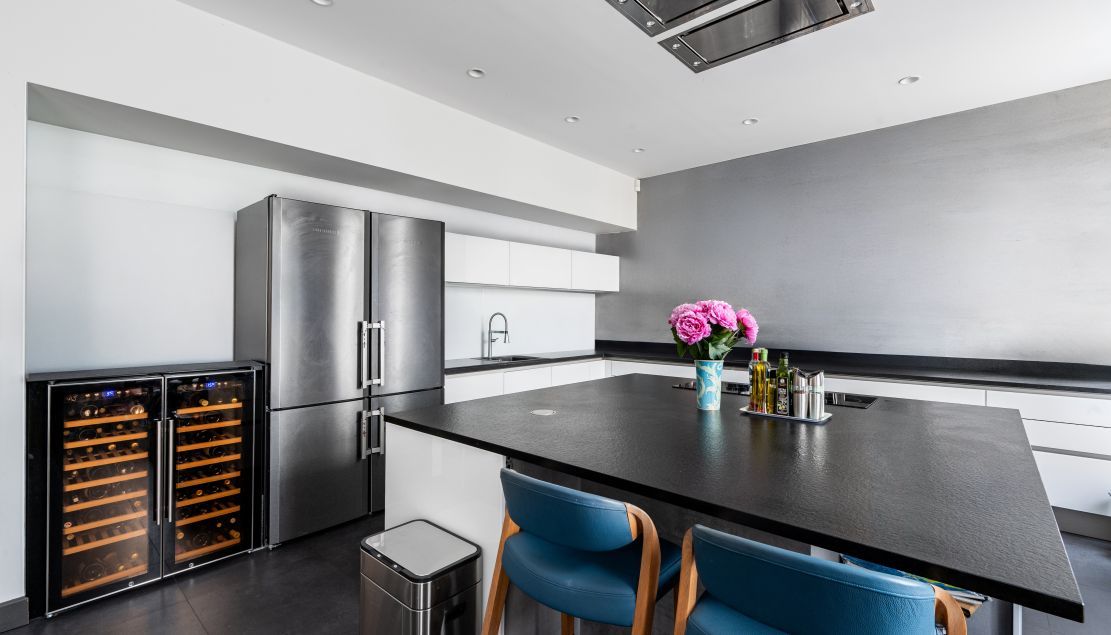 Kuchyňský kout je vybaven sklokeramickou deskou, troubou, lednicí, mrazákem, mikrovlnnou troubou a myčkou nádobí. Byt disponuje dvěma koupelnami - první se sprchovým koutem, toaletou, bidetem a saunou, druhá se sprchovým koutem, vanou a toaletou a samostatnou toaletou. K dispozici je také pračka a sušička. Podlahy tvoří kombinace plovoucí podlahy a dlažby.