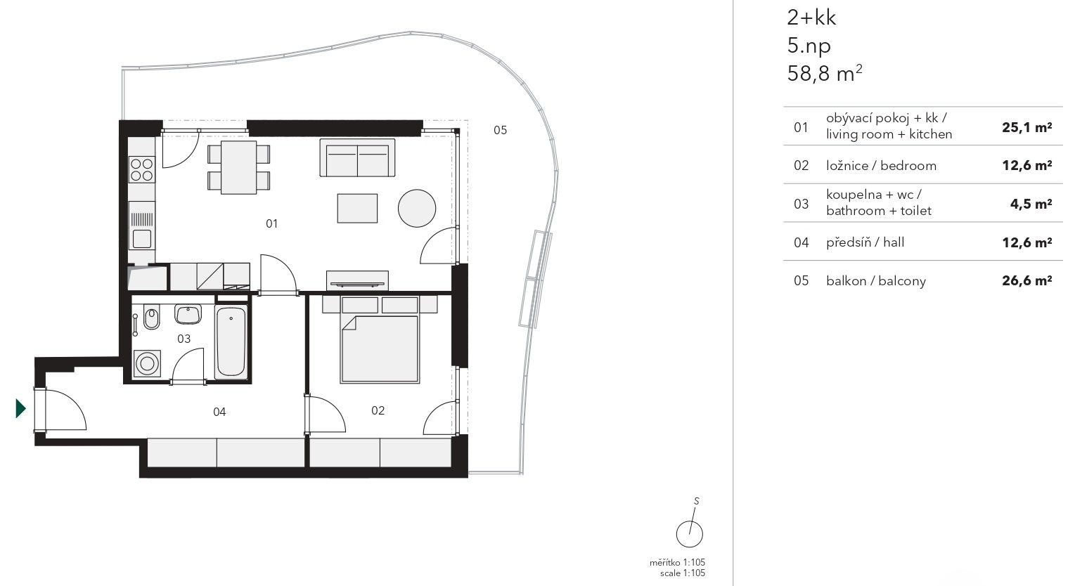 We offer a beautiful unfurnished one bedroom apartment for rent of 58,8 sqm with terrace (26,6 sqm), situated on the 4th floor of a house with elevator. The property is located in a beautiful area of Prague 5 - Stodulky having all civic amenities and good transport infrastructure (bus stop is a minute walk). There is the possibility of renting a garage parking space and a cellar for an additional fee of CZK 2,000 per month.