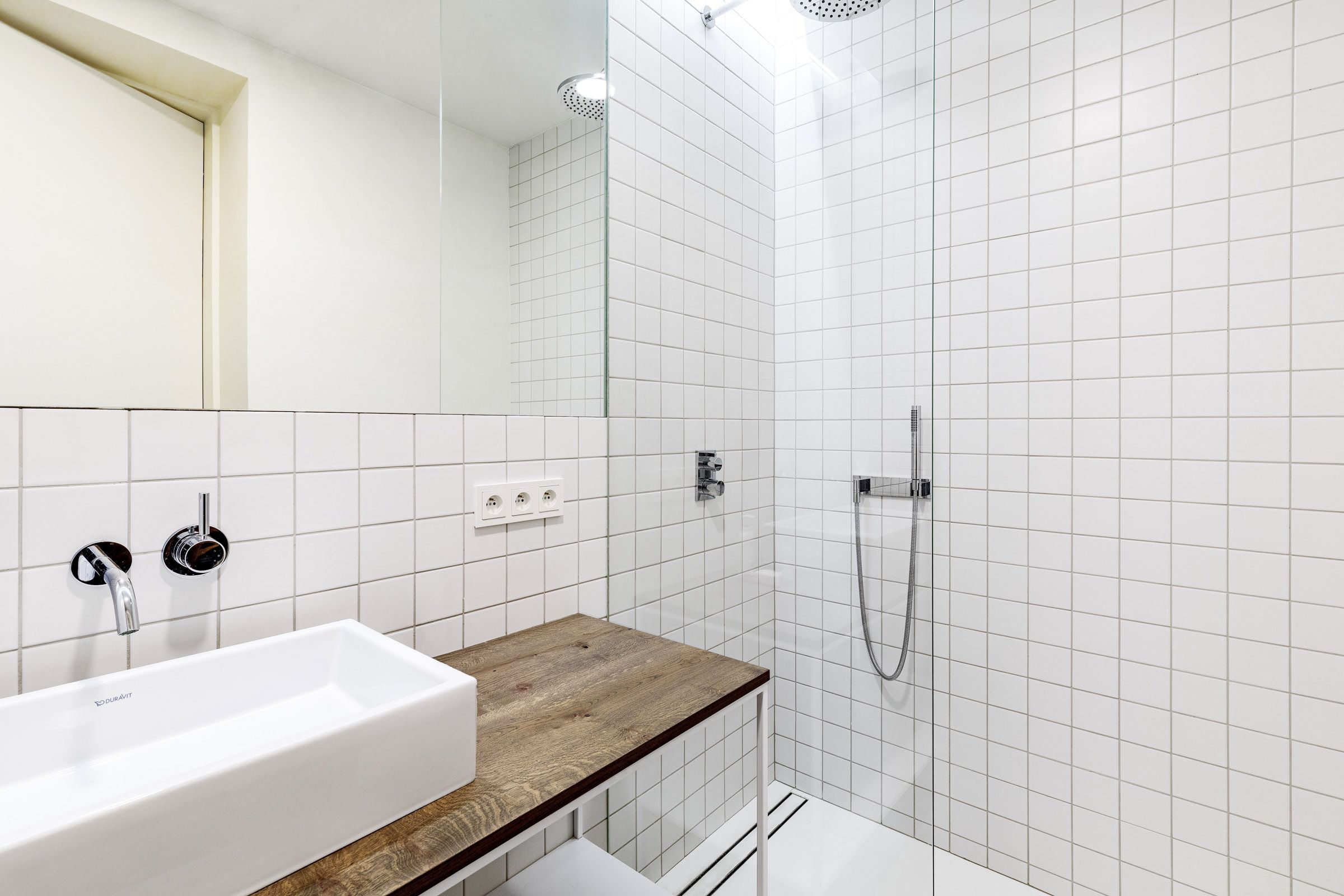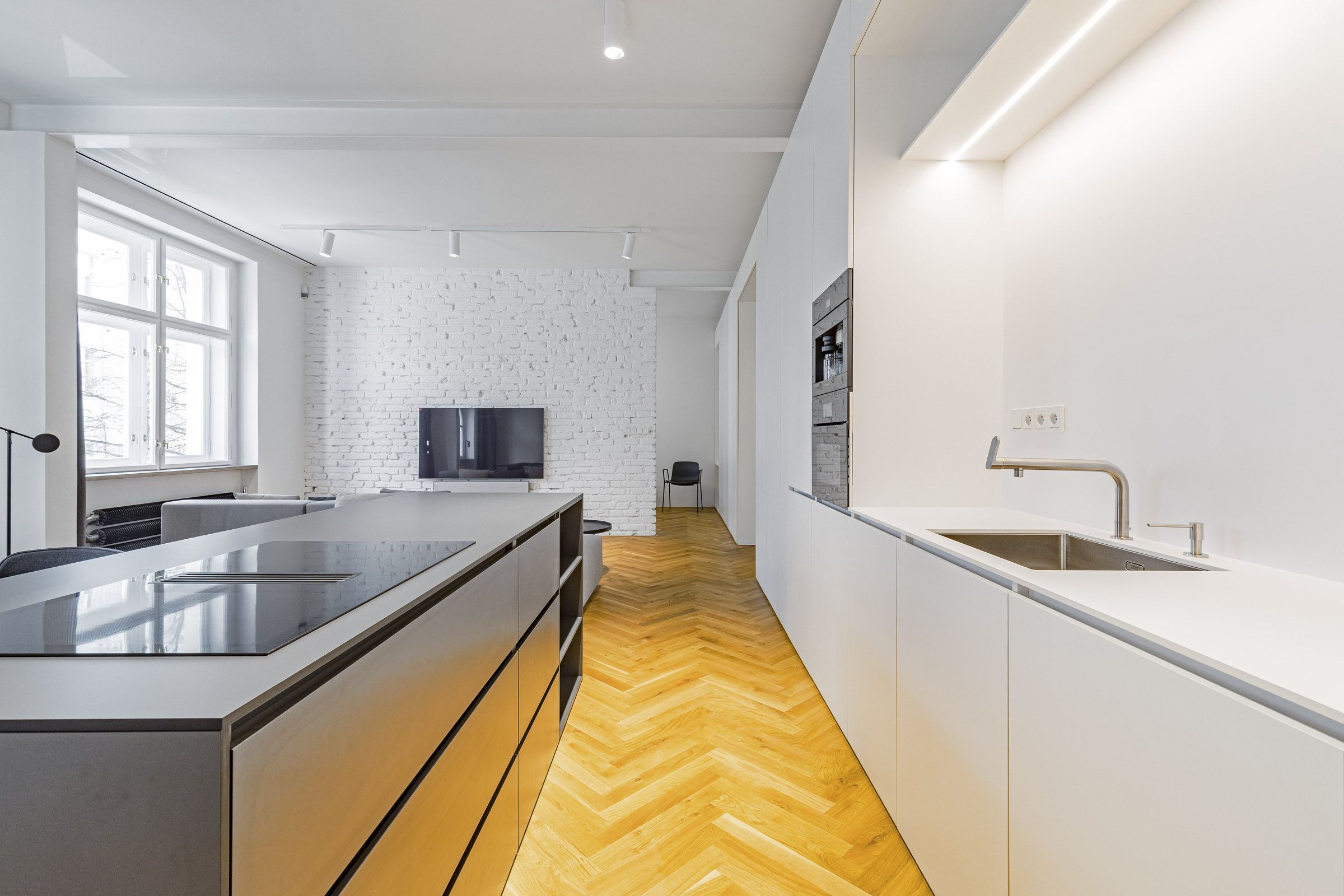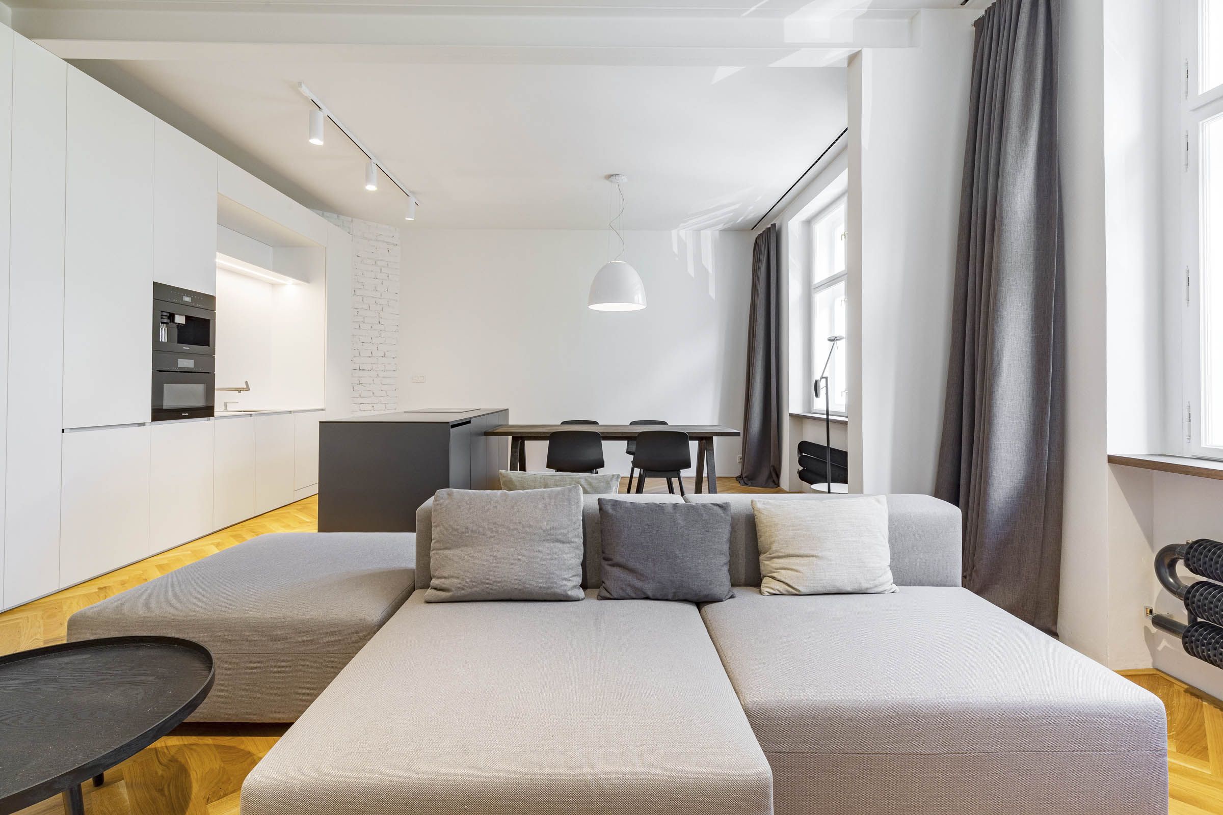 The kitchenette is luxuriously equipped with modern appliances of the highest standard from Miele – there is an induction hob, oven, microwave, fridge with freezer, dishwasher, and built-in coffee machine. The bathroom has an elegant walk-in shower, and the entrance hall has a built-in wardrobe with a shelving system and a combined washer-dryer. The bedroom is furnished with a built-in wardrobe and a double bed. The living room has a comfortable sofa and a TV. The entire apartment has high-quality parquet floors, air conditioning, and a security system.