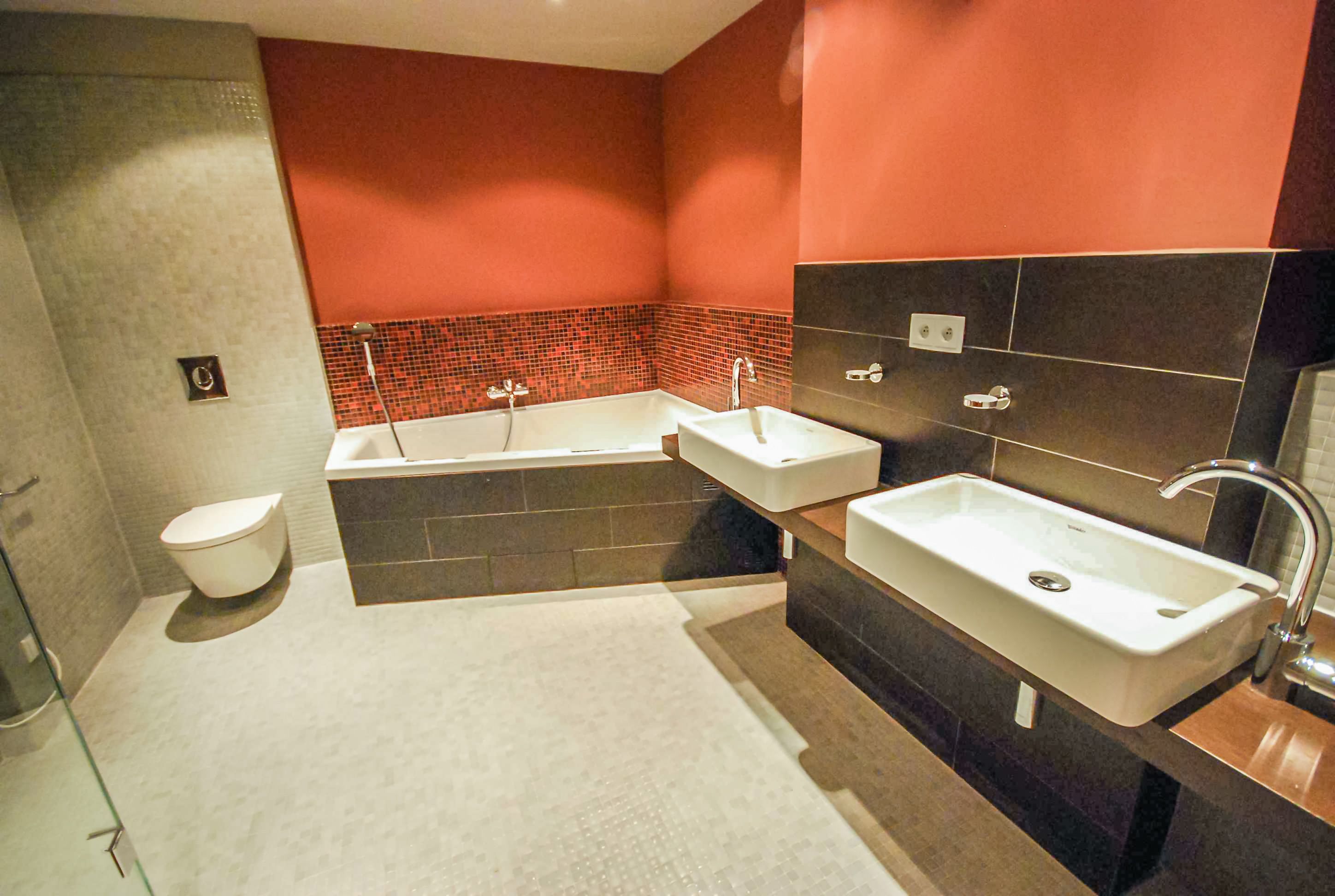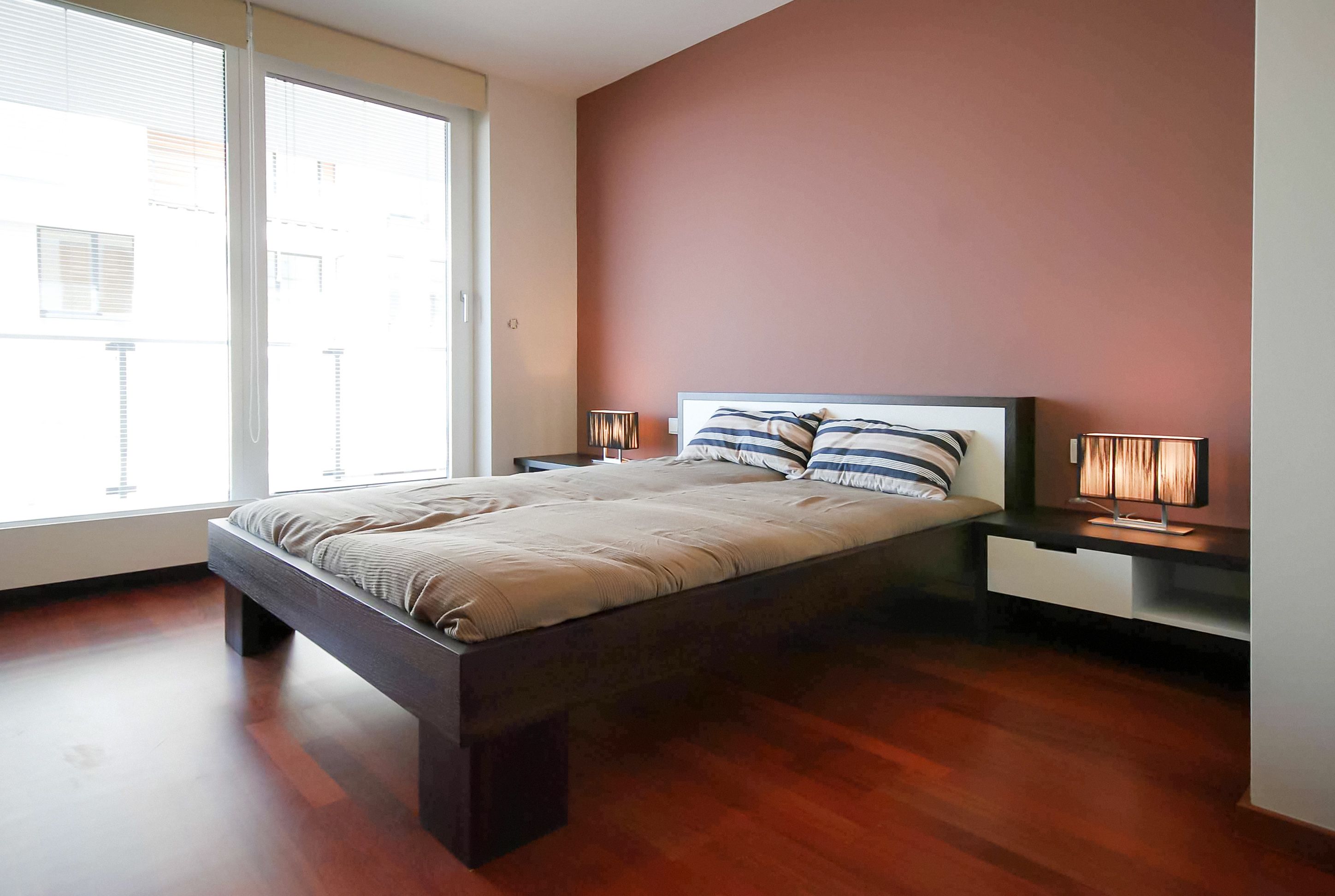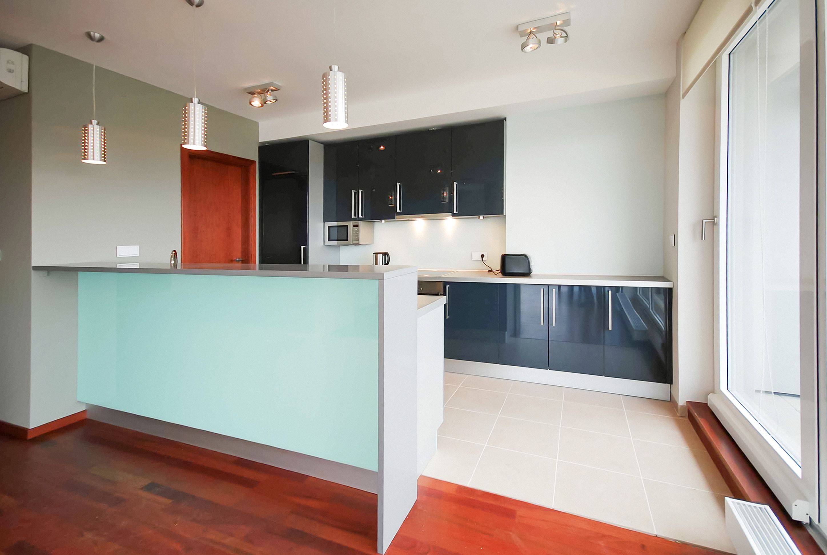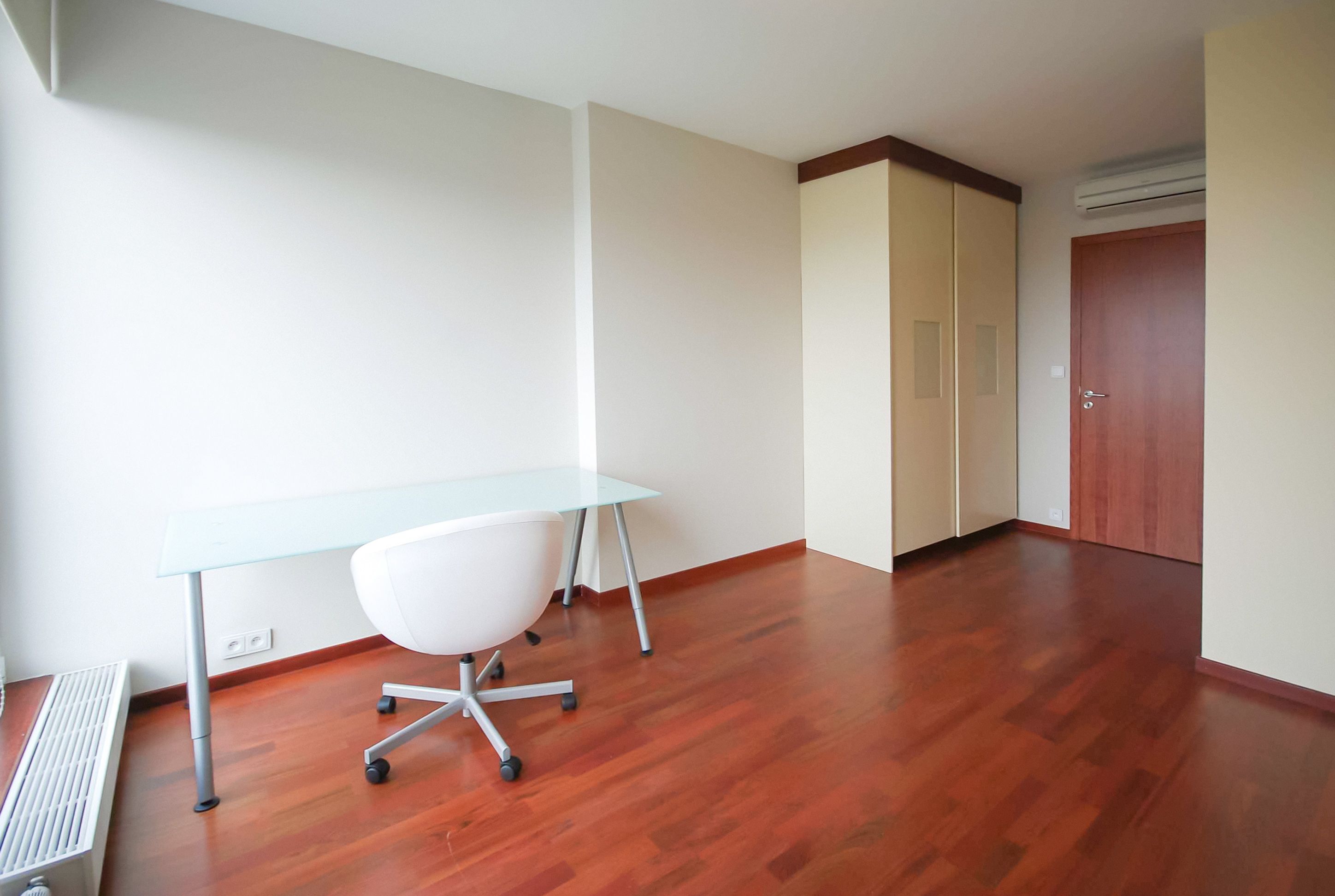 The kitchenette is fully equipped with a ceramic hob, oven, refrigerator, freezer, and dishwasher. The apartment has two bathrooms – one with a whirlpool tub, shower, and toilet, the other with a shower and toilet. Thanks to the large French windows, the apartment is very bright. The interior of the apartment is complemented by wooden floors, built-in wardrobes in all bedrooms, a washing machine, and a dryer.
