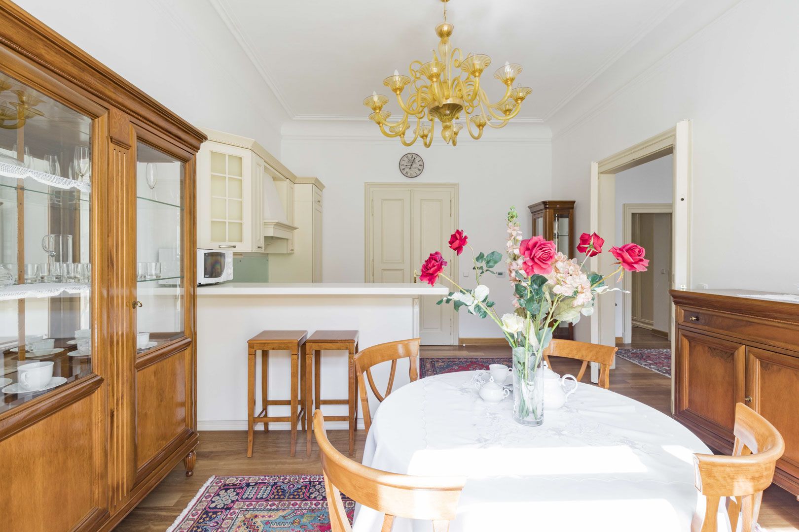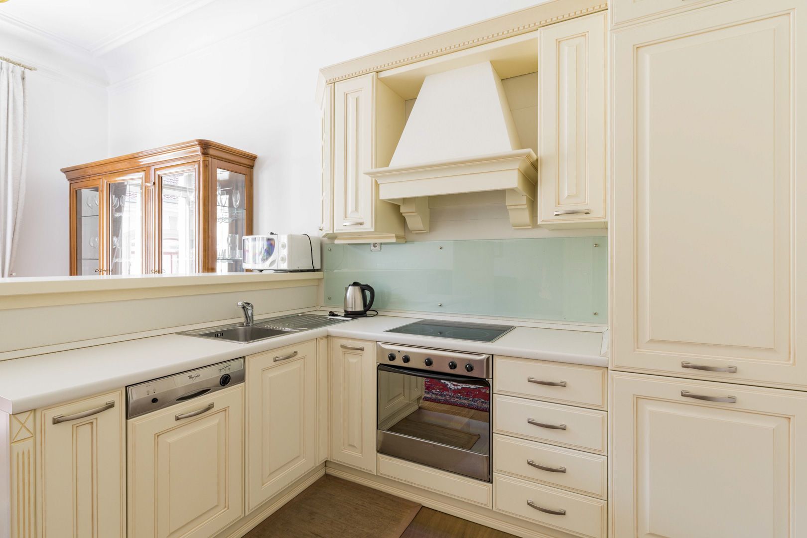 The apartment offers a fully equipped kitchen (ceramic hob, oven, dishwasher, refrigerator, freezer, microwave oven), bathroom with bathtub, toilet, and washing machine, living room and dining area with sofa and display cabinet, and bedroom with built-in wardrobes and bed.