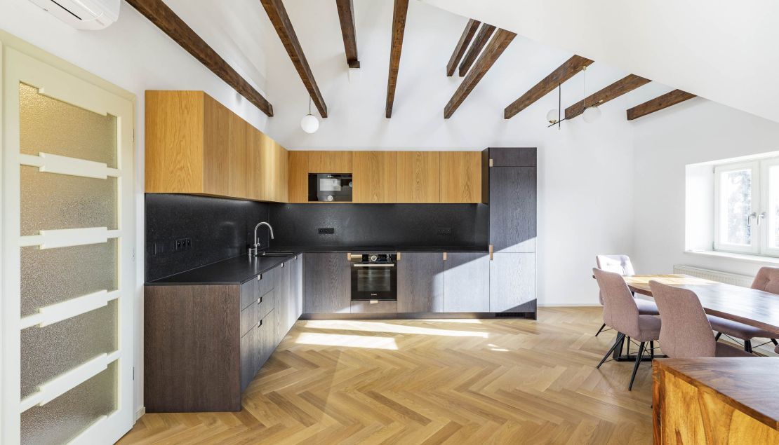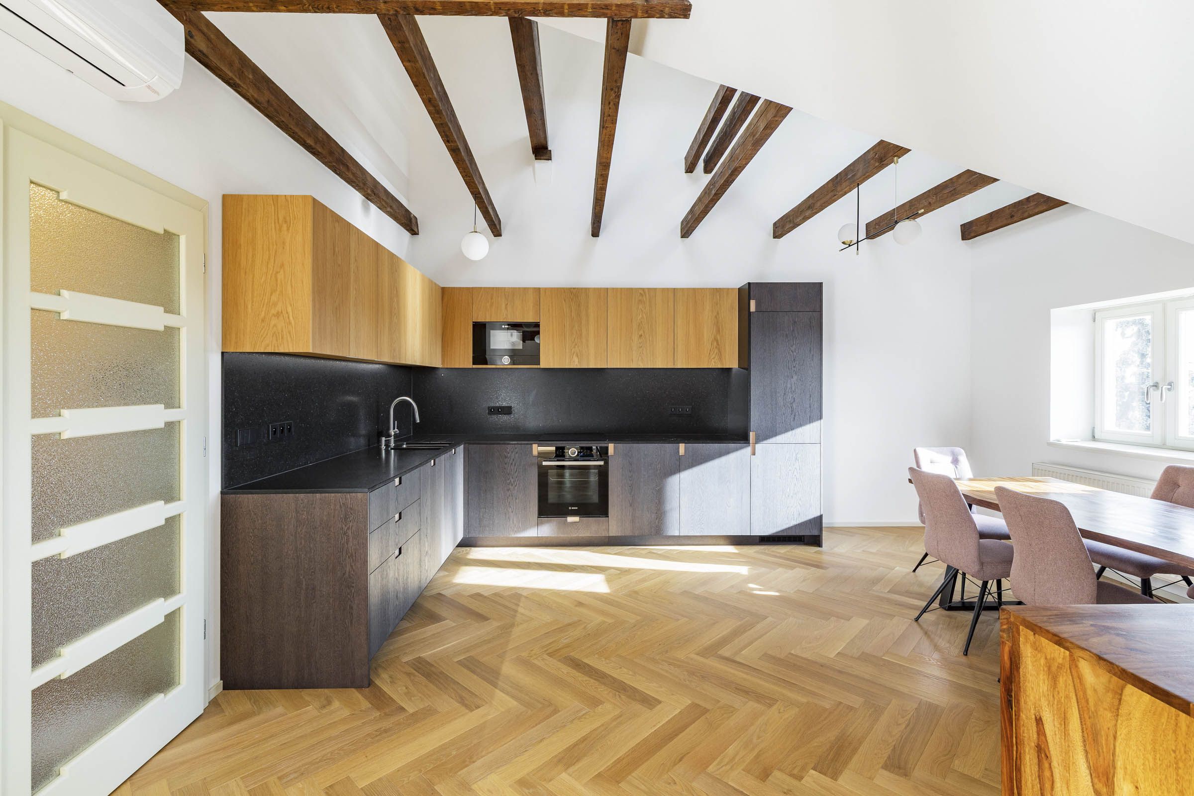 Kuchyňský kout je vybaven špičkovými spotřebiči značky BOSCH – indukční varnou deskou, troubou, mikrovlnnou troubou, lednicí s mrazákem i myčkou nádobí, na kuchyňskou část navazuje jídelní stůl se židlemi. Koupelna nabízí komfort v podobě vany, walk-in sprchy a dvojumyvadla, součástí vybavení je i pračka se sušičkou. Obě ložnice disponují vestavěnými skříněmi; jedna z nich je zařízena manželskou postelí, druhá umožňuje vlastní řešení uspořádání. V celém bytě jsou kvalitní parkety s podlahovým vytápěním a ve vstupní chodbě se nachází praktický vestavěný botník. Samozřejmostí je klimatizace i bezpečnostní systém, součástí vybavení také tepelné čerpadlo.