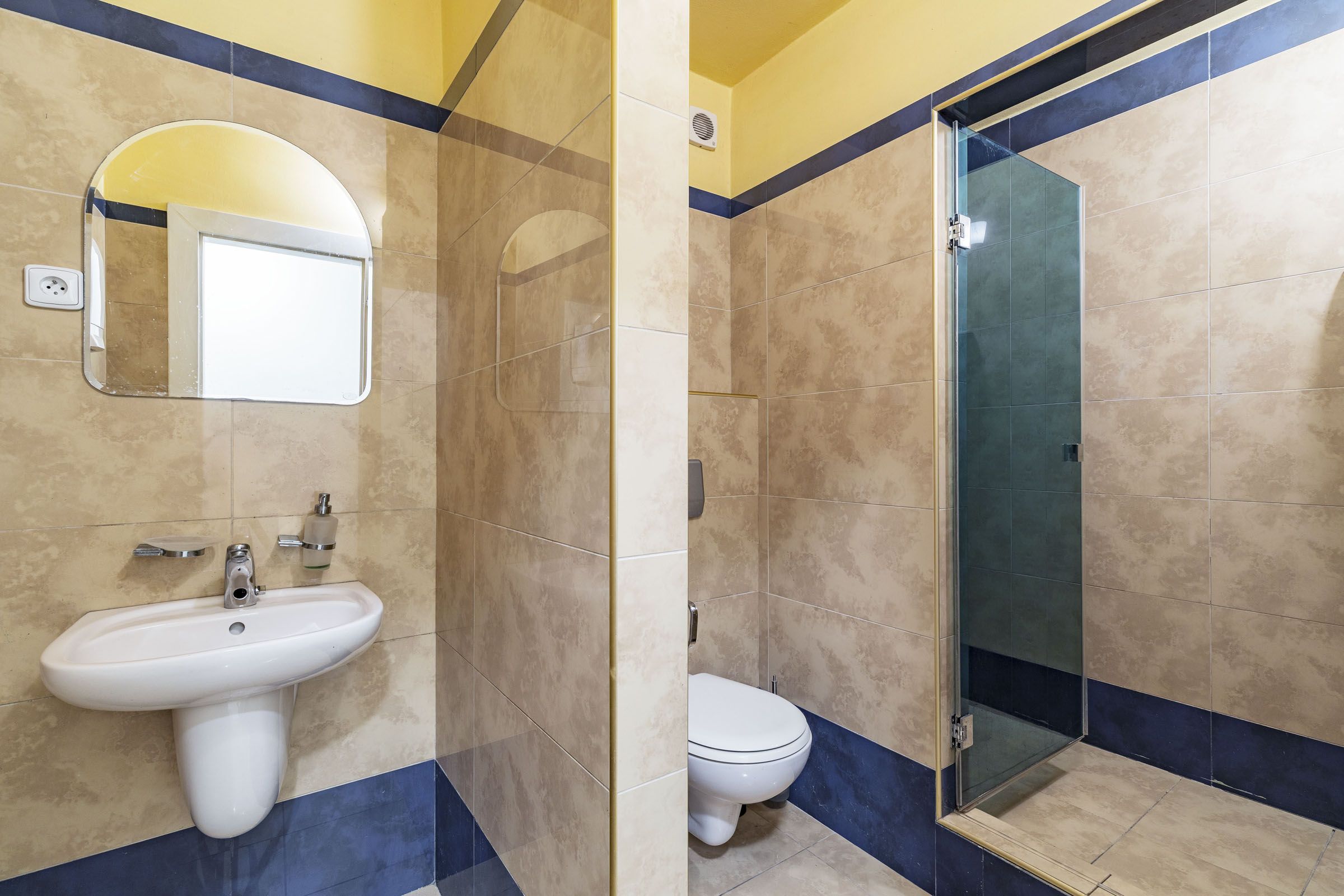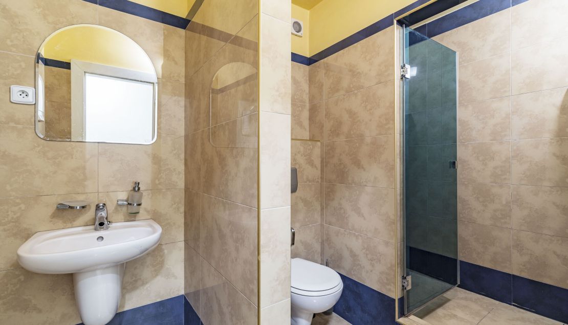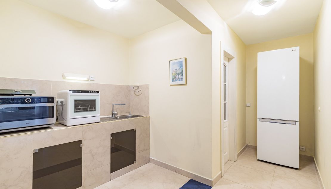 Kuchyňský kout je vybaven lednicí s mrazákem, kompaktní multifunkční stolní myčkou nádobí a mikrovlnnou troubou. V obývacím pokoji se nachází pohovka a úložná skříň. Koupelna je vybavena sprchovým koutem a toaletou.