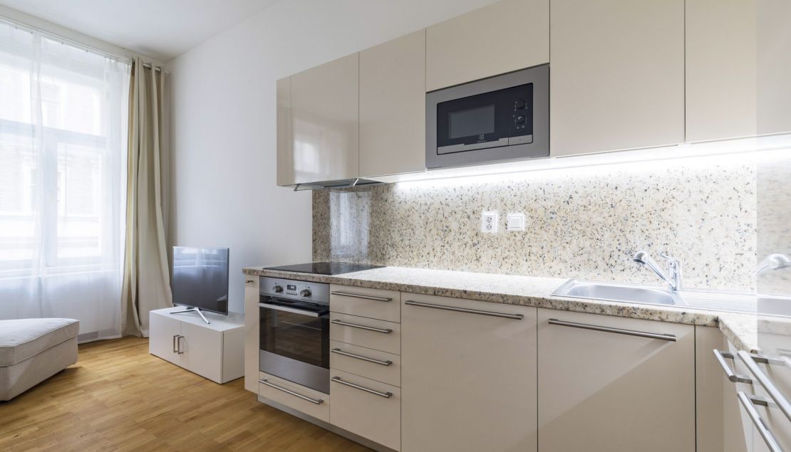 Byt je částečně zařízen moderním nábytkem na míru. Součástí vybavení je praktický kuchyňský kout, který zahrnuje sporák, troubu, lednici, mrazák a myčku nádobí. Koupelna je vybavena vanou, pračkou a sušičkou.