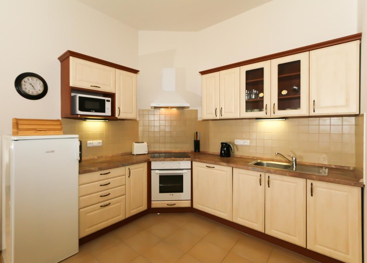 Byt je zařízený a jeho součástí jsou kuchyňské spotřebiče, televize, sedací souprava, jídelní set, komody a postel.