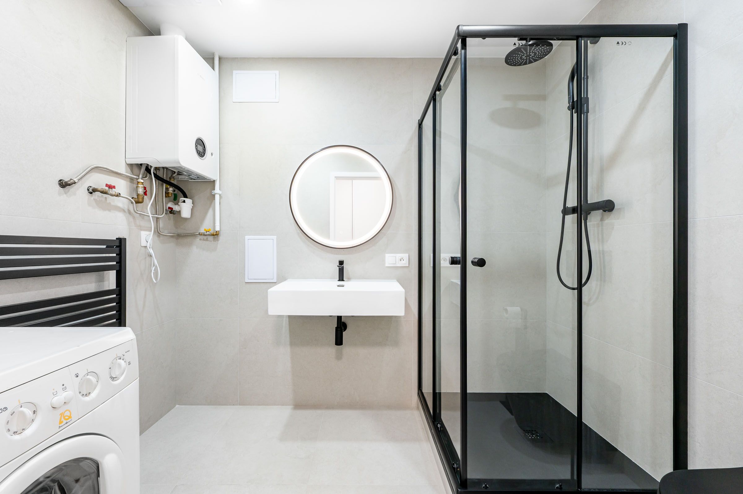 Kuchyňský kout je vybaven sklokeramickou deskou, troubou, lednicí, mrazákem a mikrovlnnou troubou, koupelna disponuje sprchovým koutem a pračkou.