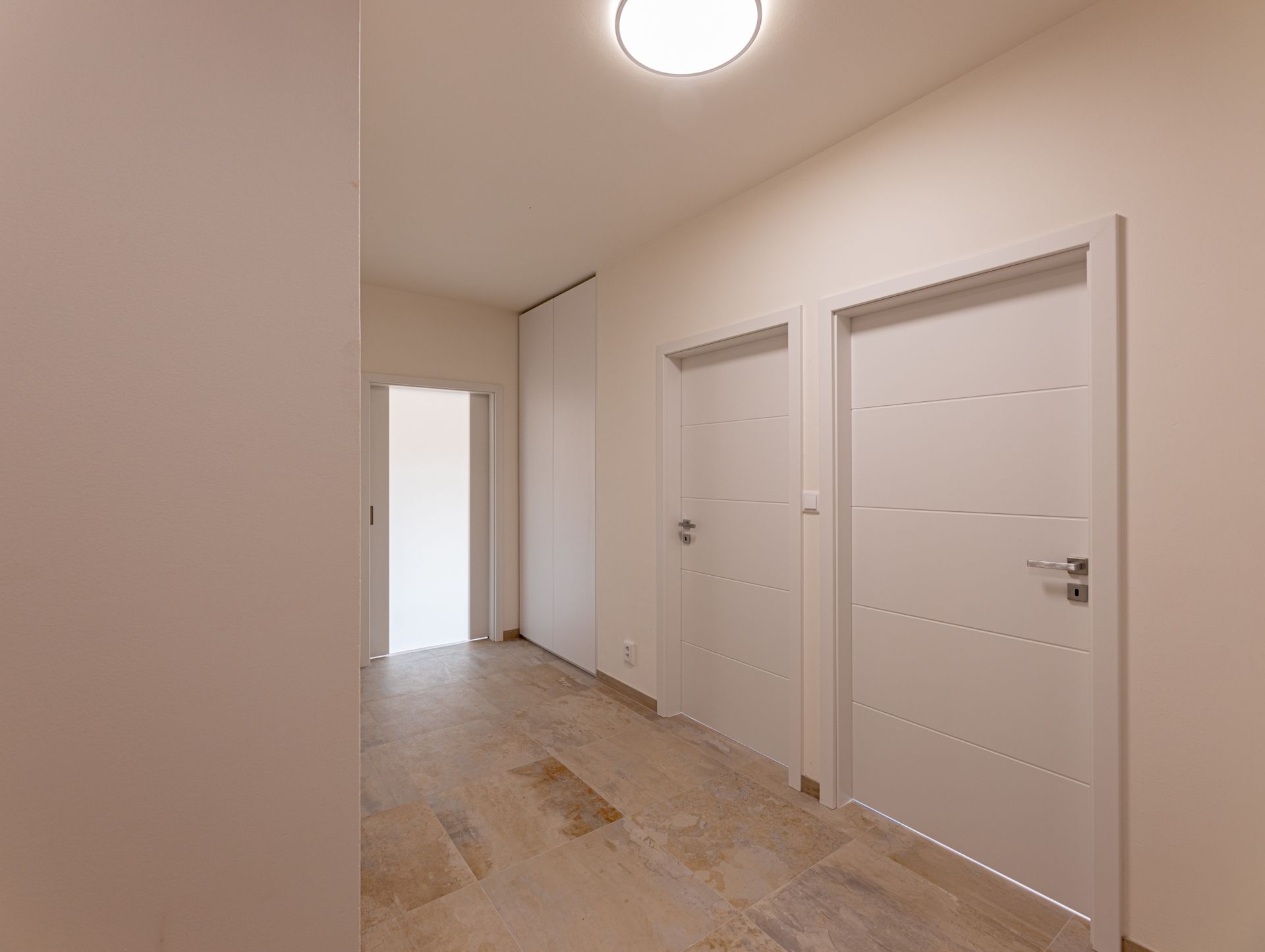 Interiér tvoří vstupní chodba, prostorný obývací pokoj s plně vybaveným kuchyňským koutem s přímým vstupem na terasu, 2 ložnice a koupelnu (vana a toaleta). K bytu náleží garážové stání a sklep.