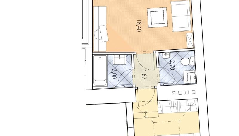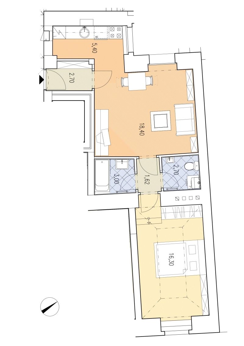 Tento světlý zařízený byt 2+kk k pronájmu dispozičně nabízí vstupní chodbu, prostorný obývací pokoj s plně vybaveným kuchyňským koutem včetně jídelního prostoru, ložnici a koupelnu s vanou.