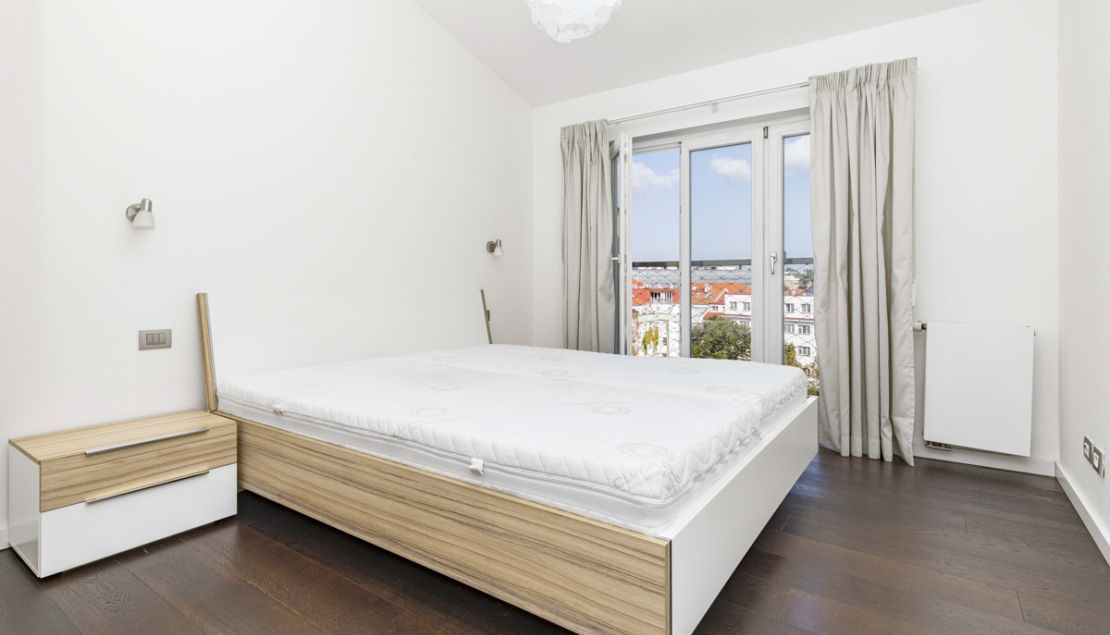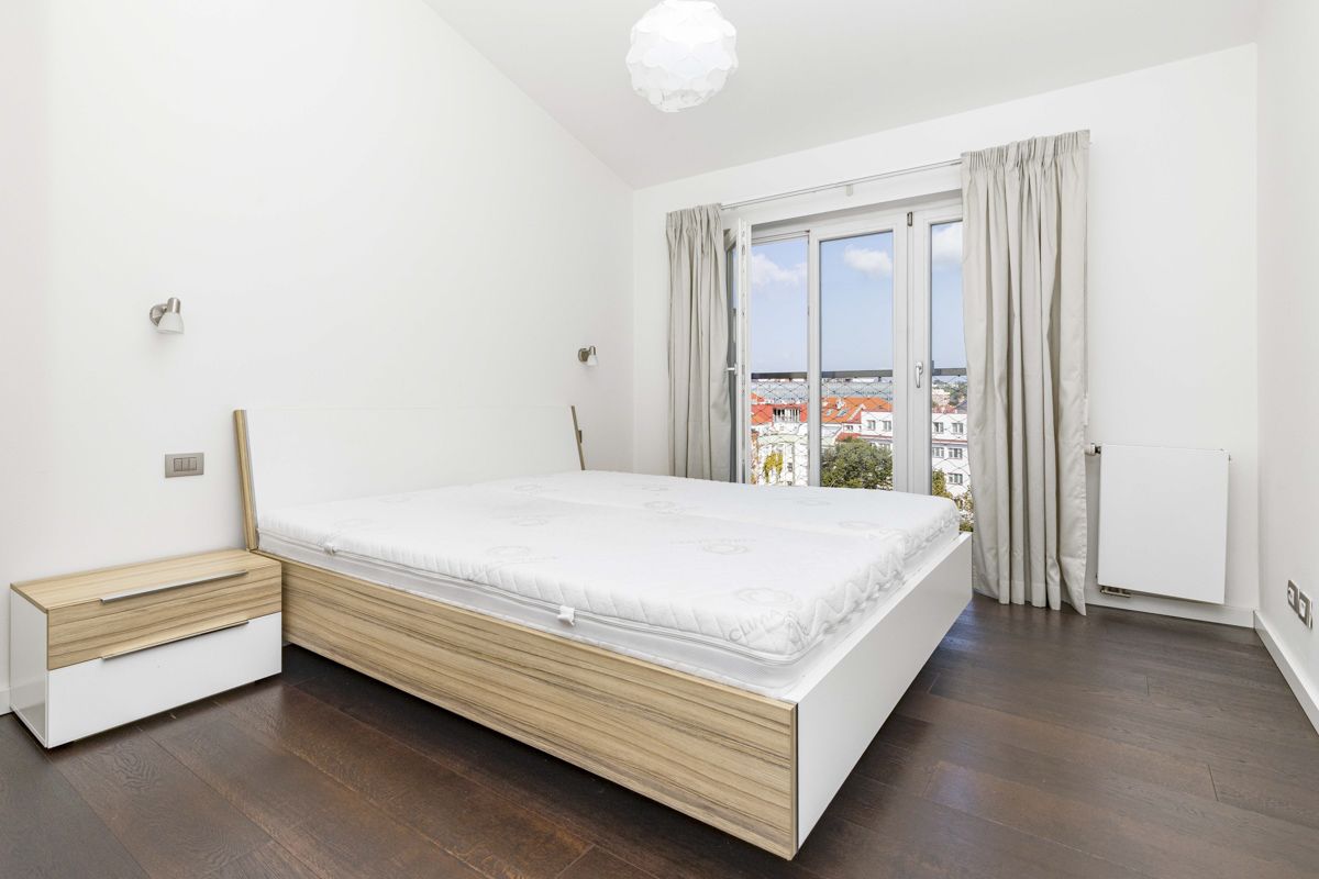 Tento světlý částečně zařízený mezonet 4+kk k pronájmu ve vstupním patře dispozičně nabízí vzdušný obývací pokoj s krbem, plně vybavenou kuchyň (sklokeramická deska, trouba, lednice, mrazák, parní trouba a myčka nádobí) s jídelním prostorem, spíží a vstupem na přilehlou terásku, šatnu, 2 samostatné ložnice, koupelnu s masážní vanou, sprchovým koutem, toaletou, bidetem a další terasou, technickou místnost s pračkou a sušičkou a samostatnou toaletu pro hosty. V horním patře se nachází prostorná ložnice, koupelna, jež je vybavena sprchovým koutem, bidetem a toaletou a komora. Součástí vybavení tohoto mezonetu je klimatizace v každé místnosti, podlahové topení, nespočet úložných prostor, stínící rolety. Možnost pronájmu parkovacího místa v nedalekém parking domě za měsíční poplatek 3 000 Kč. K bytu náleží 2 terasy orientované do největšího vnitrobloku v Praze a prostorný sklep o výměře 20 m2.