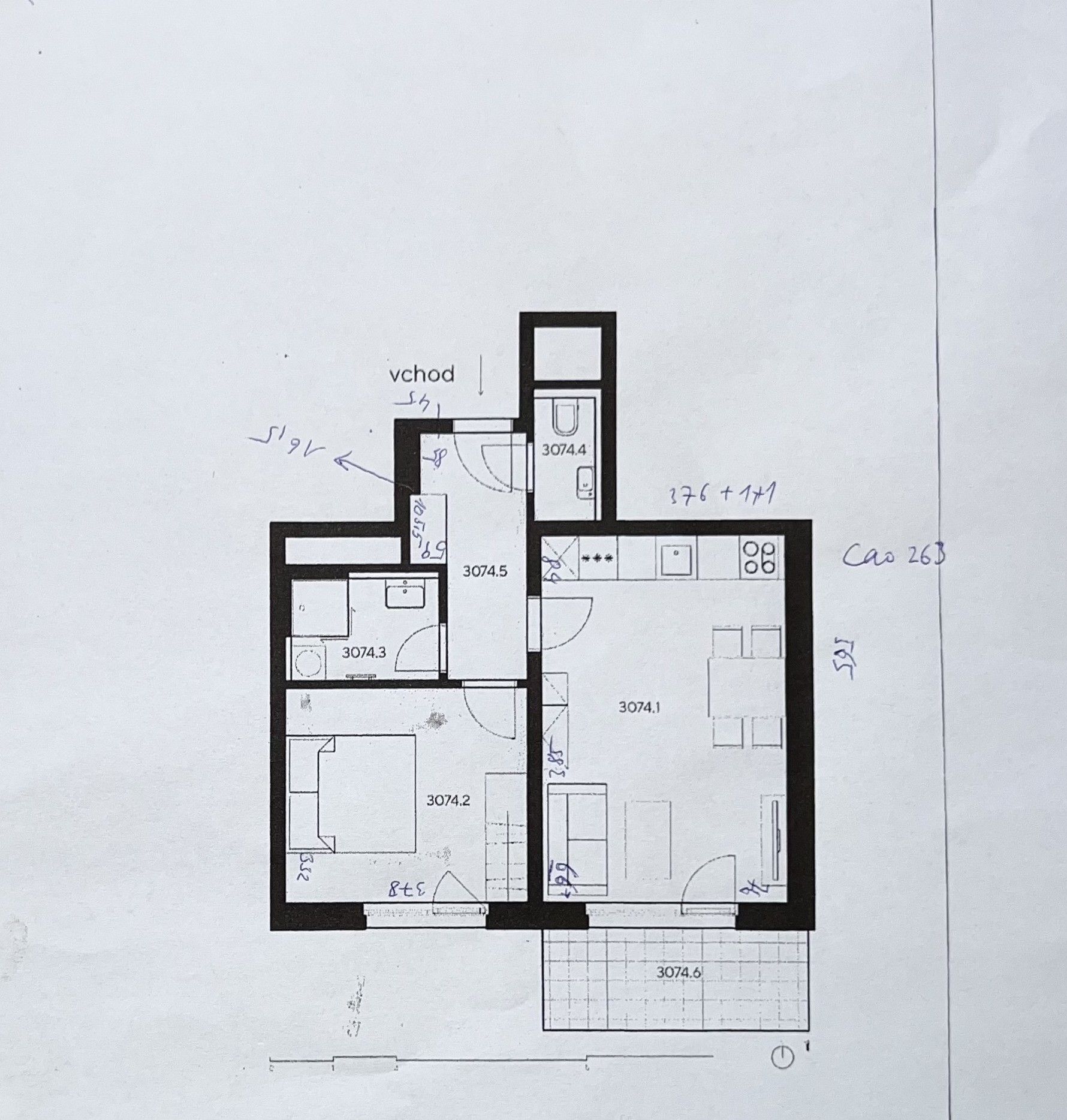 This apartment is offered unfurnished and has an entrance hall, a spacious living room with a fully equipped kitchenette (ceramic hob, oven, refrigerator, freezer, and dishwasher) with direct access to the balcony, a bedroom, a bathroom (shower), and a separate toilet. The apartment is also equipped with underfloor heating, electric outdoor blinds, and a Loxone smart home system. The apartment includes a cellar (9 sqm). Possibility to rent a garage parking space for an additional fee 2.000 CZK